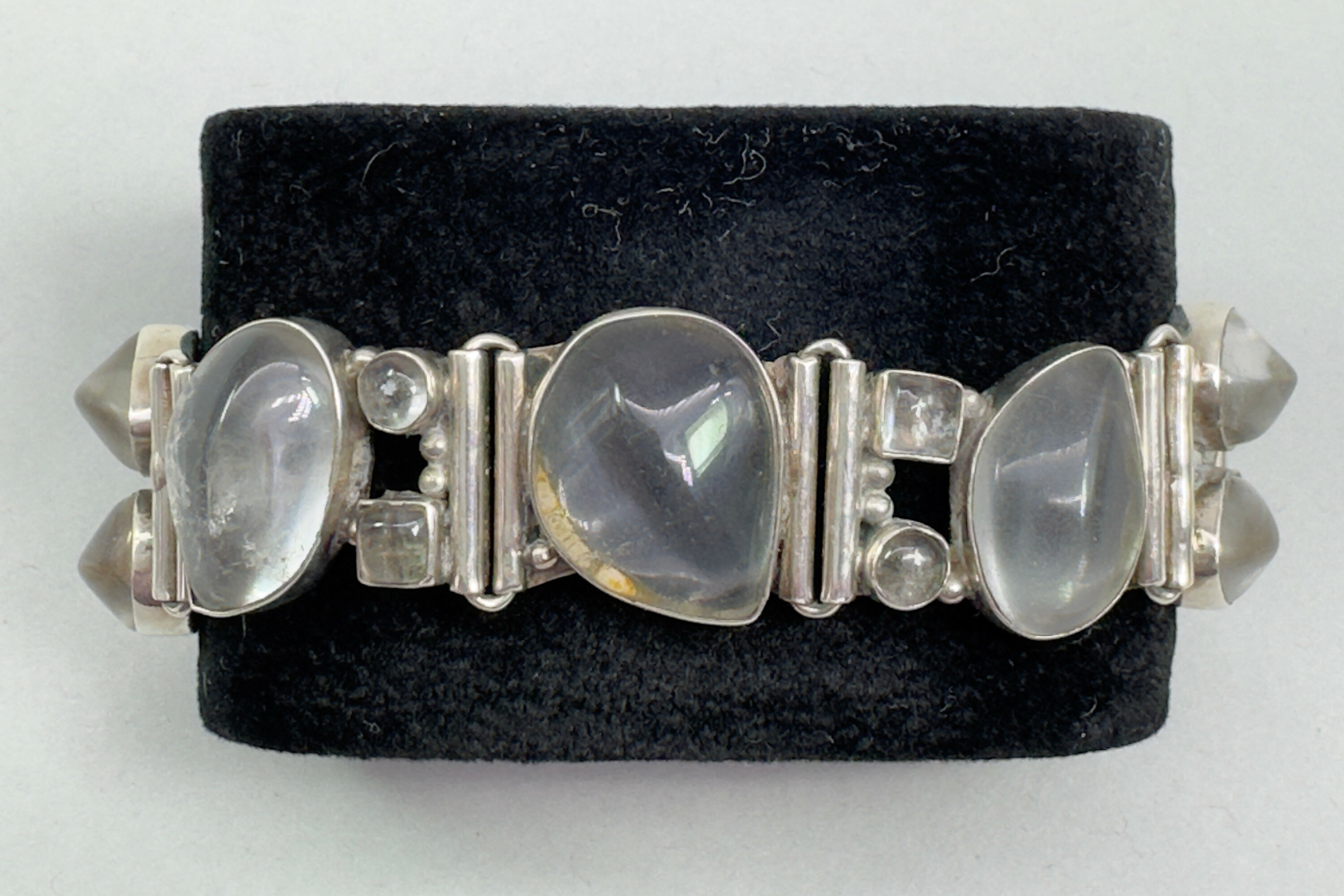 This is a very unusual bracelet comprising stations set with carved rock crystal stones. These are carved in a leaf form joined in a silver setting and joined with a simple hook clasp. The design has definitely a Scandinavian feel to it and the piece is marked 925.