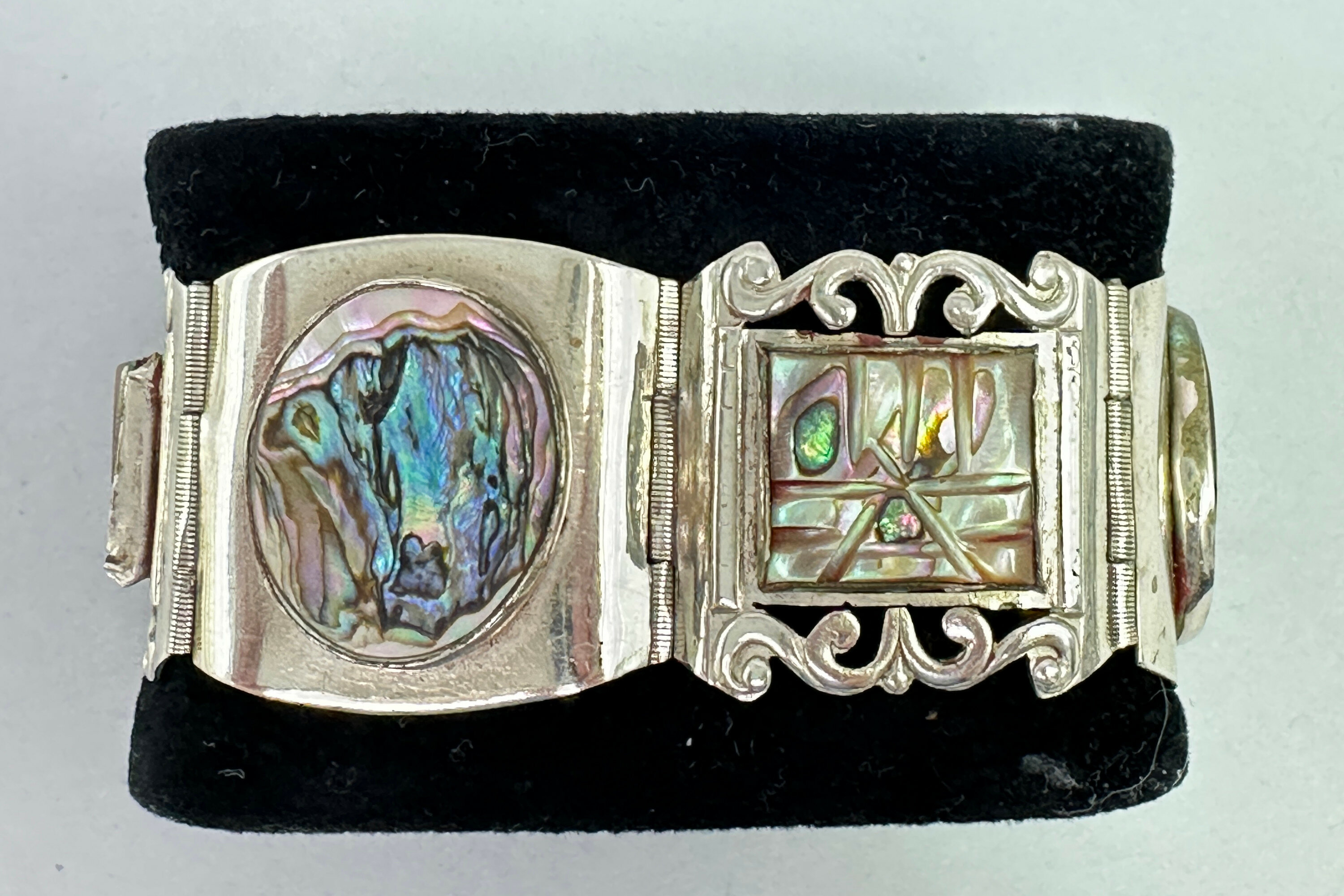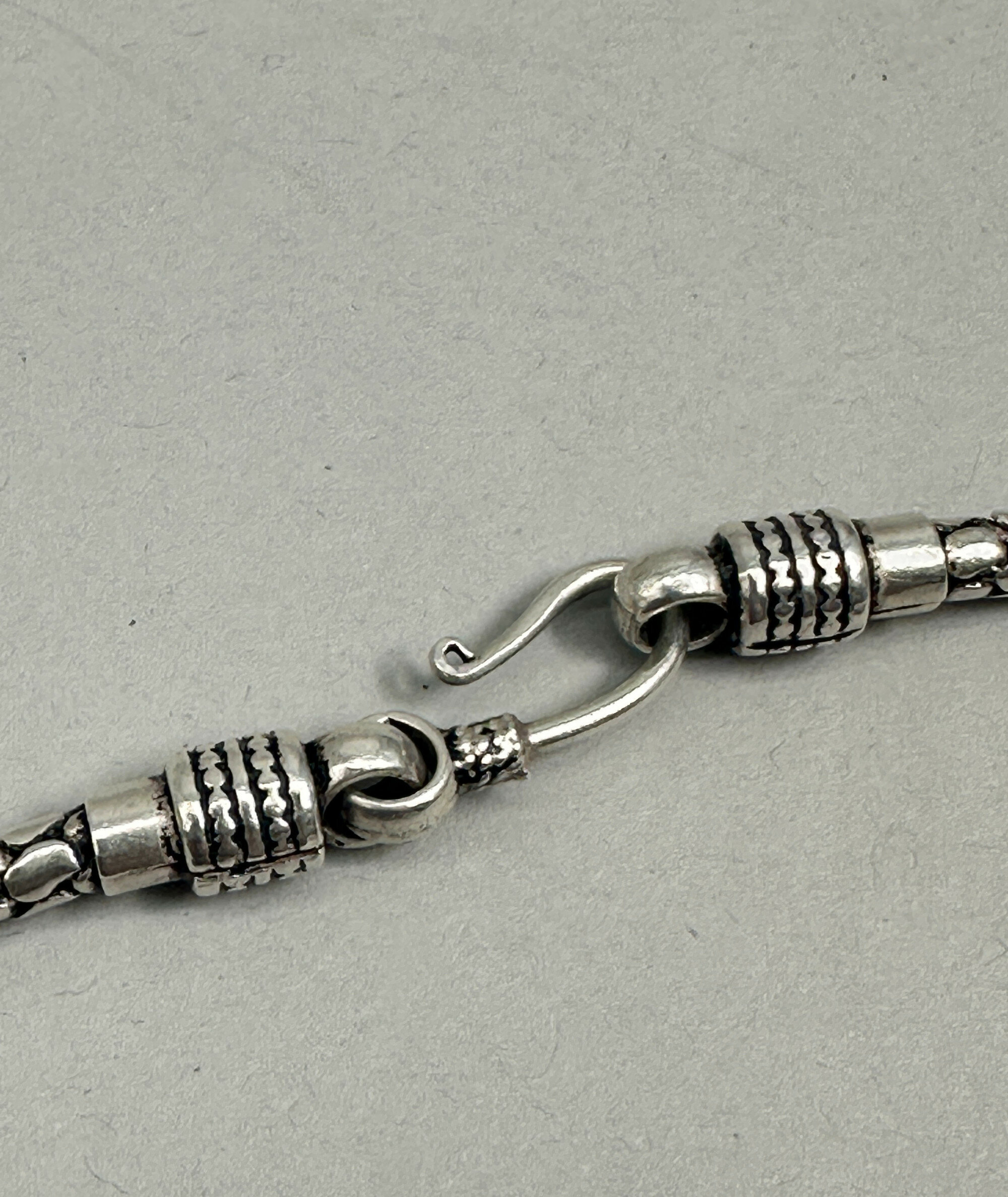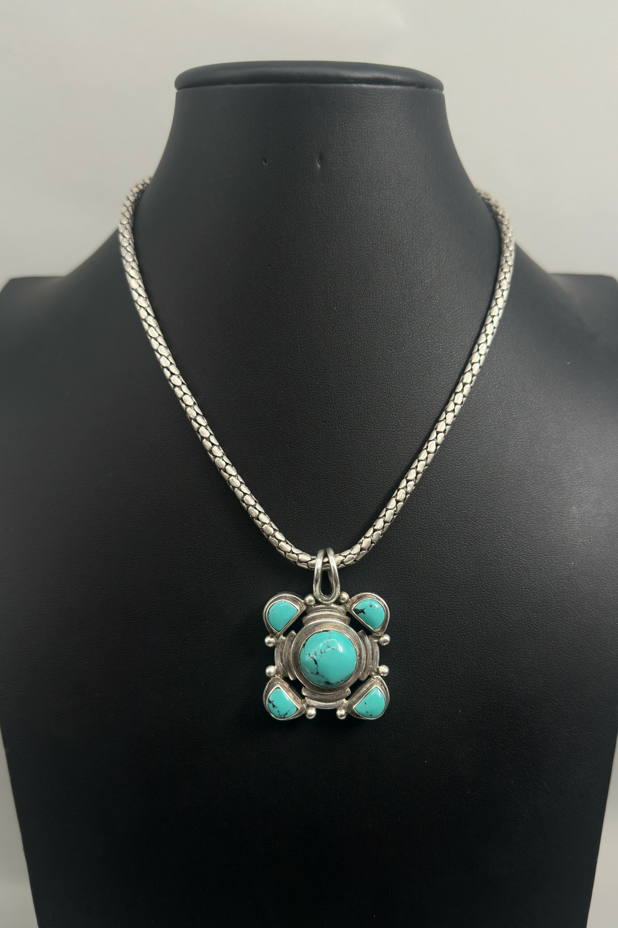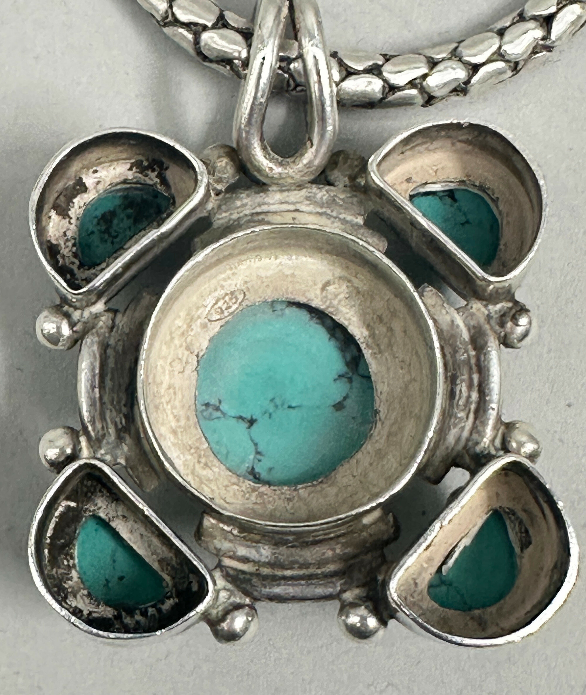 This is a very striking necklace comprising a large pendant with a modernist design set with North American turquoise, most likely from the Kingman mine. The pendant is marked 925 and has been later paired with a complementary and heavy Balinese chain which is unmarked.| Size: | Pendant measures 34mm x 34mm x 10 mm, Necklace is 3.8 mm thick and 45 cm long |