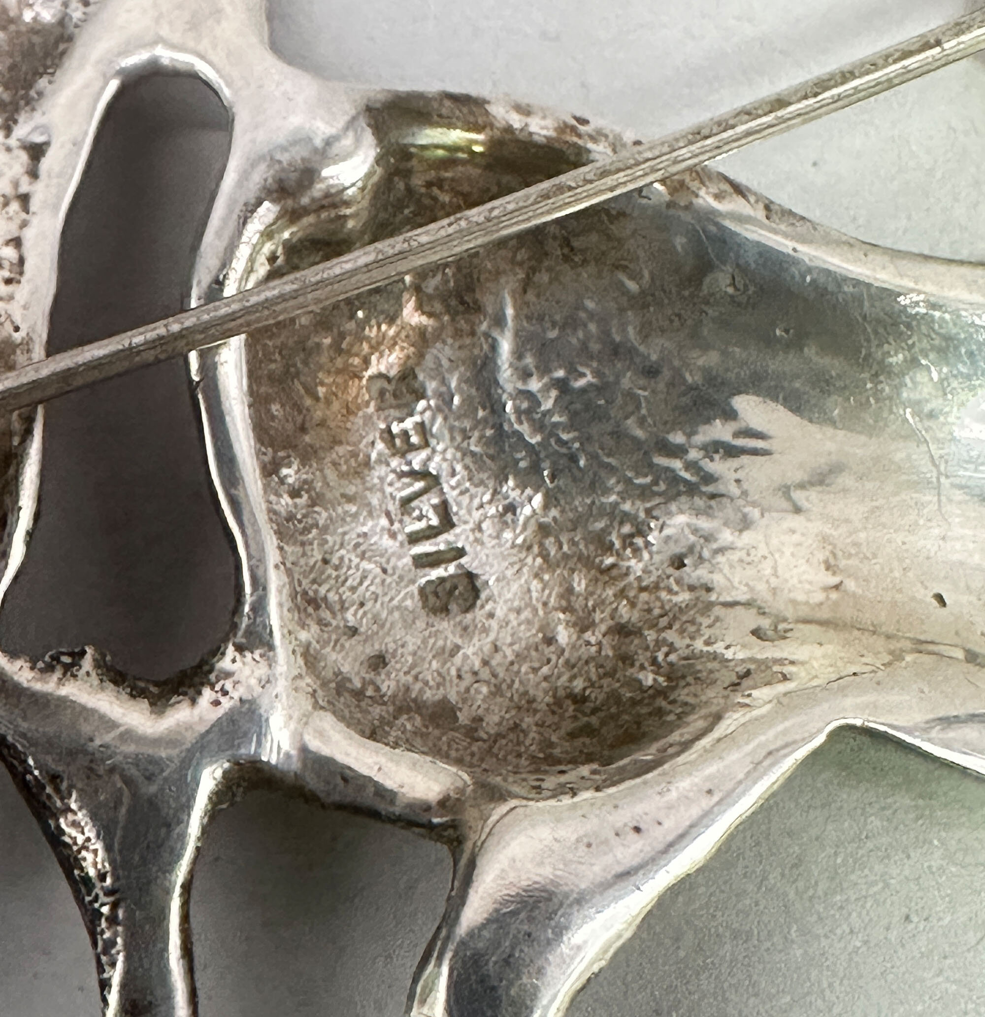 This brooch makes a real statement. It is a stylised image of a rearing horse and is marked silver.| Size: | 7.5 x 6 cm |