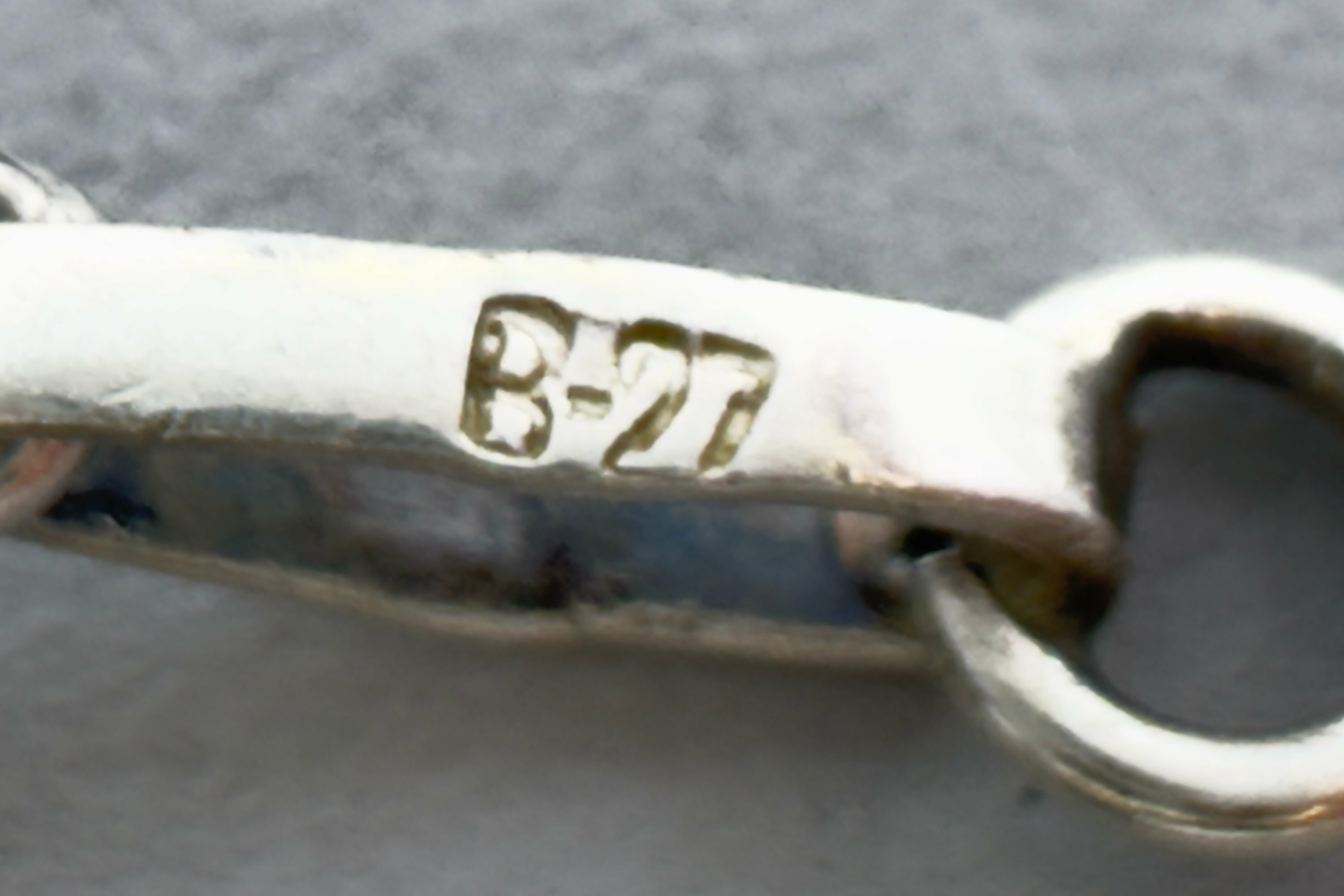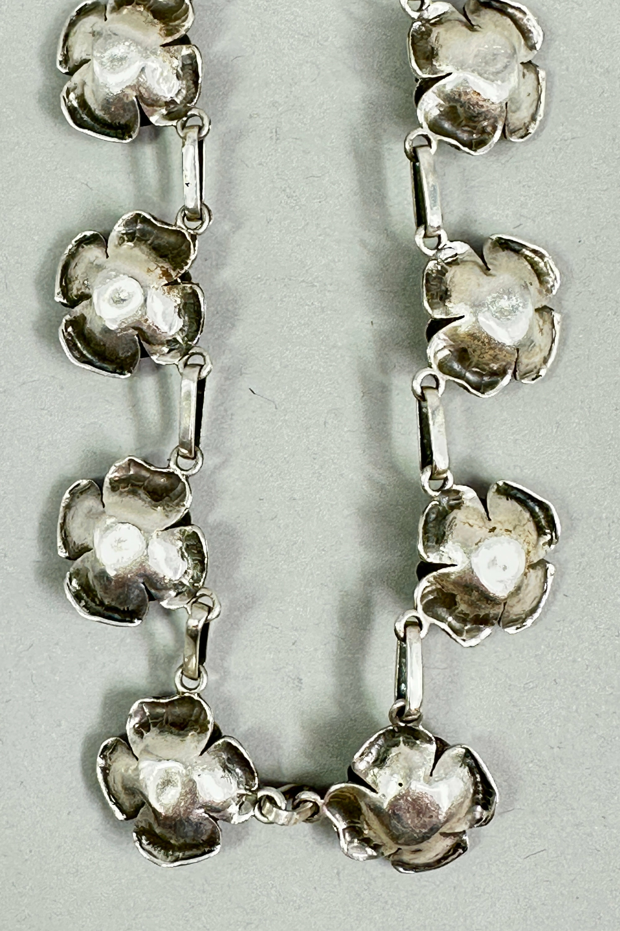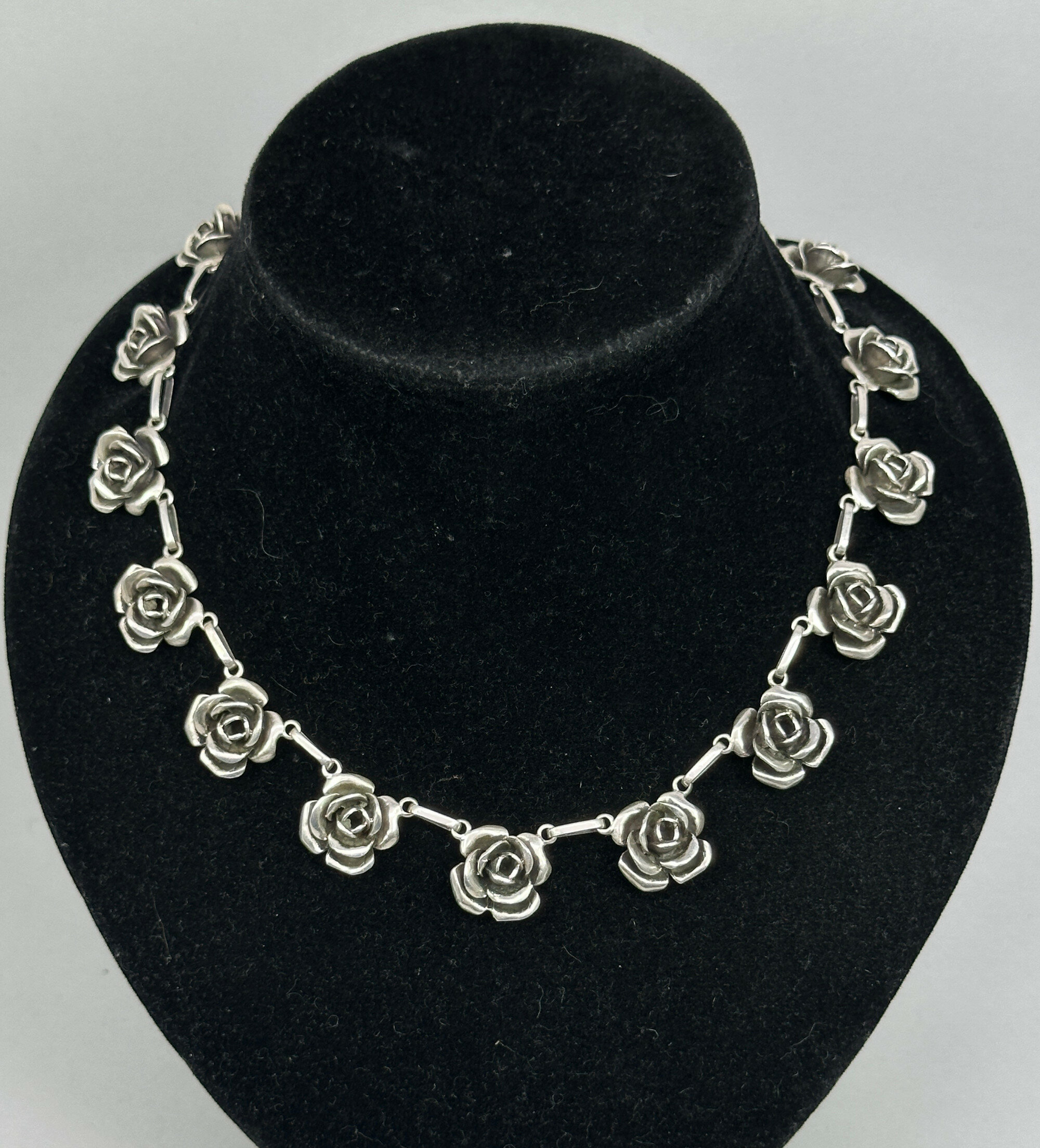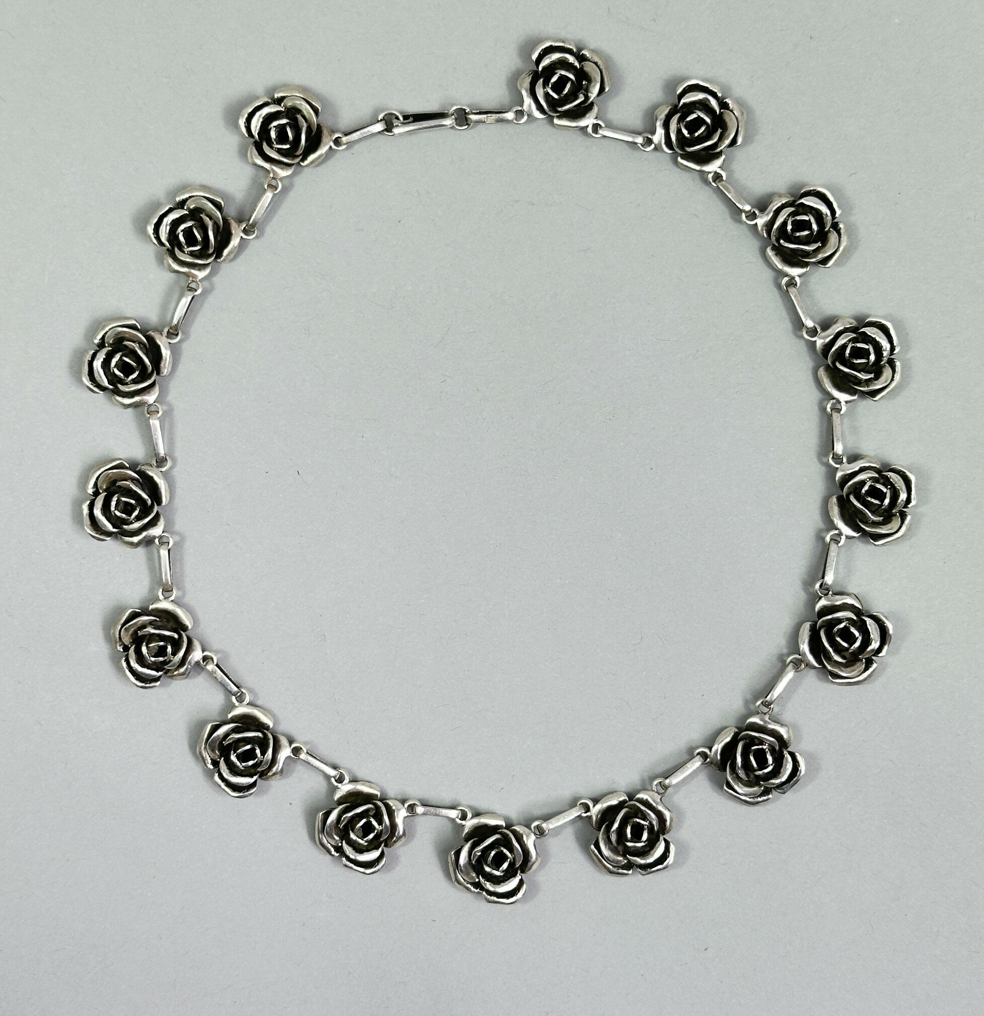 This is a beautiful necklace comprising stations of very finely modelled roses alternating with bar links that encircle the whole necklace and are joined with a hook clasp. It is marked 'B-27' (for the maker) and ' 925' and dates to the mid twentieth century.| Size: | Length : 41cm; the rose stations :13mm x 15mm |