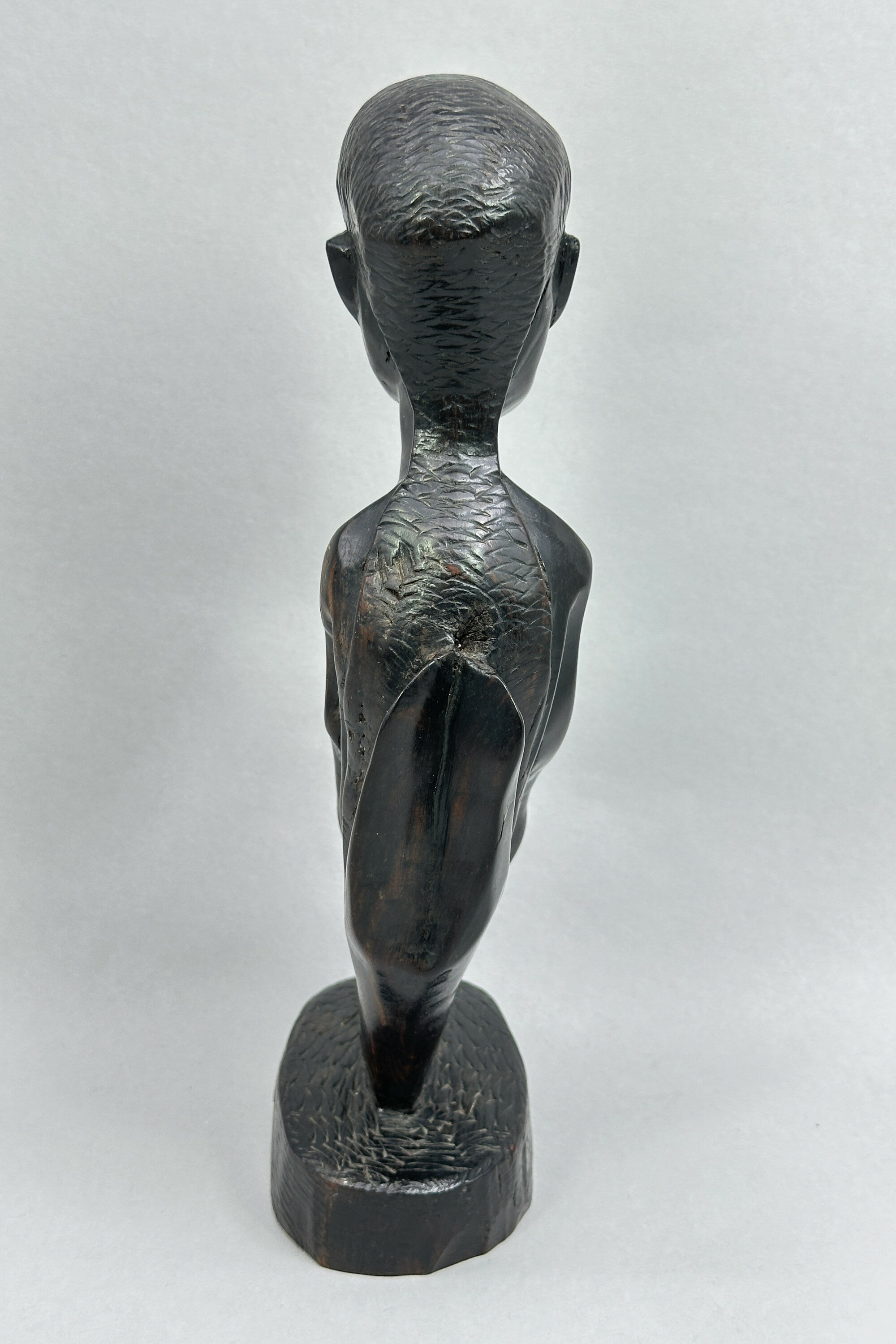 A carved wood figure of a lady in abstract expressionistic style represented kneeling with her legs presumably tucked up behind her, the body smooth and with detailing to the hair which flows down onto her back, the base in the form of a sketchily modelled rock. The colour and patina of the wood suggests ebony and the style seems African - Nigerian, in fact, if the label is to be believed, although the town indicated, Takarodi, seems to be located in Ghana. Dating, though, is probably as the label suggests and this was, no doubt, one of the many pieces made by local craftsmen as tourist souvenirs.| Size: | Ht 26cm (max); Width 10cm (max); Depth 6cm (max) |