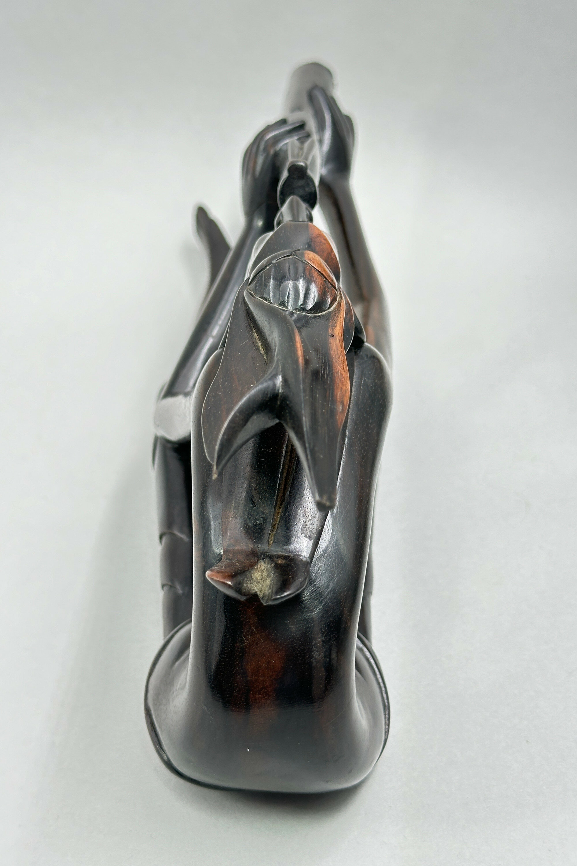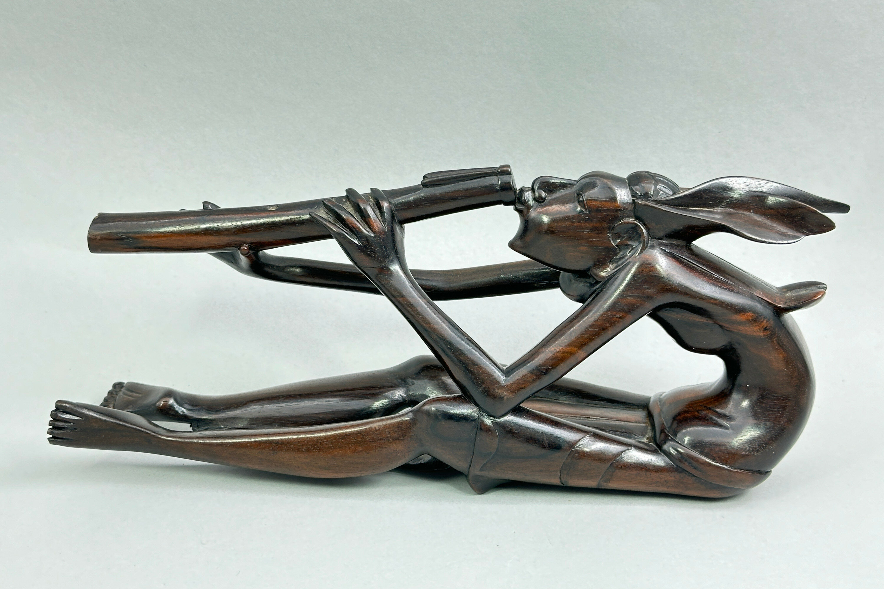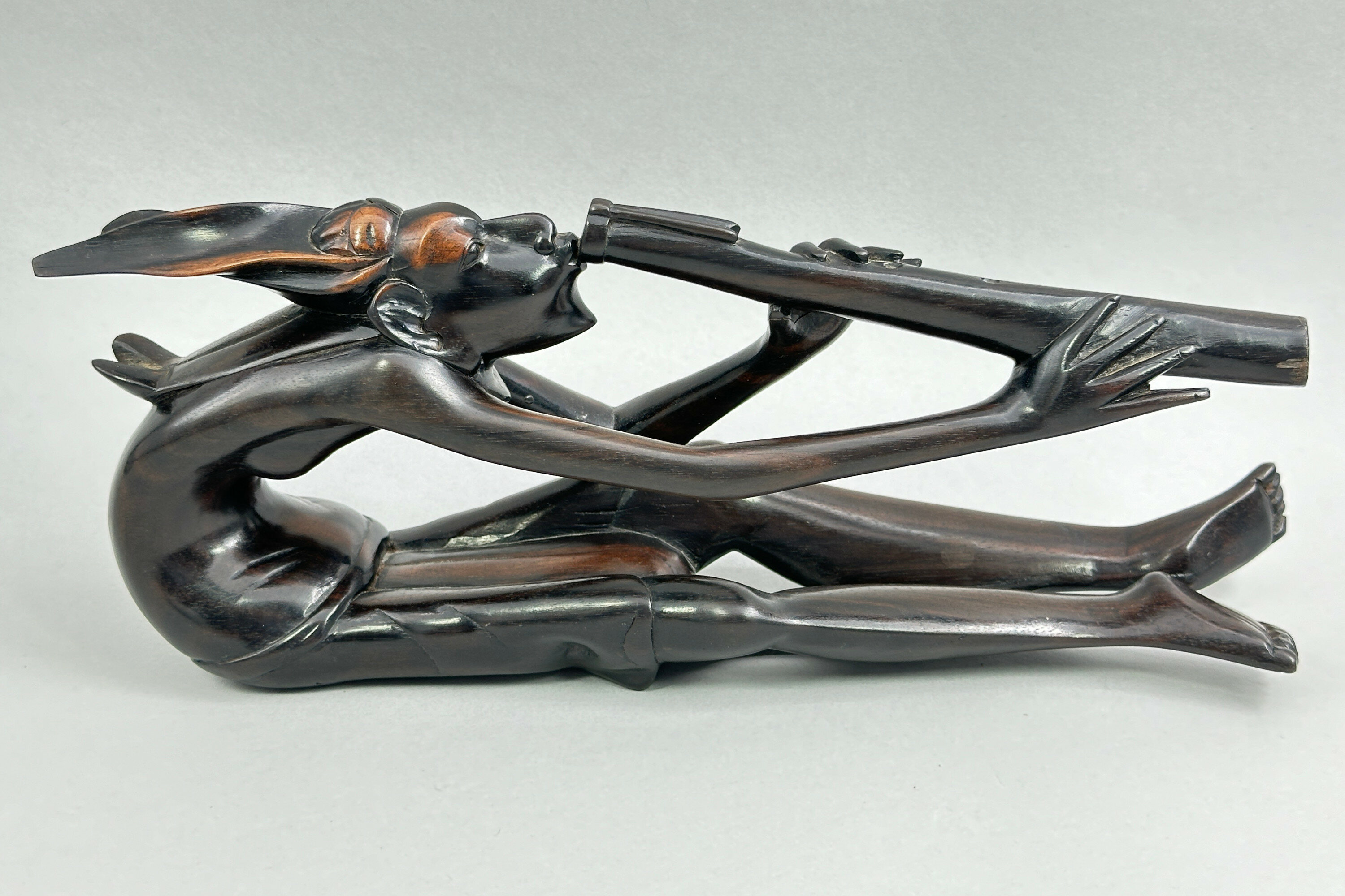 A rosewood figure of a seated musician playing a wind instrument, carved in a semi abstract style and with elongated proportions, the surface highly polished and showing in places the variegated patina of the wood. The style suggests African work similar to the pair of Makonde style figures also included in this sale but while similar pieces can be found there are no direct parallels. But the composition is striking and the quality of the wood enhances the carver’s skill. Dating to the second half of the C20th seems likely, perhaps to the 1960s.| Size: | 26.5 cm long |