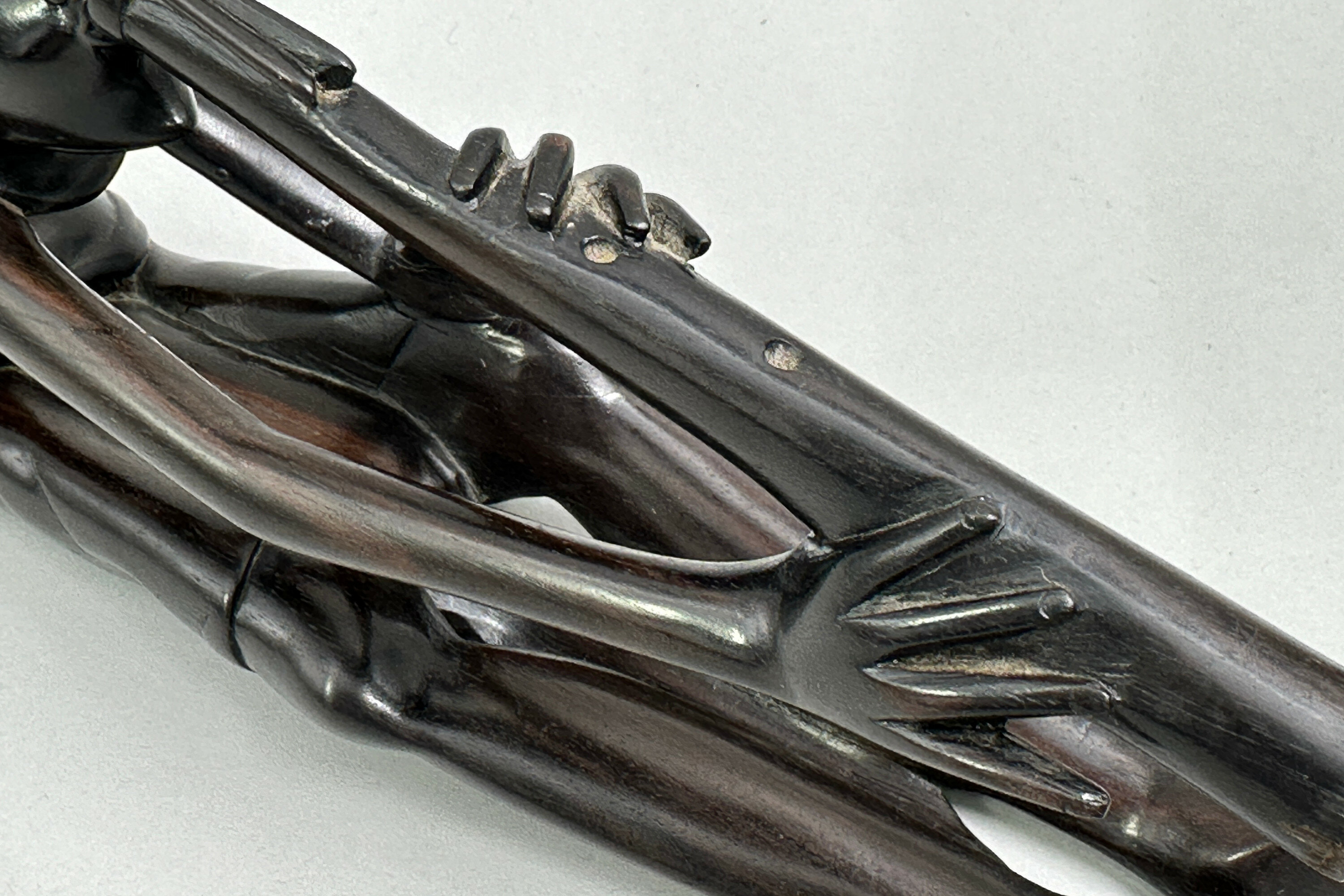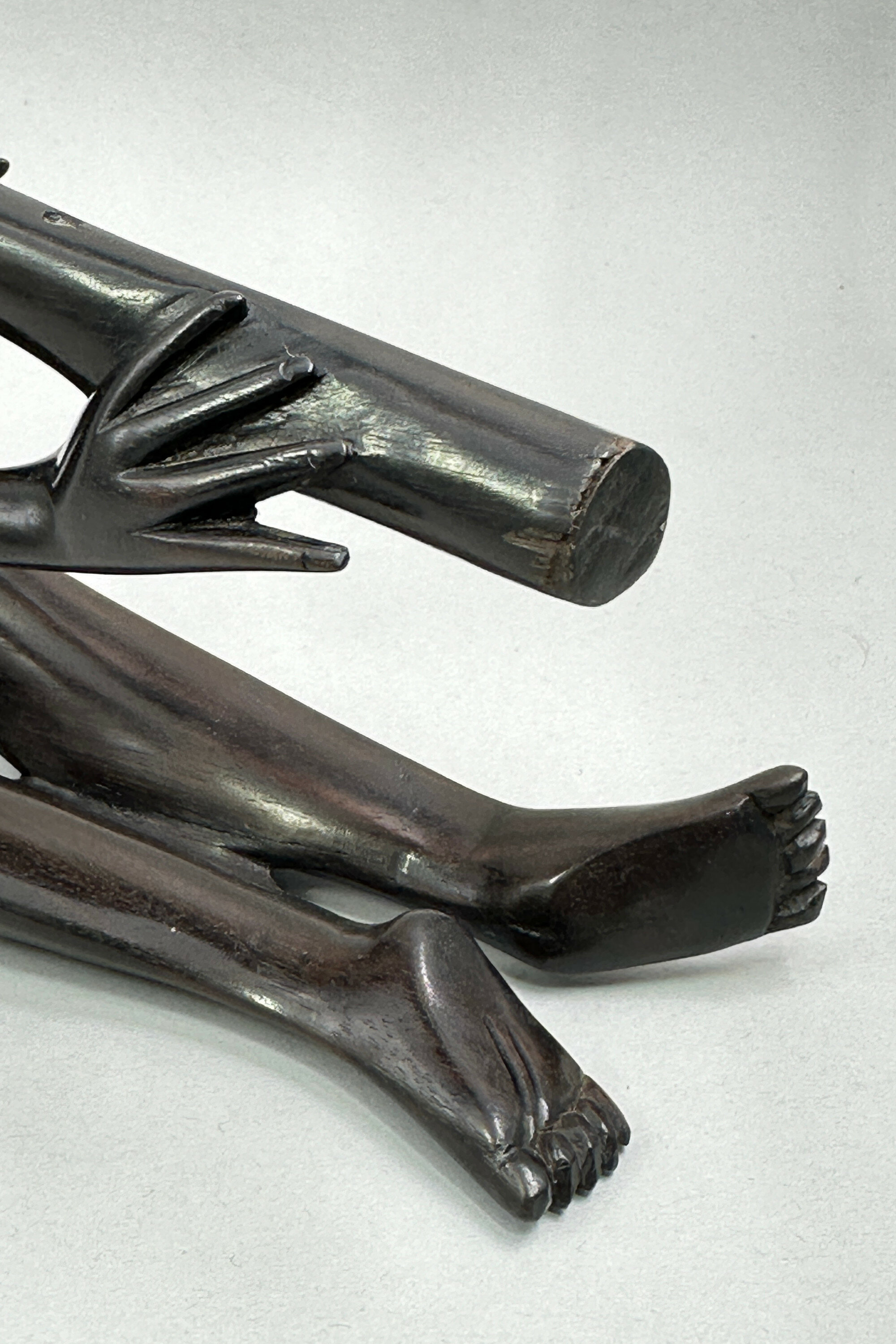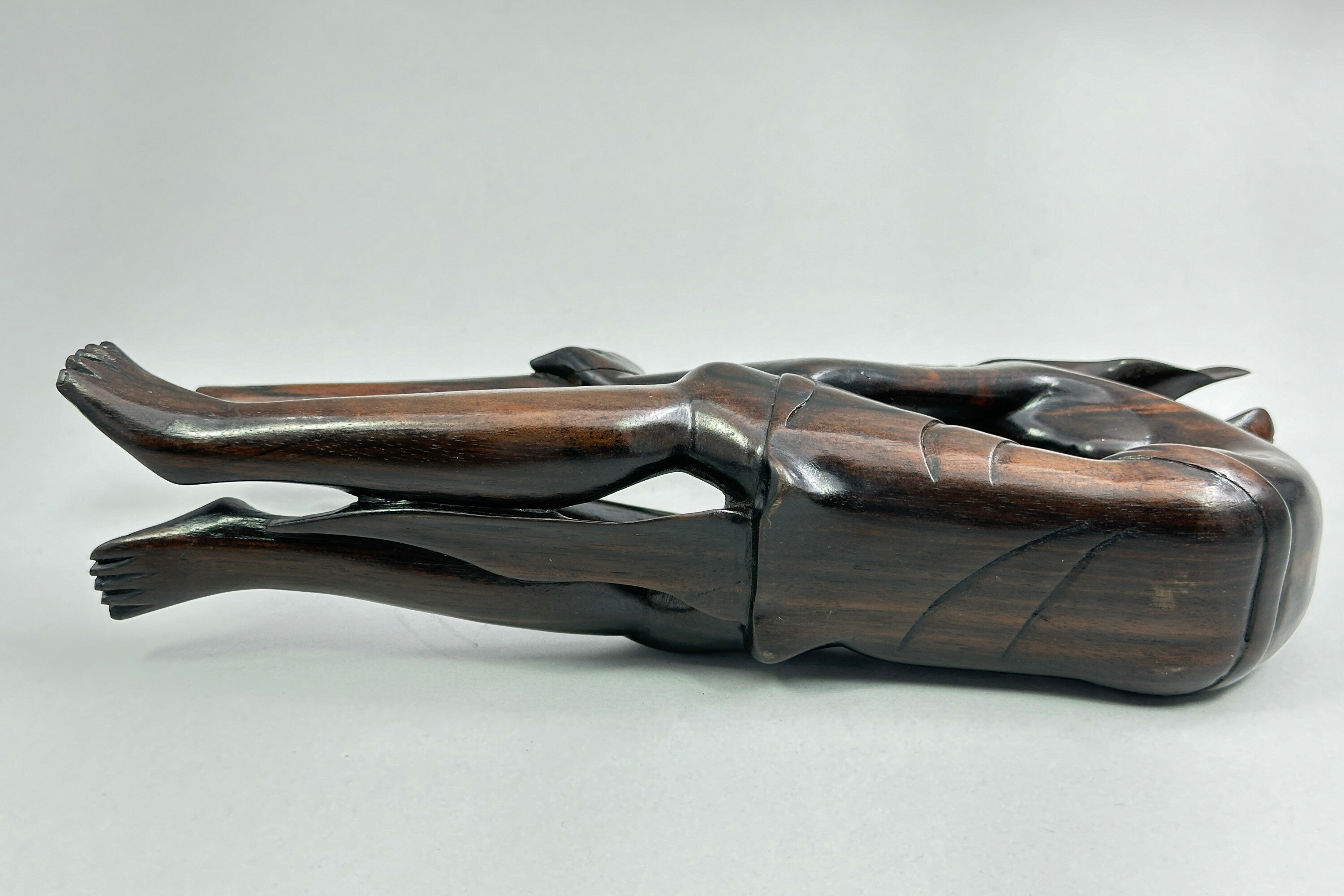 A rosewood figure of a seated musician playing a wind instrument, carved in a semi abstract style and with elongated proportions, the surface highly polished and showing in places the variegated patina of the wood. The style suggests African work similar to the pair of Makonde style figures also included in this sale but while similar pieces can be found there are no direct parallels. But the composition is striking and the quality of the wood enhances the carver’s skill. Dating to the second half of the C20th seems likely, perhaps to the 1960s.| Size: | 26.5 cm long |