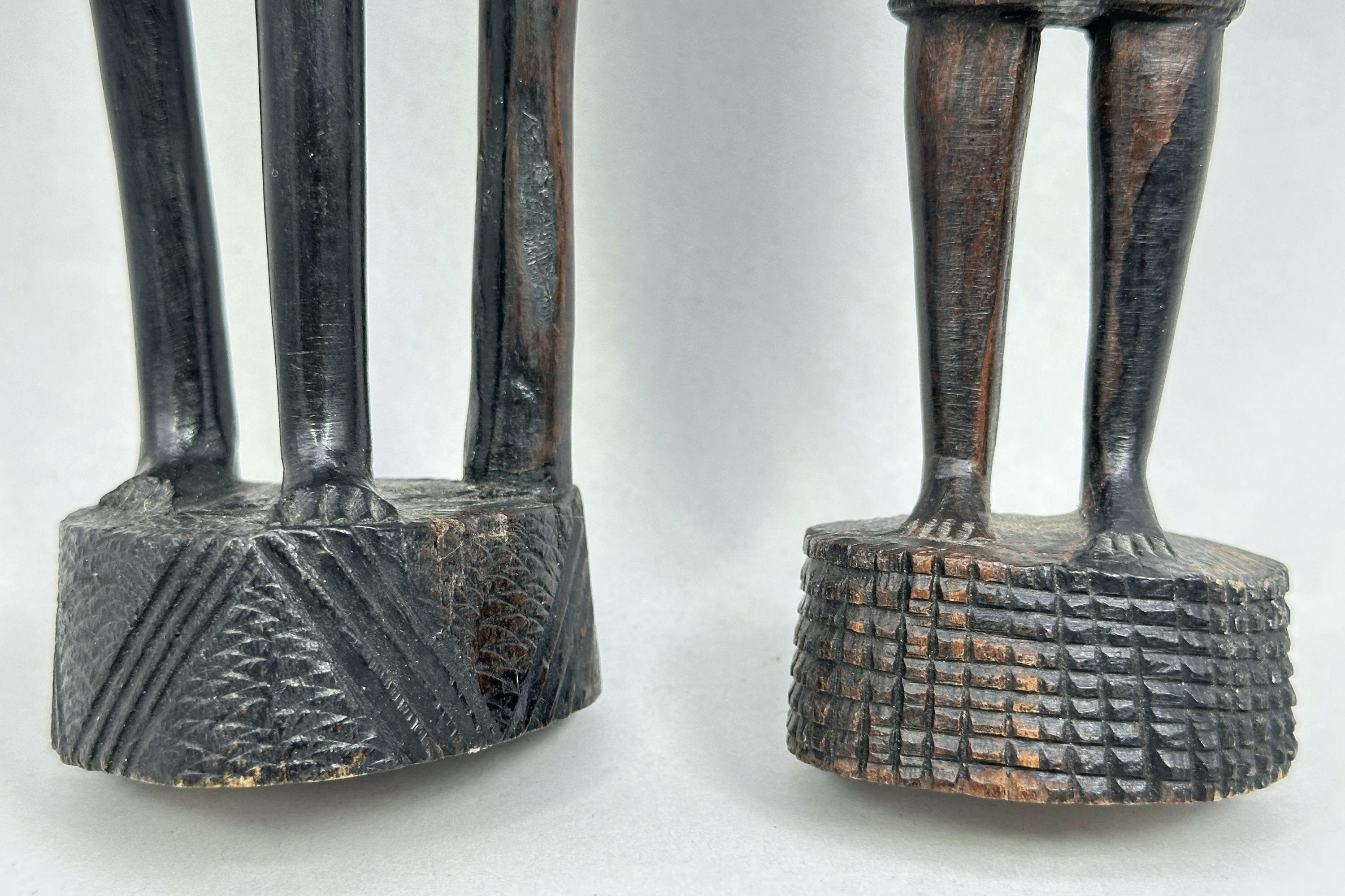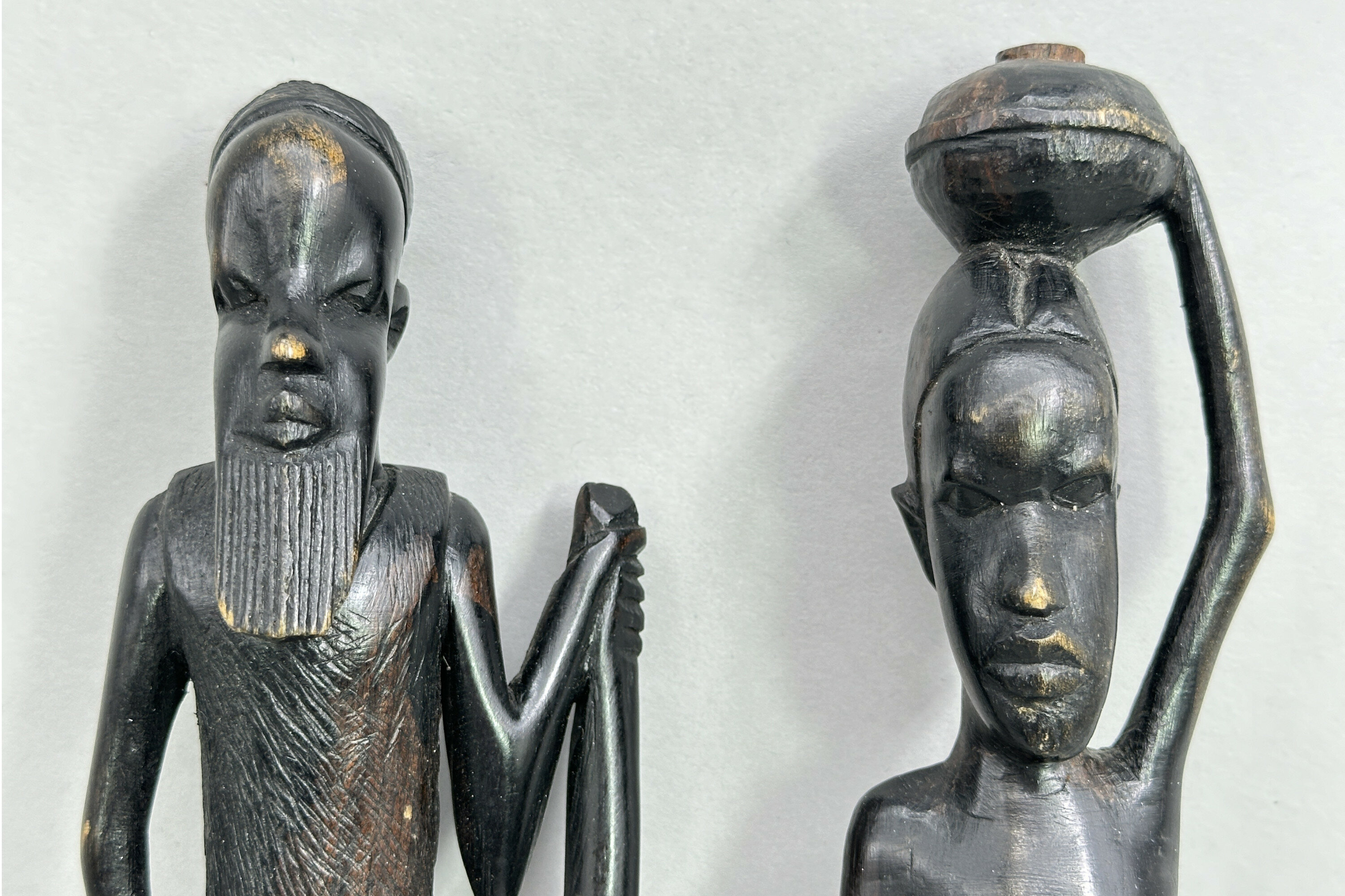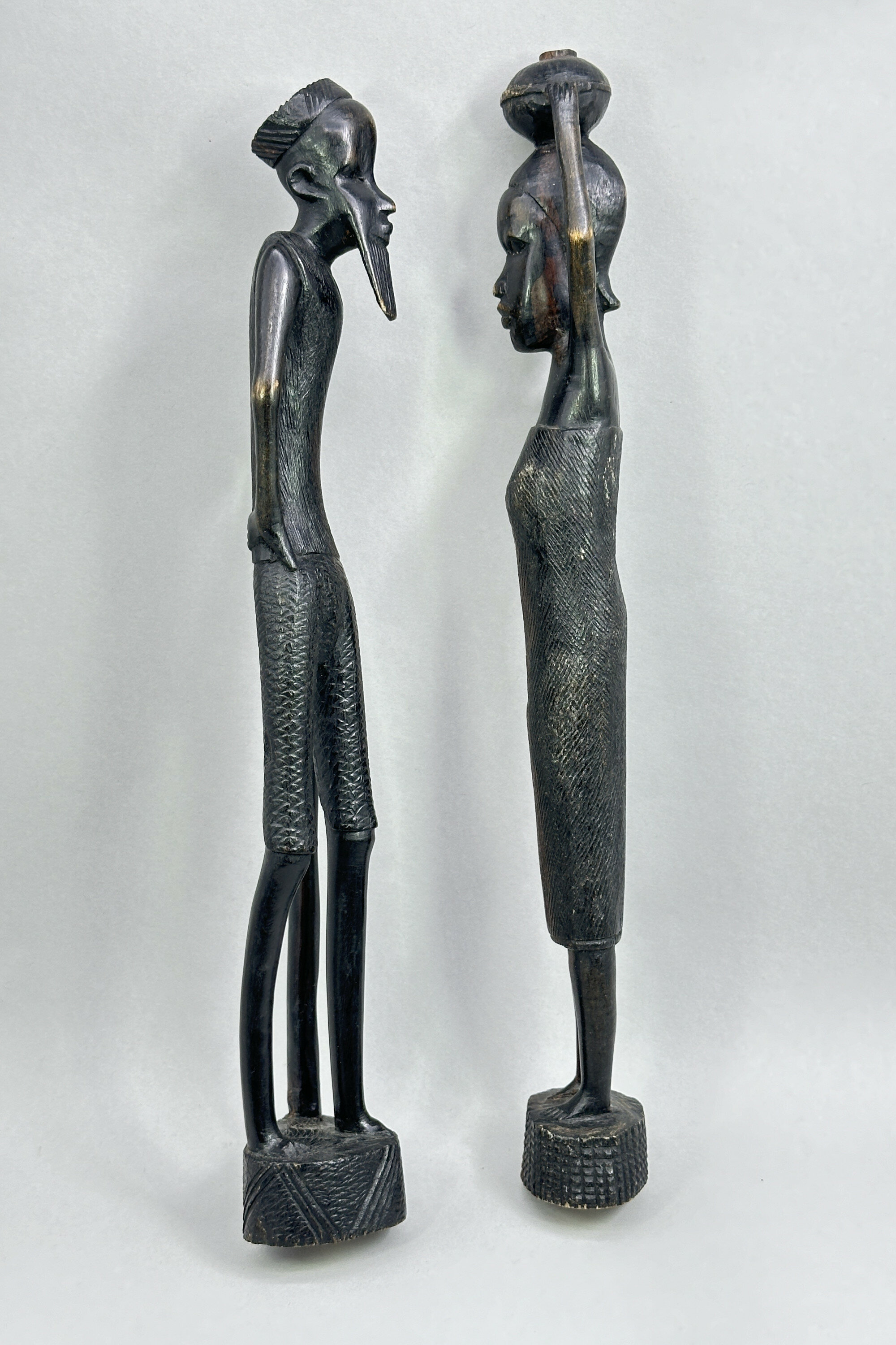 A pair of wood figures of a man and a woman carved in an abstract style with slender proportions, the man holding a long staff and the woman balancing a vessel (presumably for water or wine) on her head, the clothing of both with etched patterned decoration and their complementary bases with contrasting geometric designs. The patina and colour of the wood suggests ebony and the style is African. As with the previous lot there is a label indicating manufacture in Nigeria and Kaduna is the capital city of Kaduna State, and the former political capital of Northern Nigeria. It was a trade centre and a likely source of artefacts made for tourists of which these are most likely an example. Dating is probably as the label indicates and many other similar pieces were produced at that time.| Size: | Man : Ht 36cm (max) Lady : Ht 37cm (max) |