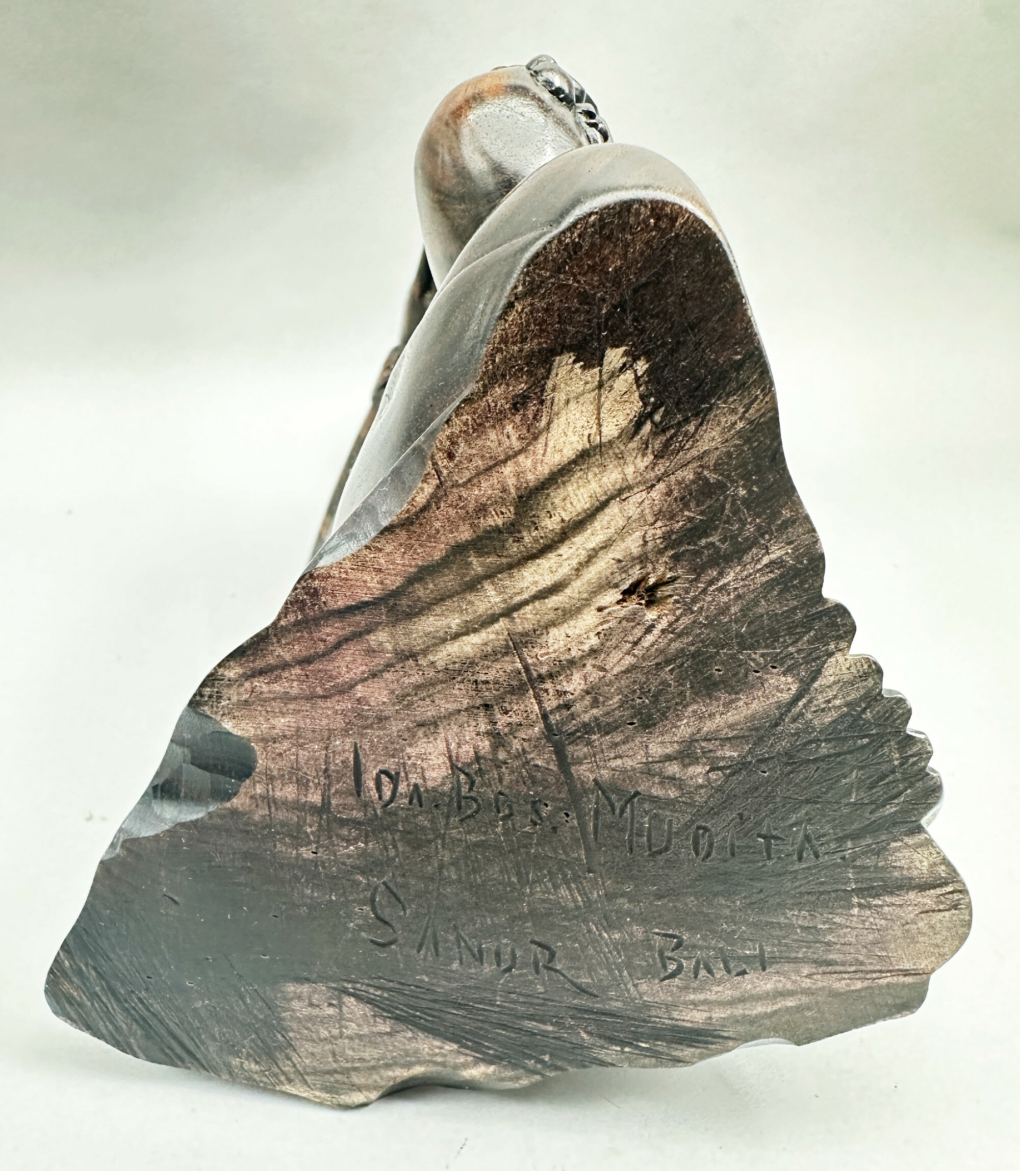 A finely carved wood figure with a rich patina and veining of a young woman crouching, her head, which is elaborately coiffured, slightly inclining as she looks at the devotional stupa like object which she is holding. The style of this piece indicates that it was the work of a Balinese craftsman and the signature underneath confirms this. The island of Bali in Indonesia has a rich tradition of wood carving dating back hundreds of years. Known in the Balinese language as 'Batuan', wood carving has its roots in Bali's Hindu-Buddhist culture. Typically, the pieces are made from hardwoods with a coarse grain including teak, chempaka wood and sandalwood. The decorative grain effects here, though, suggest mahogany and the highly polished finish is quite striking and far less commonly found today. Dating is probably to the 1960s and the artist (with the Balinese surname ‘Mudita’; his first name cannot be made out) has revealed the place of manufacture which is Sanur, a famous beach resort. These figures were often bought by tourists which explains why they are found today in Europe. Like the portrait head of a lady also included in this sale there is an aura of calm contemplation here almost reminiscent of Chinese work.| Size: | 30 x 12 x 13 cm |