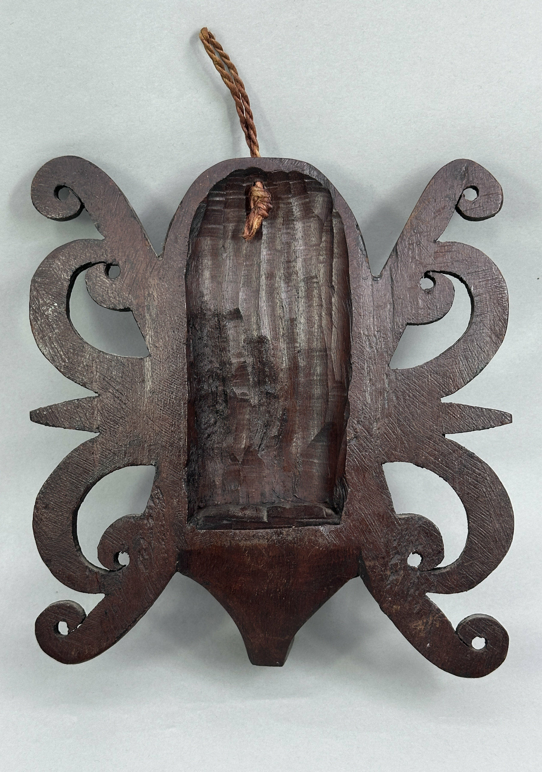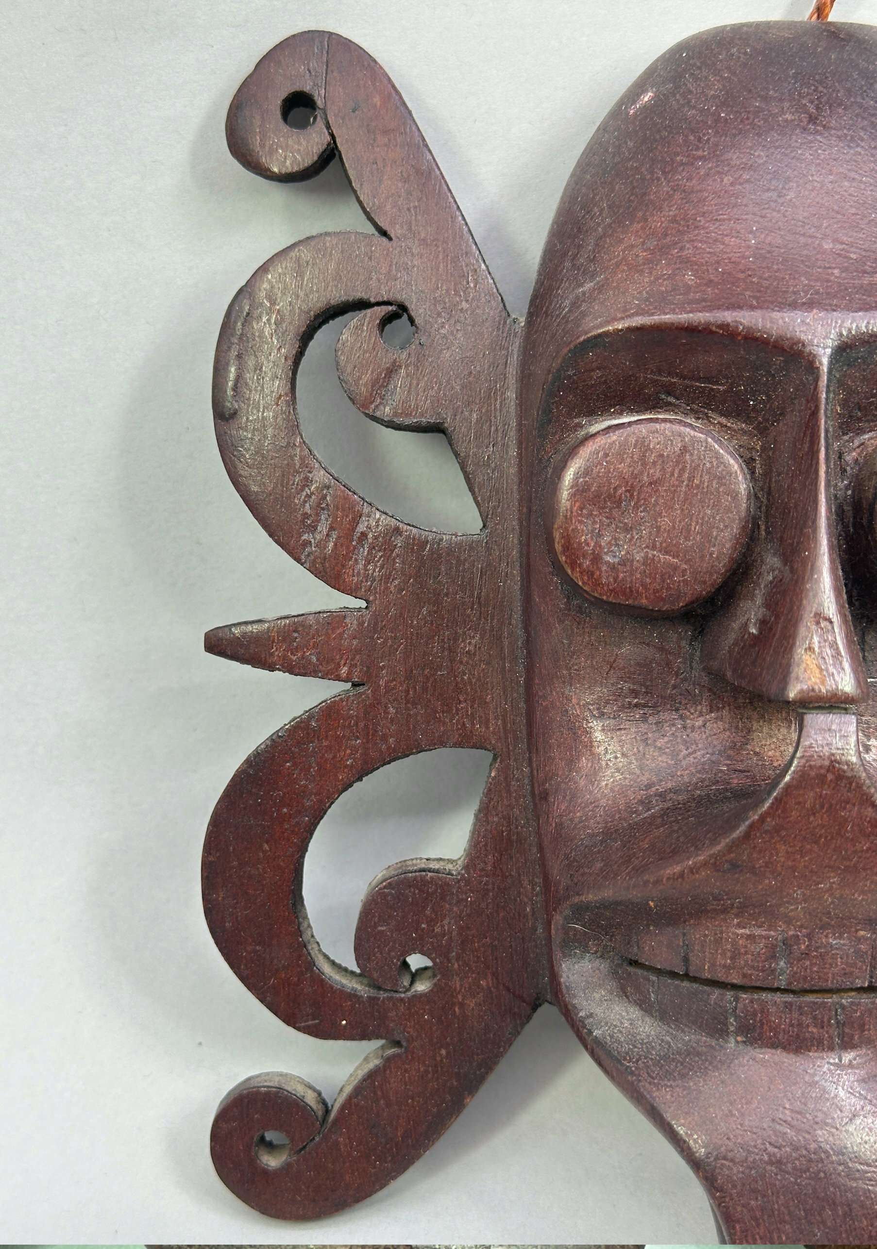 This is a striking wood mask, probably ebony, carved in a bold, semi abstract style, the facial details flanked on each side by two volute decorated ‘ears’, the back hollowed out and pierced at the top for hanging. These gargoyle like creations were made in Borneo, the island north of Java whose sovereignty is shared between Indonesia, Malaysia and Brunei. They are held to be the work of the Dayak tribe and were sometimes used for harvest festival or fertility rites, soul catching and death ceremonies and spiritual dances, but were also, no doubt produced as tourist souvenirs which is most likely what we have here. The decorative appeal is obvious and the potential spiritual functions an added bonus.| Size: | 20 x 18 cm |