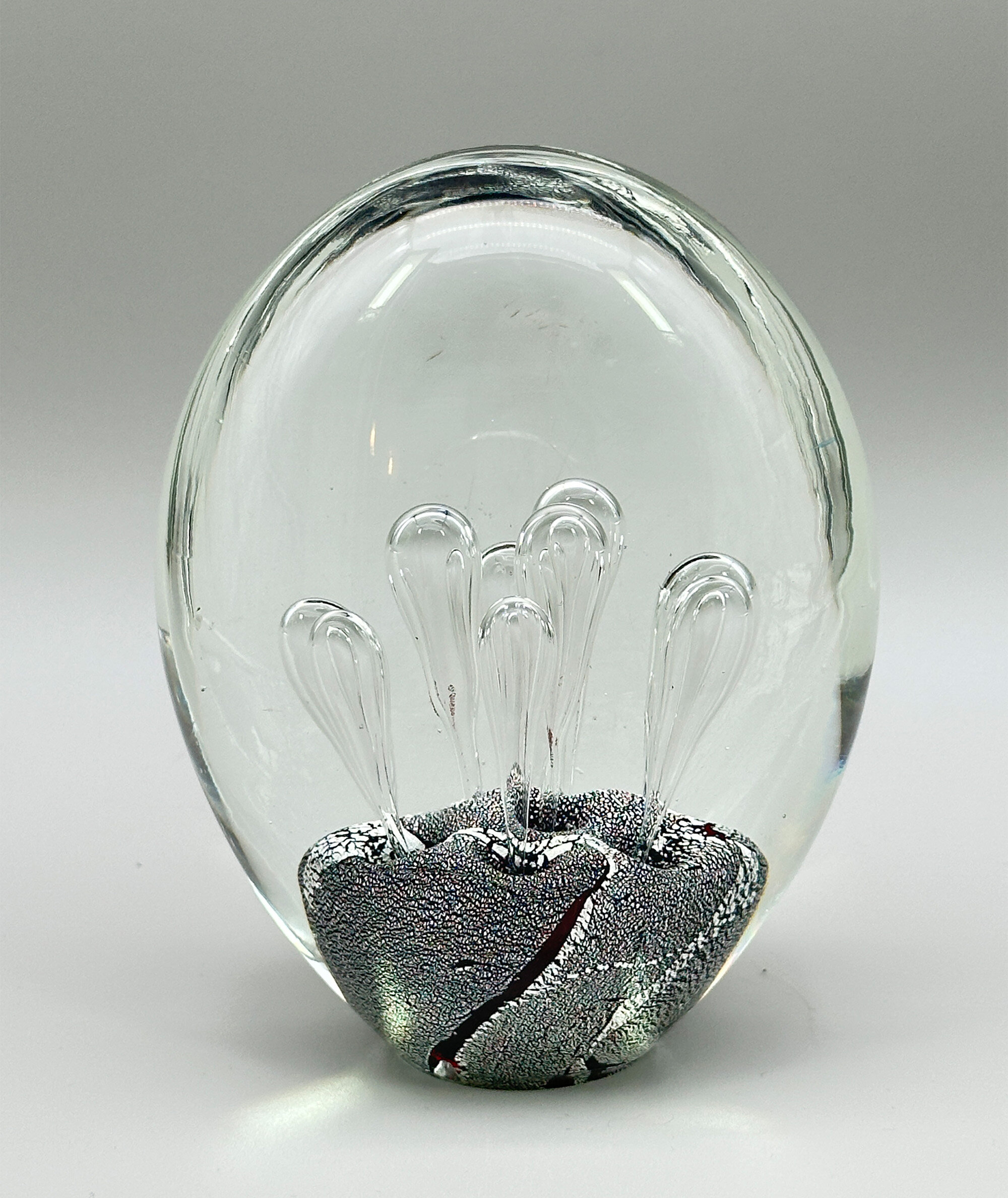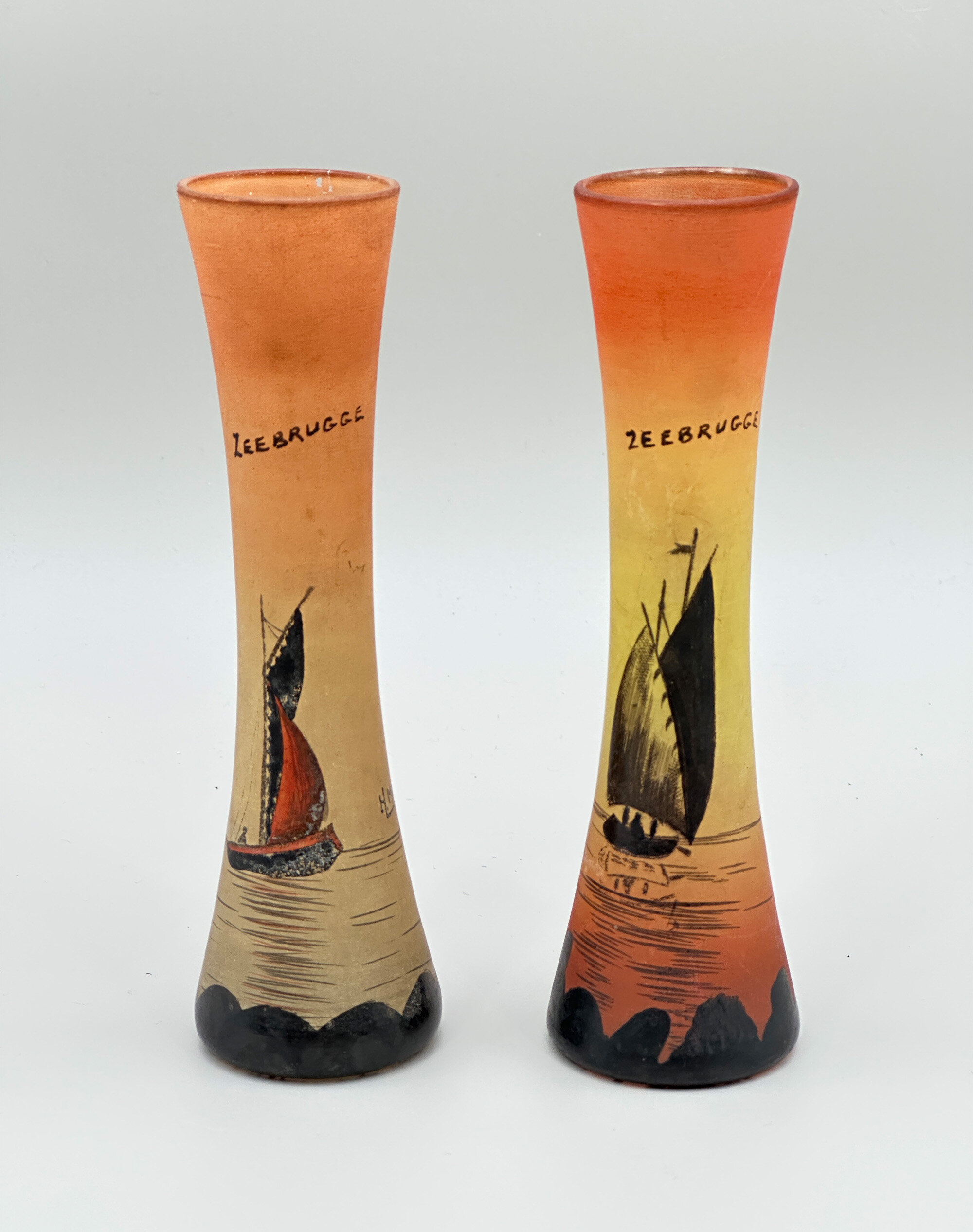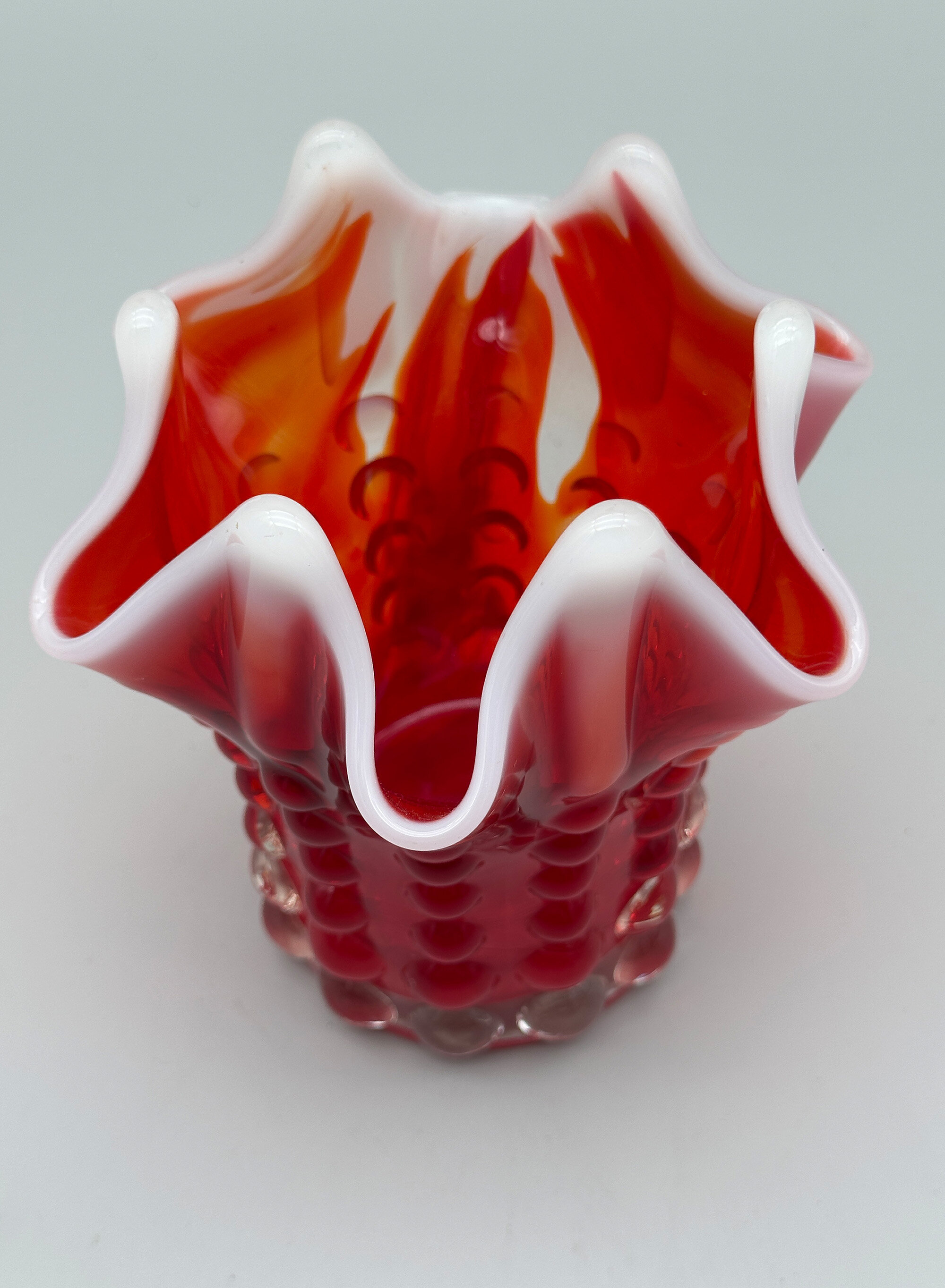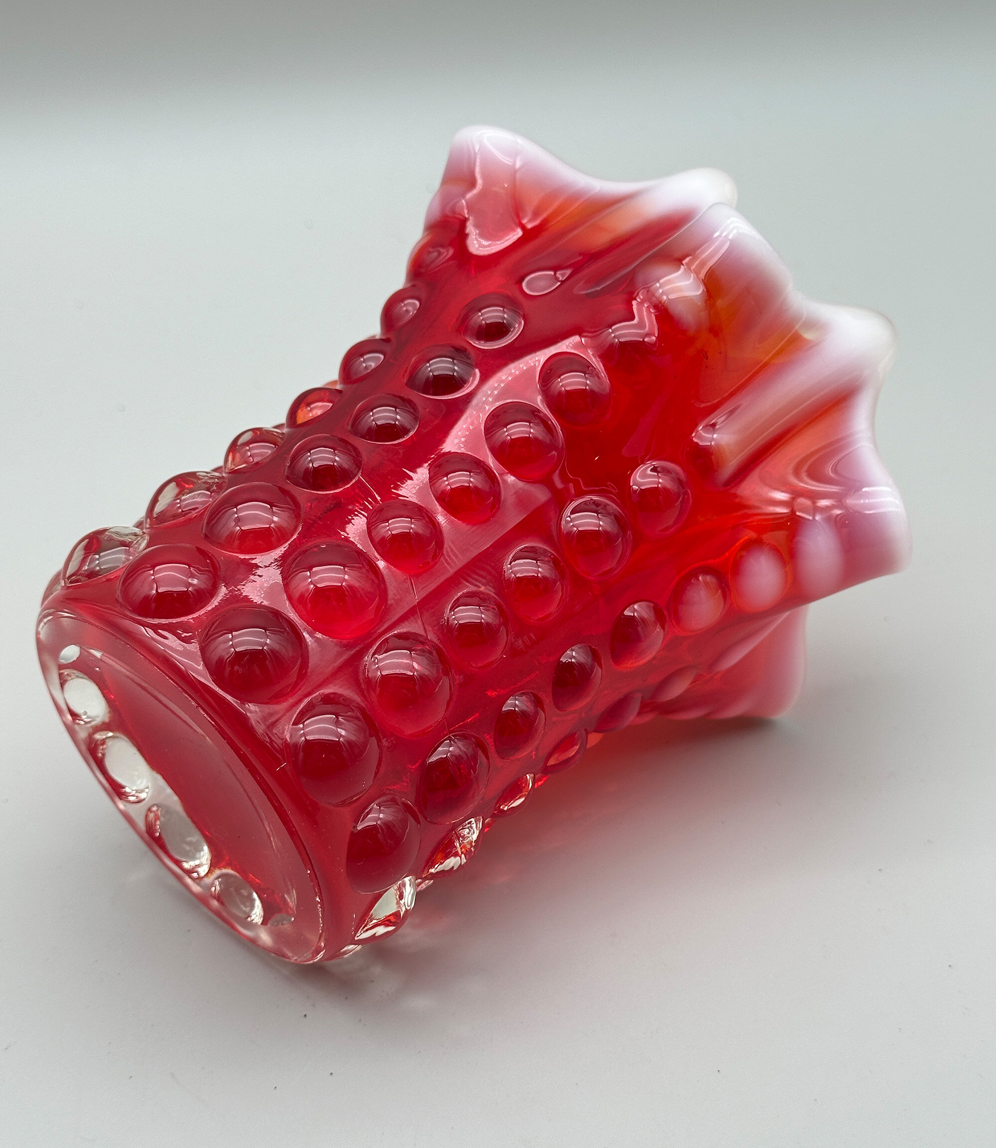 A glass vase of beaker form slightly flaring towards the exaggeratedly crimped top rim with six ‘peaks’, the cranberry coloured glass blending into white towards the top and studded with small raised spheres. The decoration here is termed ‘hobnail’ from its resemblance to the small studs used on the soles of boots. Mould made, it enjoyed great popularity in the Victorian era, usually in coloured glass. Lemonade sets in the design with a jug and matching glasses were particularly popular. The hobnail design was taken up by the American glassworks, Fenton Glass, in 1939 and was sold in great quantities during the second world war and thereafter. At first the pieces were made in French opalescent, green opalescent and cranberry opalescent glass but in 1950 an additional milk glass range was introduced which was to become the most popular of all. The shapes were often elaborate with frilled rims as here, but the beaker shape seems to have been less common. Dating is most likely to the 1940s.| Size: | Ht 16cm, Width (max) 14cm, Base 7.5cm |