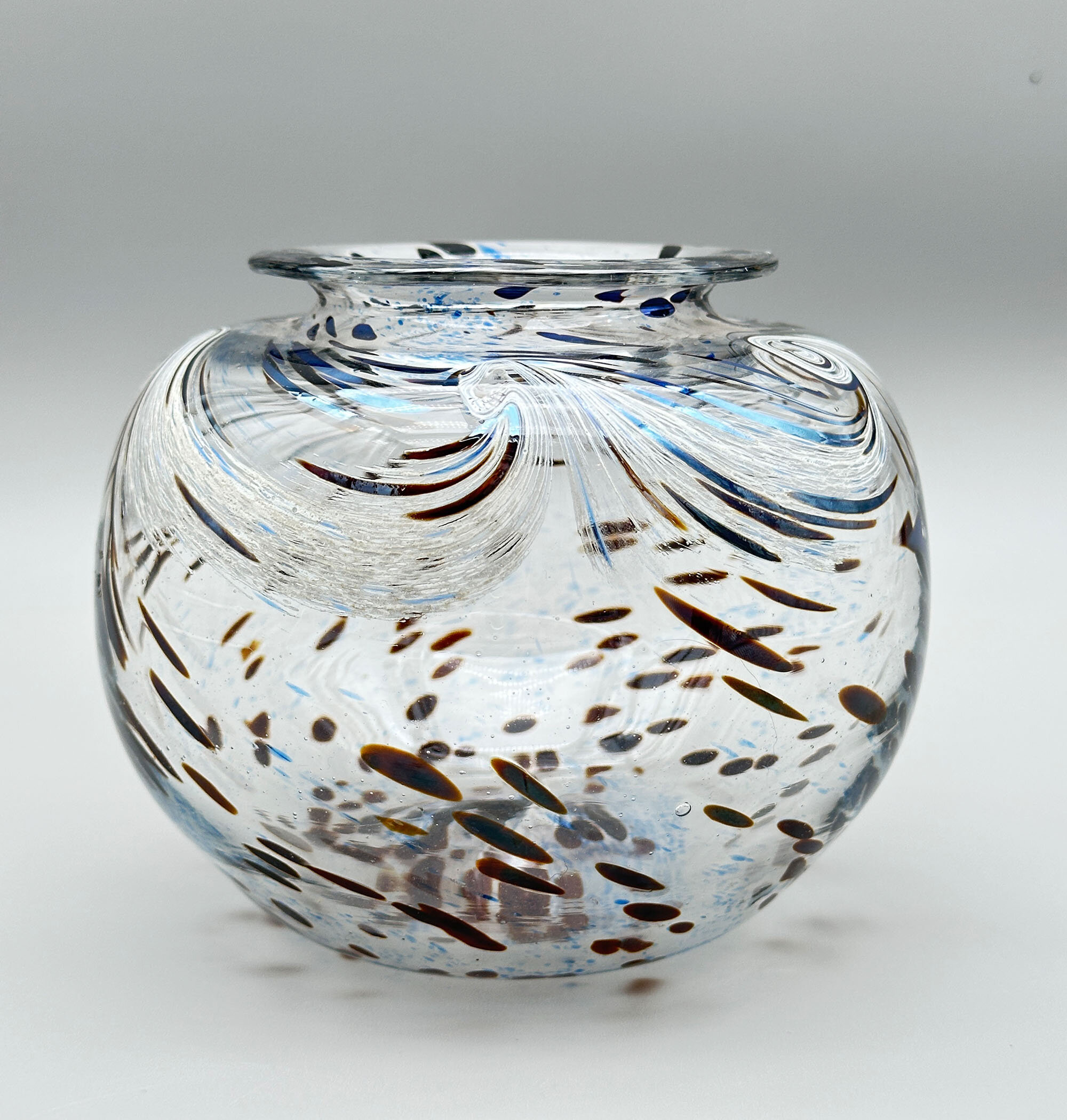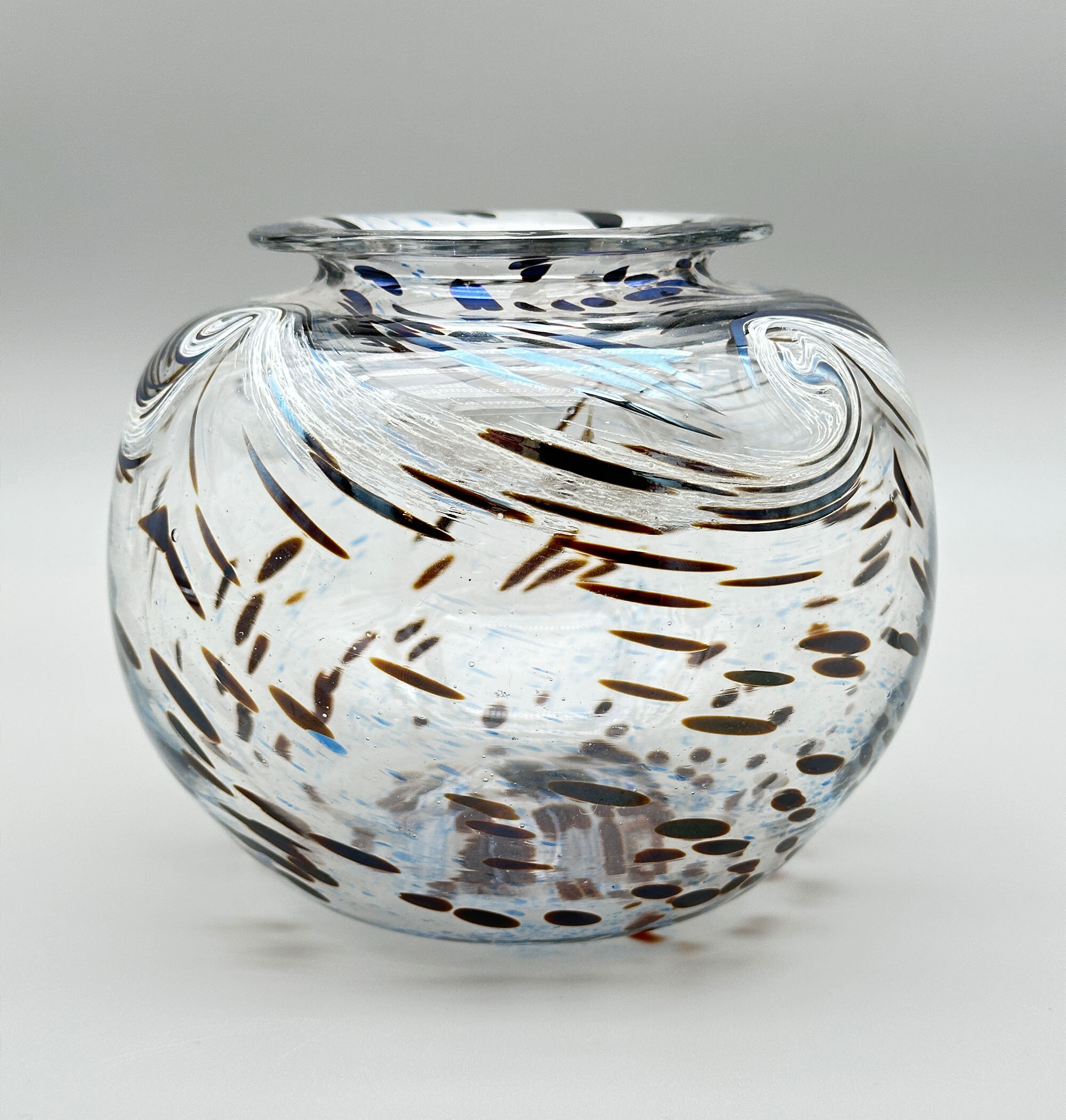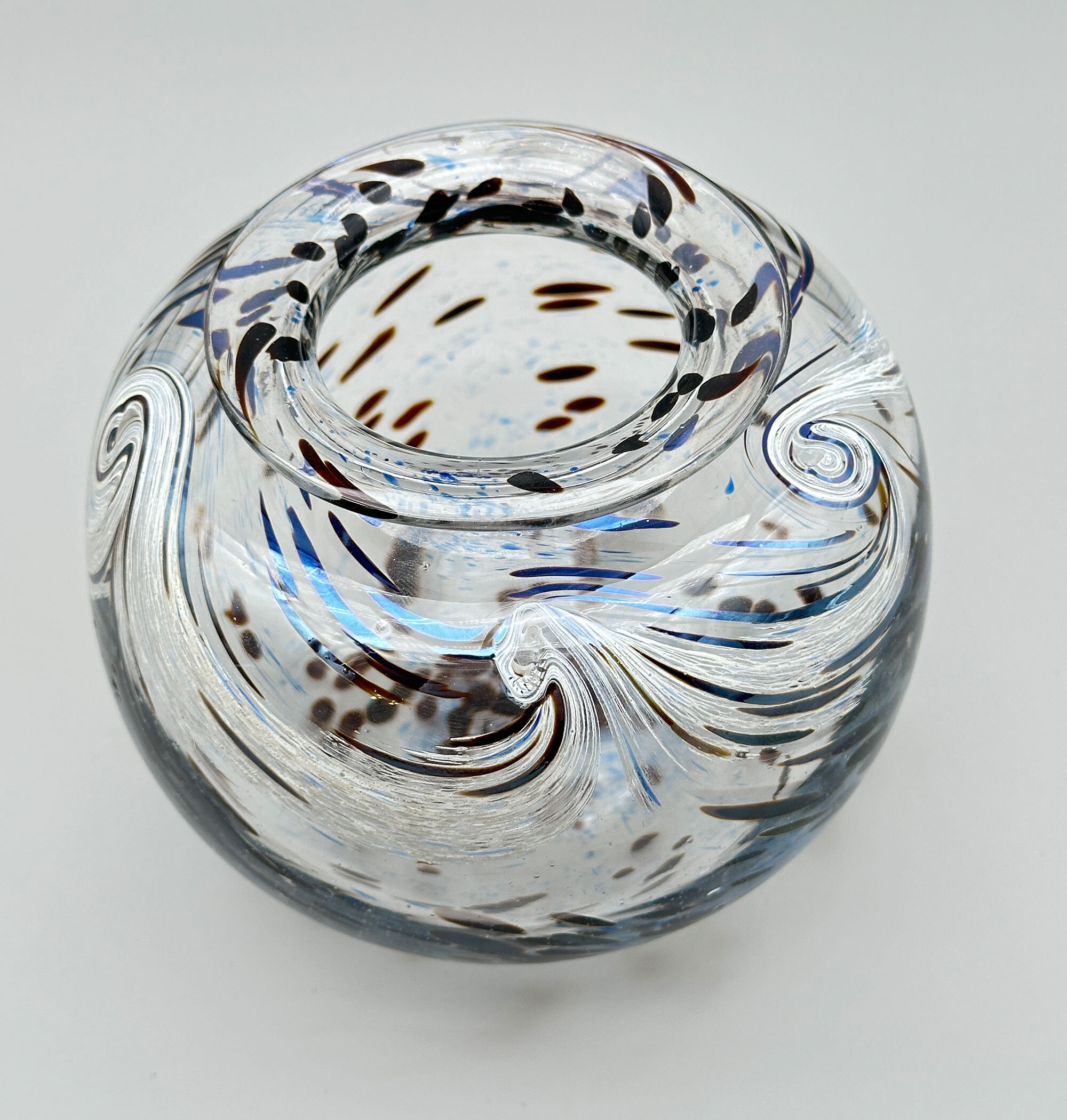 An art glass vase of compressed globular form with a short concave neck and a flaring flat rim, the base flat with a pontil mark to the centre and an etched signature, perhaps to be read as ‘St Cl’, with the date ‘1994’, the clear glass body decorated in greys, blues and browns with trailing swirls and dashes and dots, perhaps intended to represent stylised fish and pebbles in flowing water. There is clearly considerable skill in the manufacture of this piece which was hand blown as indicated by the pontil mark underneath but the signature is unclear and the work without an exact parallel.| Size: | Ht 11.5cm, Width (max) 13.5cm, Top diam 8.5cm , Base 6.5cm |