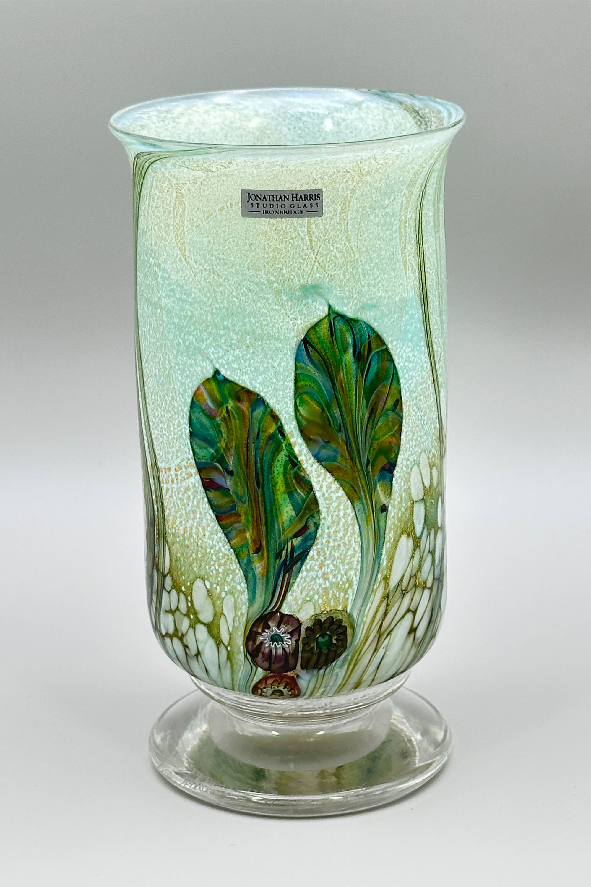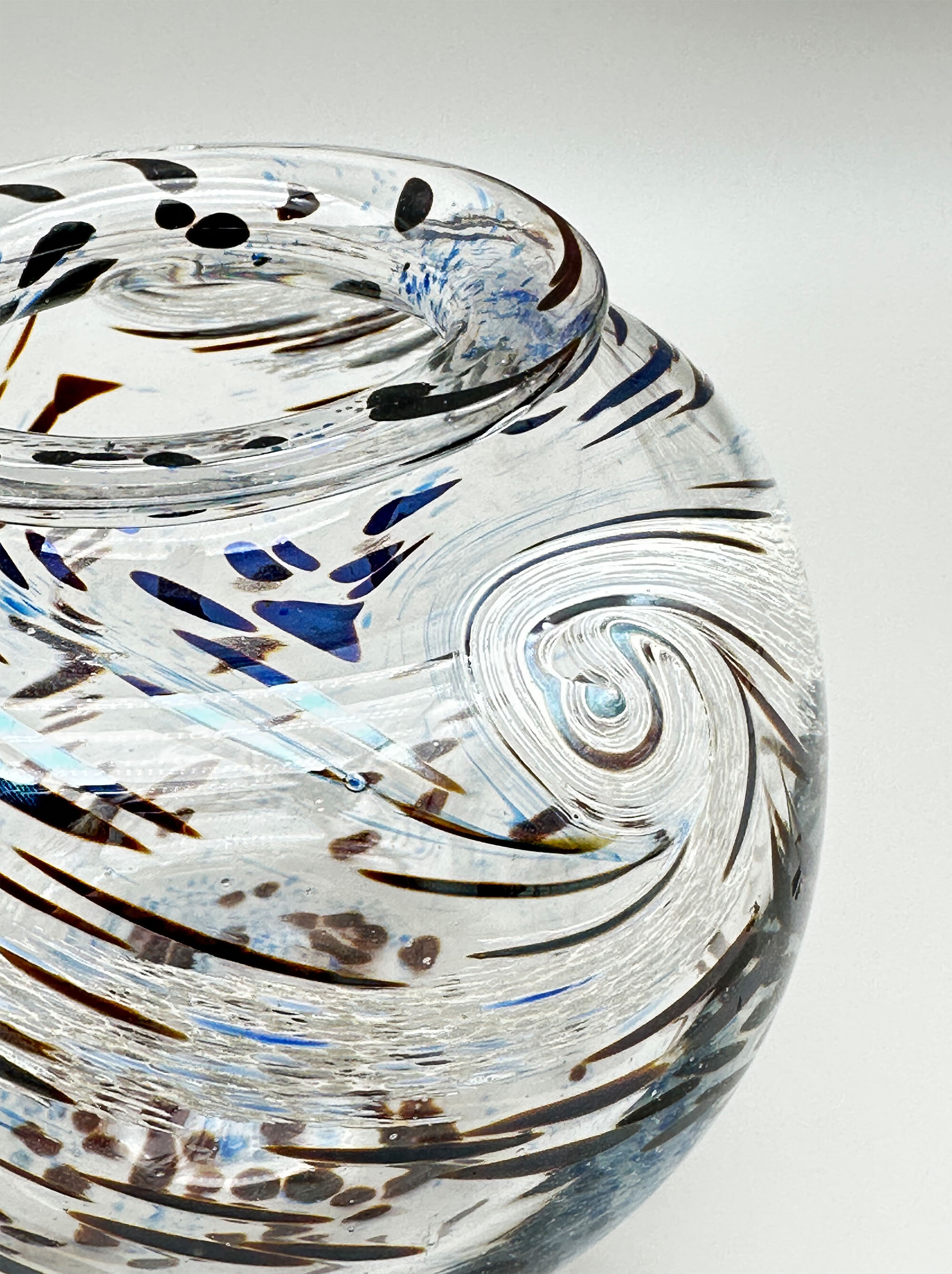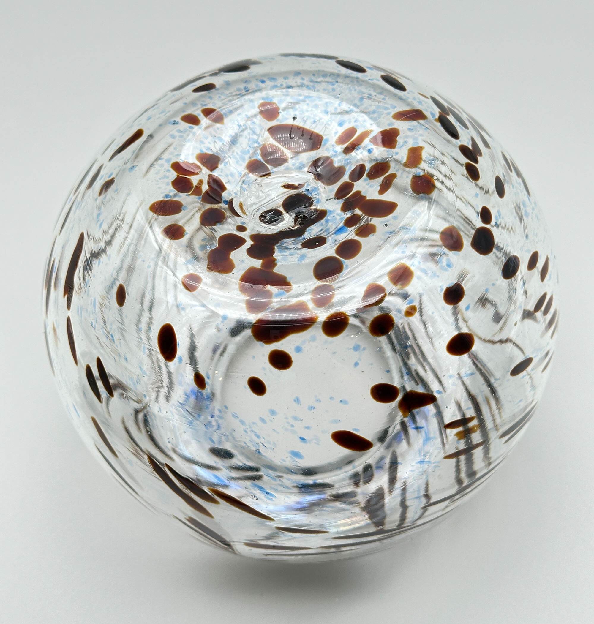 An art glass vase of compressed globular form with a short concave neck and a flaring flat rim, the base flat with a pontil mark to the centre and an etched signature, perhaps to be read as ‘St Cl’, with the date ‘1994’, the clear glass body decorated in greys, blues and browns with trailing swirls and dashes and dots, perhaps intended to represent stylised fish and pebbles in flowing water. There is clearly considerable skill in the manufacture of this piece which was hand blown as indicated by the pontil mark underneath but the signature is unclear and the work without an exact parallel.| Size: | Ht 11.5cm, Width (max) 13.5cm, Top diam 8.5cm , Base 6.5cm |
