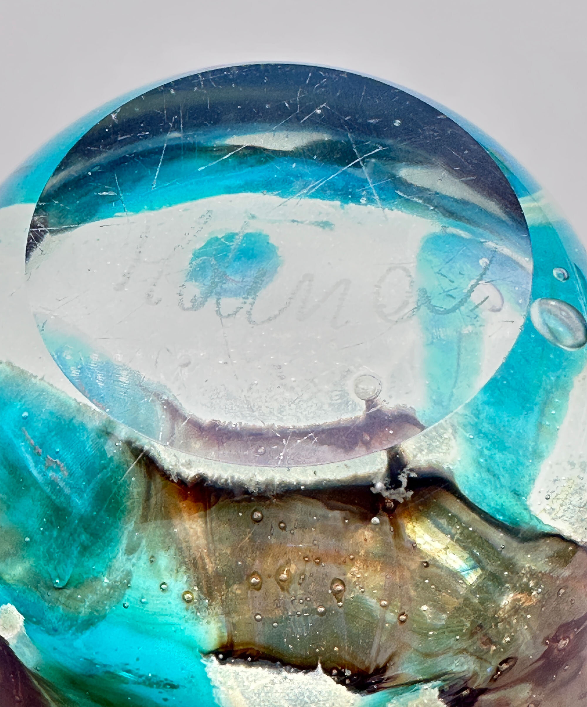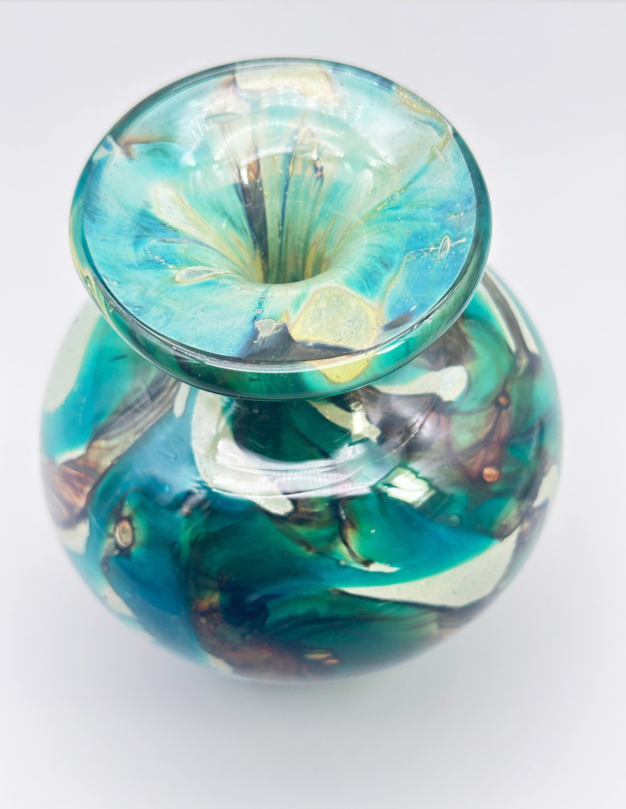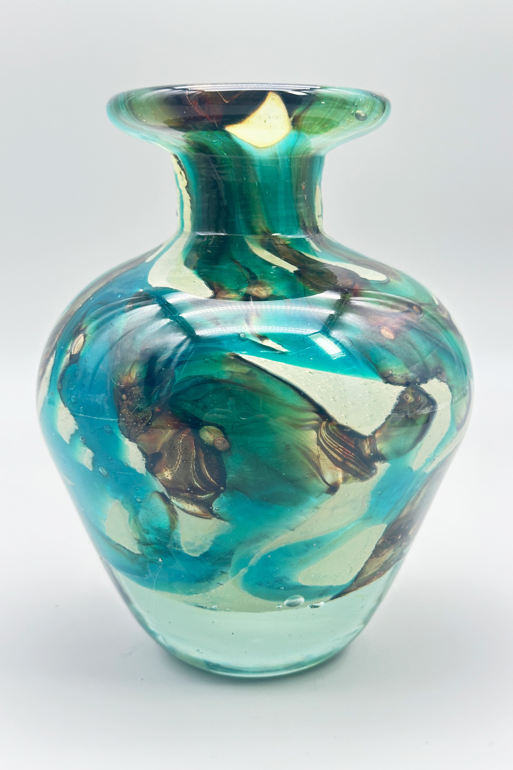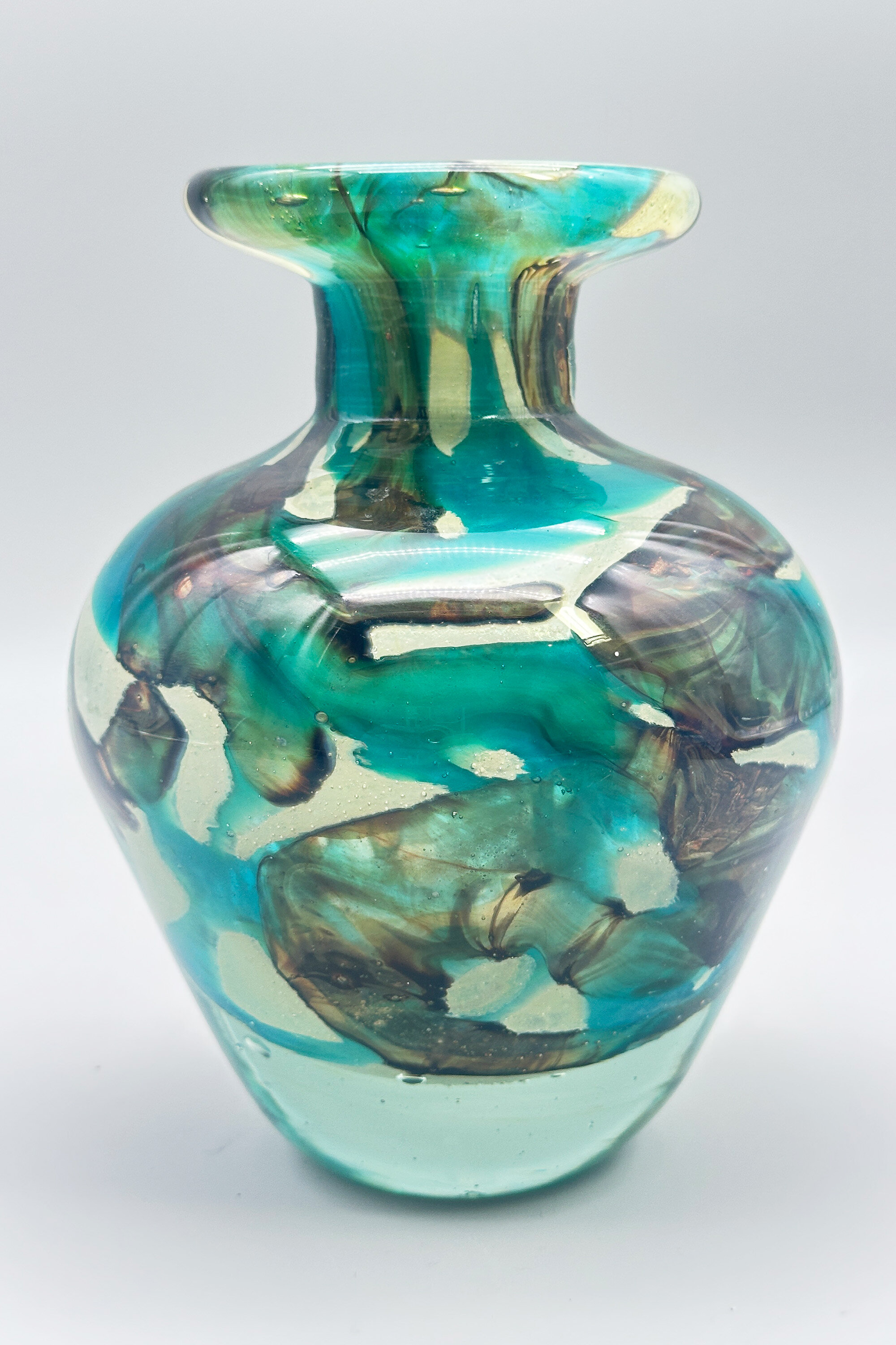 A stoutly blown glass vase of tapering ovoid form with a broad neck and a flaring rim, the base flat with an etched signature ‘Mdina’, decorated in browns and blues with a marble effect pattern.Mdina Glass was founded in the Maltese town of Mdina in 1968 by Michael Harris and Eric Dobson. The town had no history of glass making but the venture proved to be a success. Its wares, free formed organic glassware, often in colours inspired from the sea, sand, earth and sky, proved very popular with tourists visiting Malta. This vase is one of the earlier productions made by Mdina (the format of the signature confirms this) probably dating to the 1970s. The design is known as the ‘tiger pattern’ and is believed to have been created by Eric Dobson himself. All the pieces in the range have individual variations but this particular version is extremely pleasing and highly characteristic of Mdina’s naturalistic style.