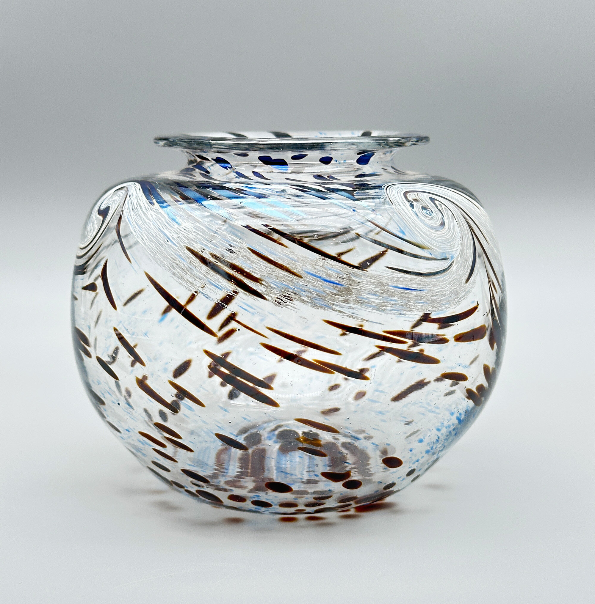 A pair of clear pressed glass vases of rounded hexagonal form the body flaring out towards the scalloped top rim with a shaped base below, the decoration employing the well known ‘chevron pattern’, typical of Art Deco designs. These vases were designed by W.J.G Fullerton for the firm George Davidson of Gateshead in the 1930s, with the pattern number 295.George Davidson founded the Teams Flint Glass Works in 1867, which later became known as George Davidson & Co. In the 1880s the company began producing pressed glass tableware in a variety of shapes and by the 1920s their designs began to reflect the new Art Deco trends. The firm continued production until the 1980s, closing in 1987.