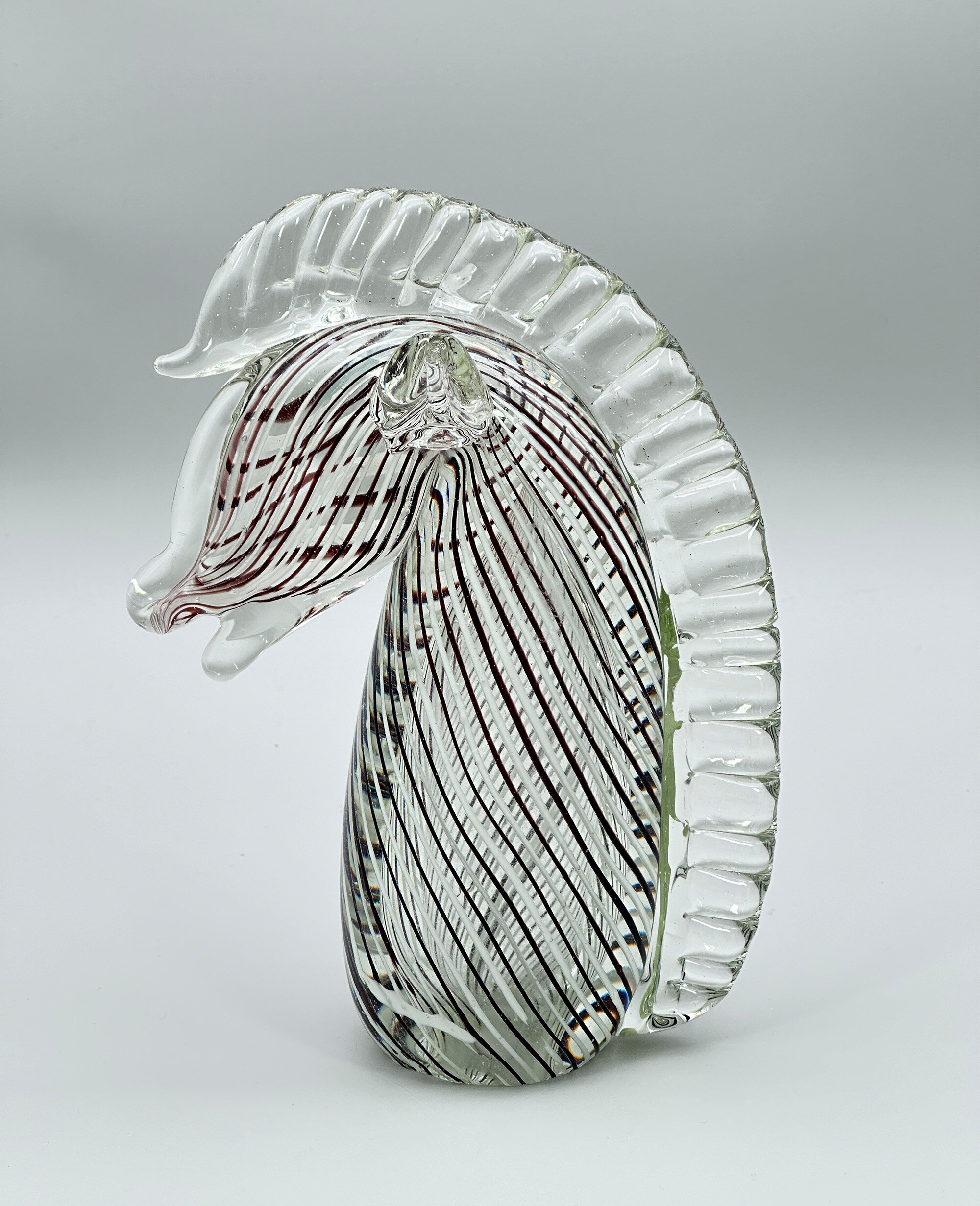 A blue glass small bottle and stopper in deep cobalt blue of squared and rounded pyramid form with a stepped concave neck. The shape suggests a perfume bottle and similar examples do exist including one with a gilt Chloé mark which would mean a post 1952 date of manufacture. The technique here, though, resembles the ‘pressed glass’ pieces made in England during the 1930s, for example by the firm Davidson, suggesting a more likely dating to that period. The slightly Art Deco feel to the form fits in with this. While it has slight damage, it is, of course, more unusual to find this shape with its original stopper.