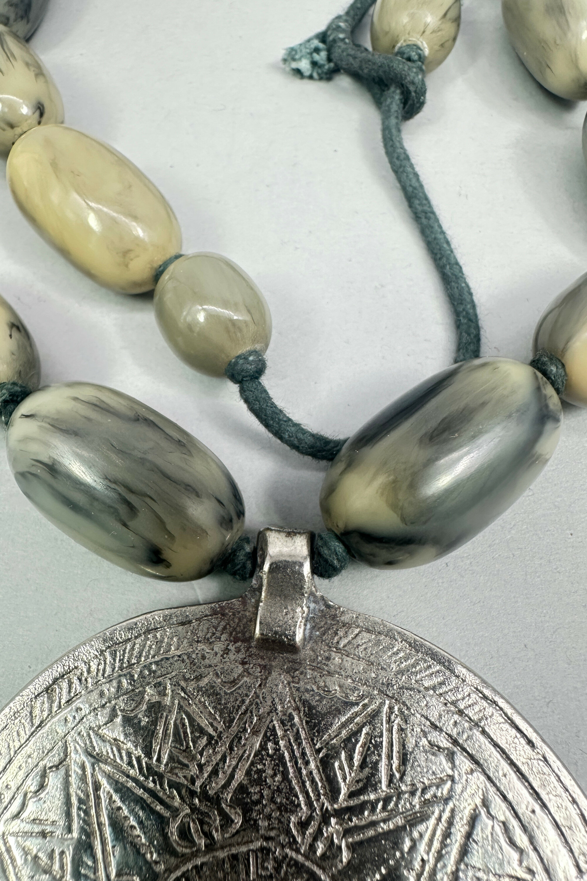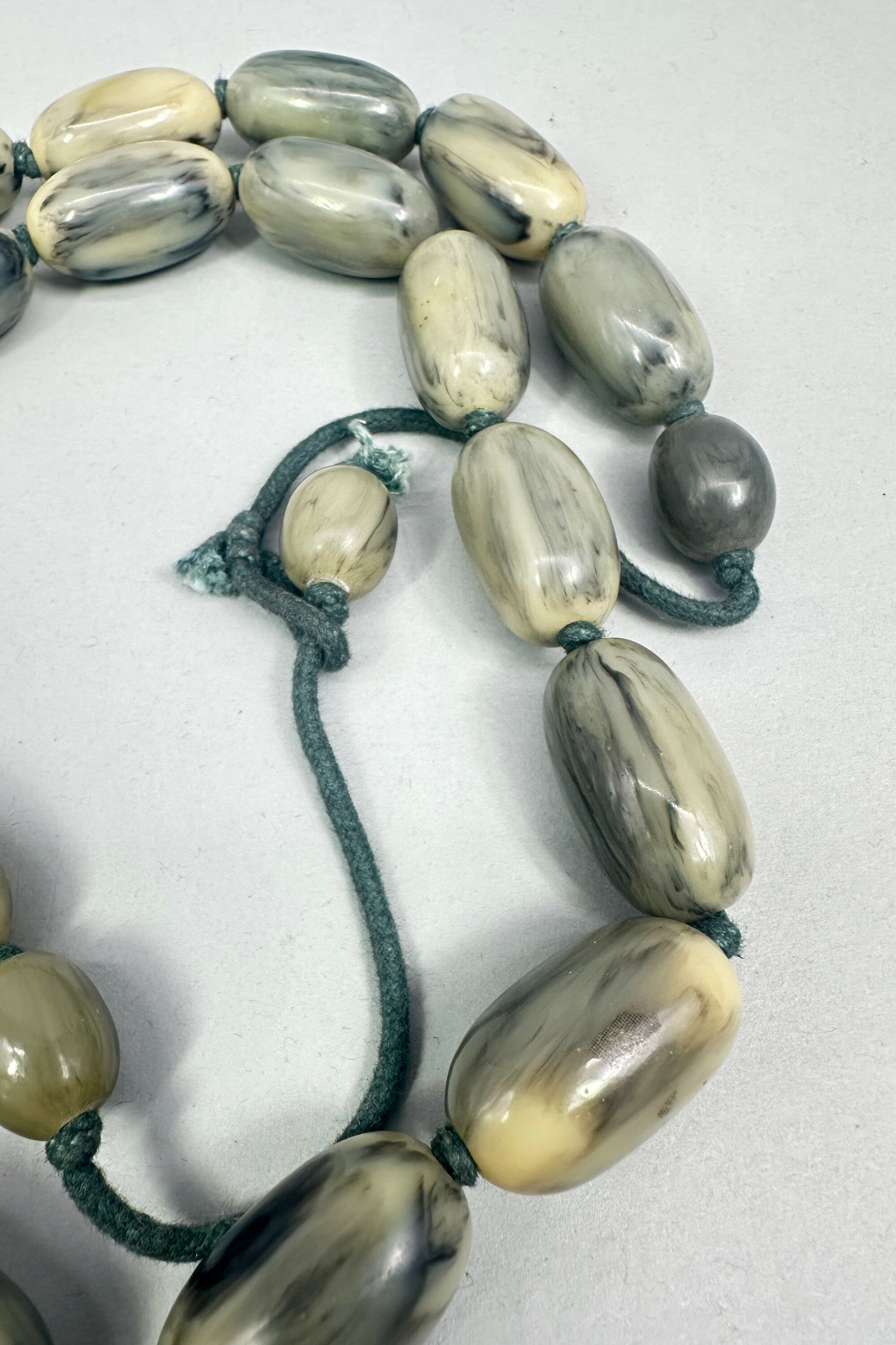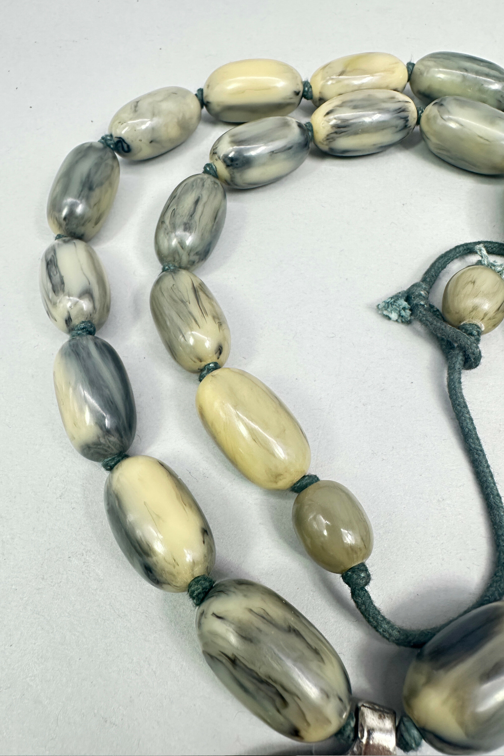 This is a very unusual necklace comprising large dual-coloured grey beads. These are Catalin which is an early plastic. The beads have been Simichrome tested and are not Bakelite. The beads are strung onto silk cord and end with a silvered metal amulet. This is most likely Turkish in origin.| Size: | Length 84 cm, Bead 26 x 15mm, Amulet is 65 mm |