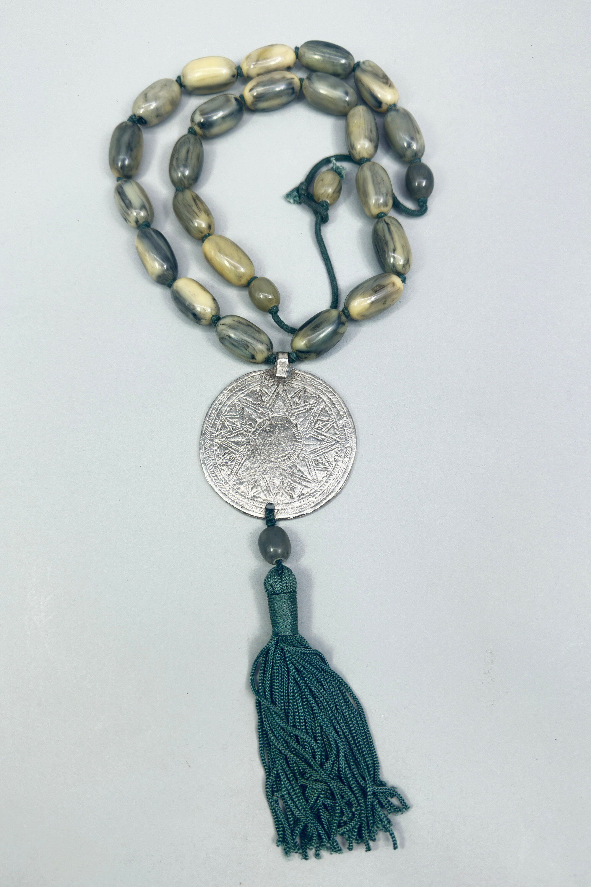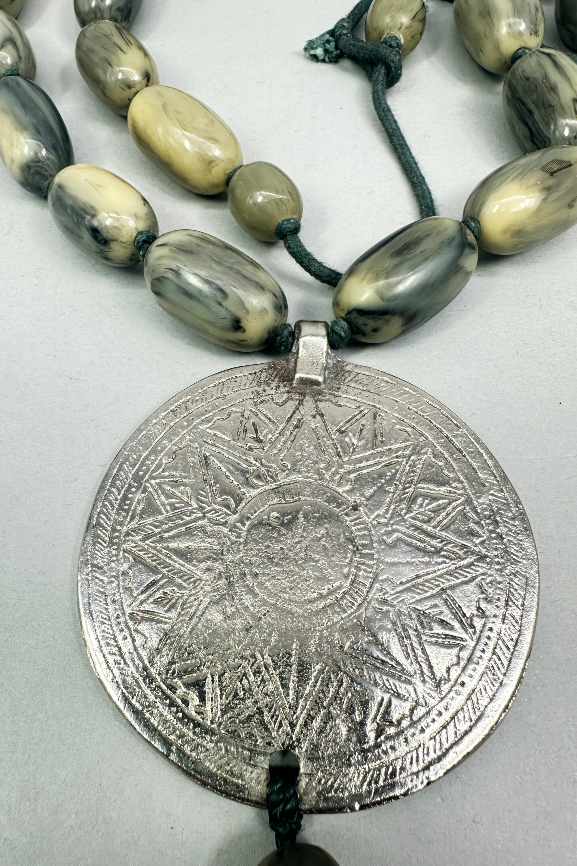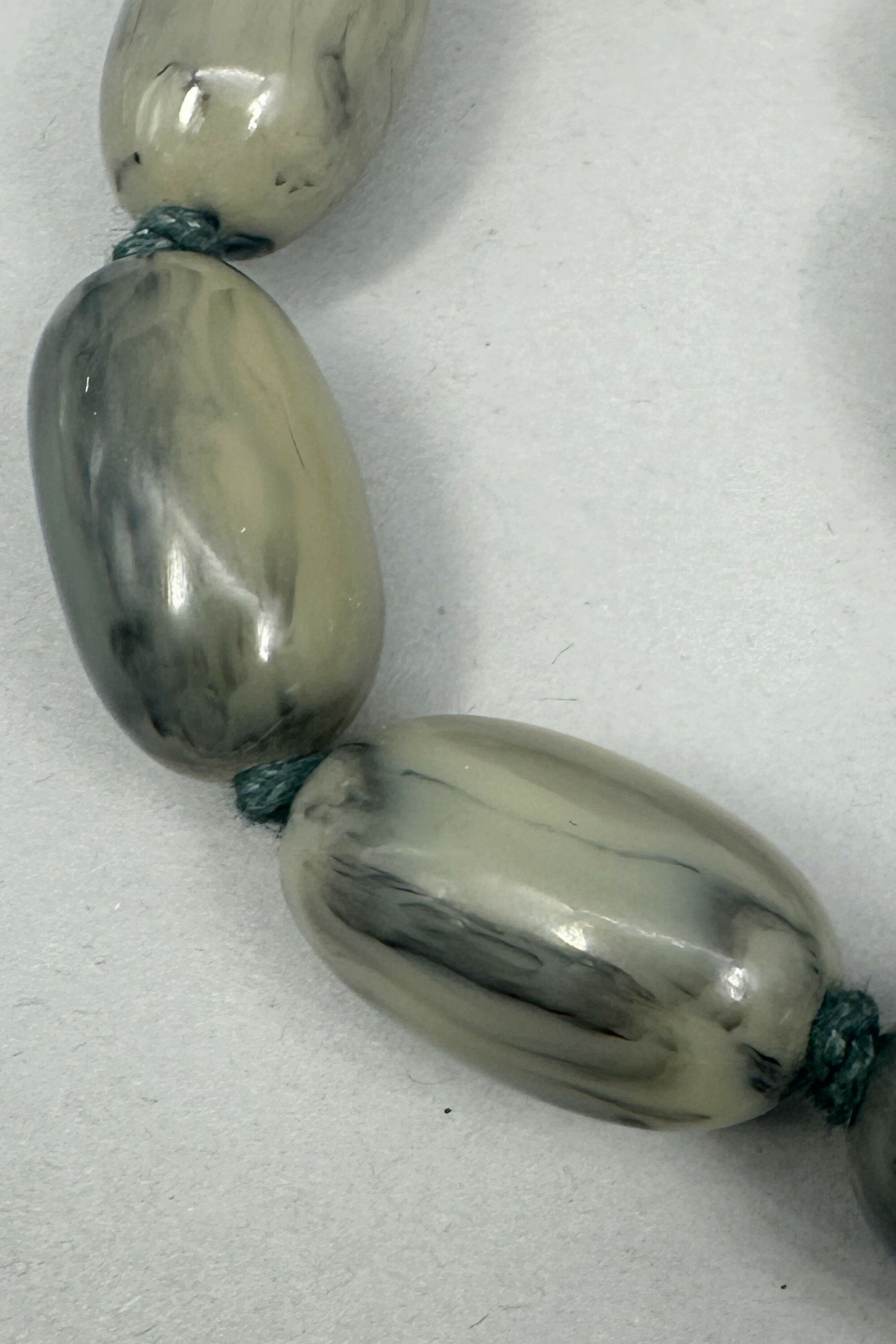 This is a very unusual necklace comprising large dual-coloured grey beads. These are Catalin which is an early plastic. The beads have been Simichrome tested and are not Bakelite. The beads are strung onto silk cord and end with a silvered metal amulet. This is most likely Turkish in origin.| Size: | Length 84 cm, Bead 26 x 15mm, Amulet is 65 mm |