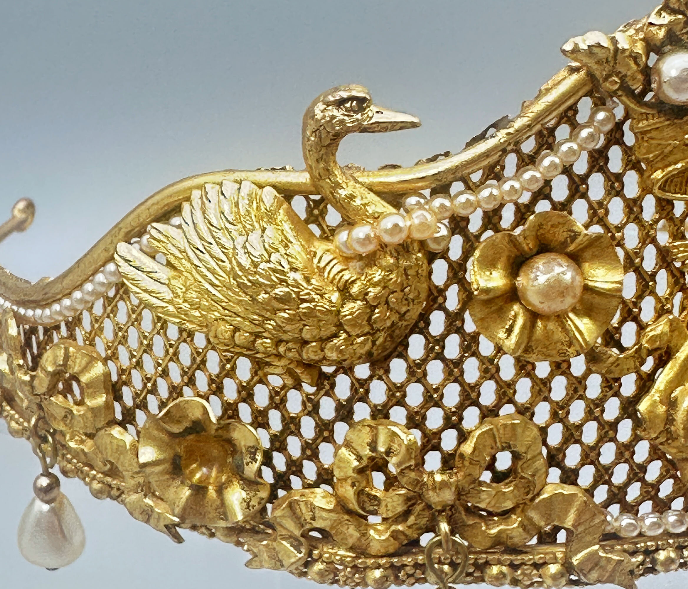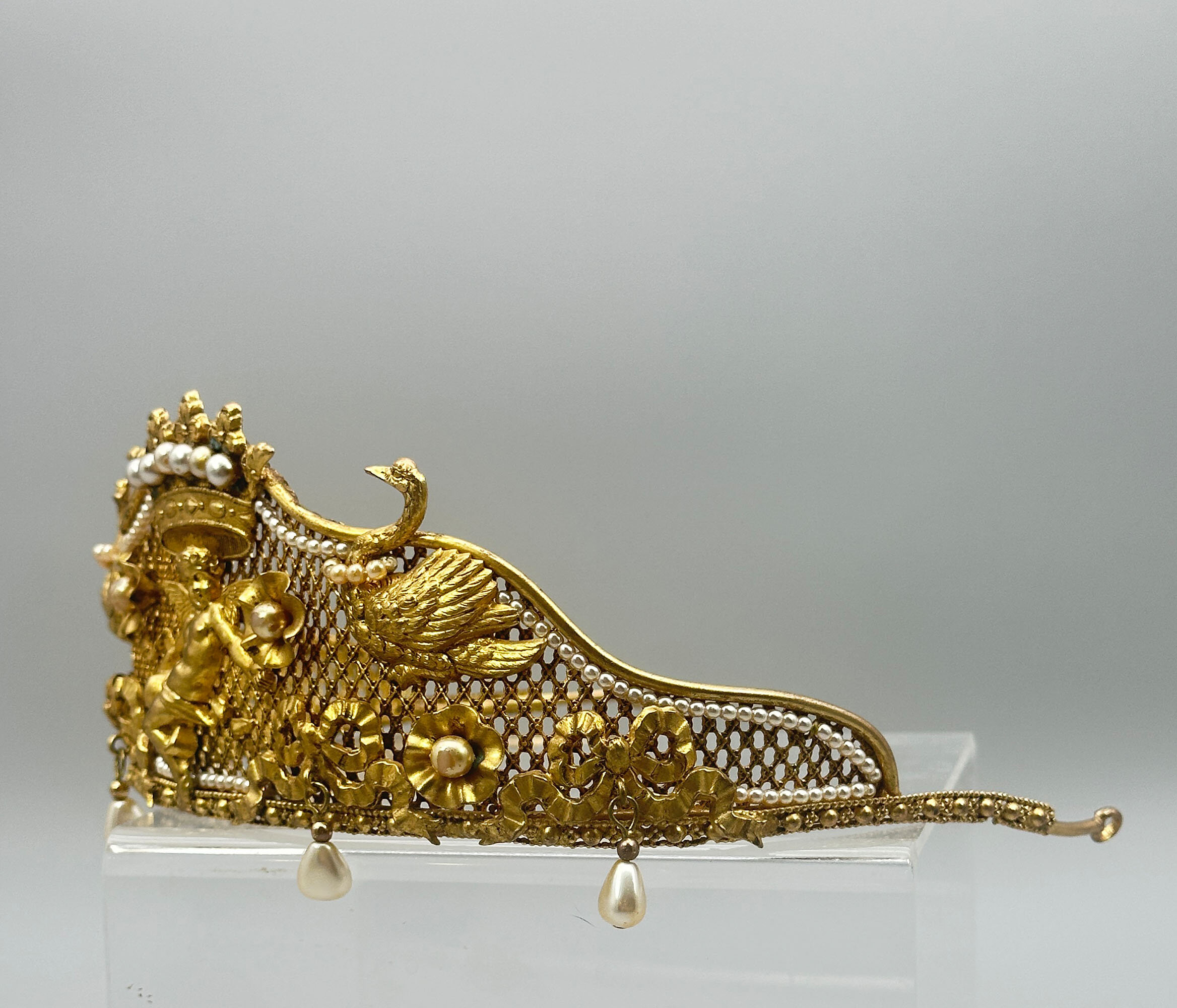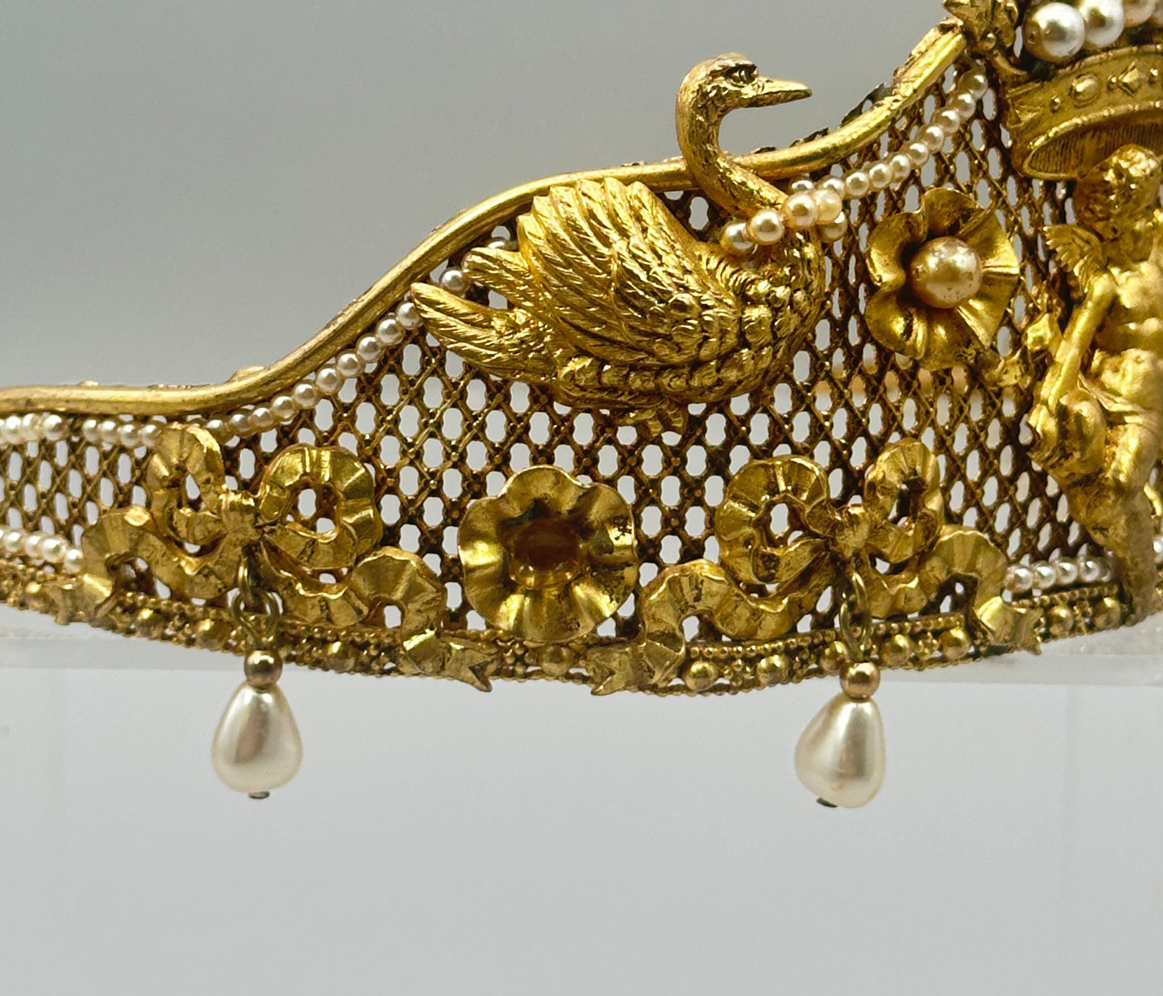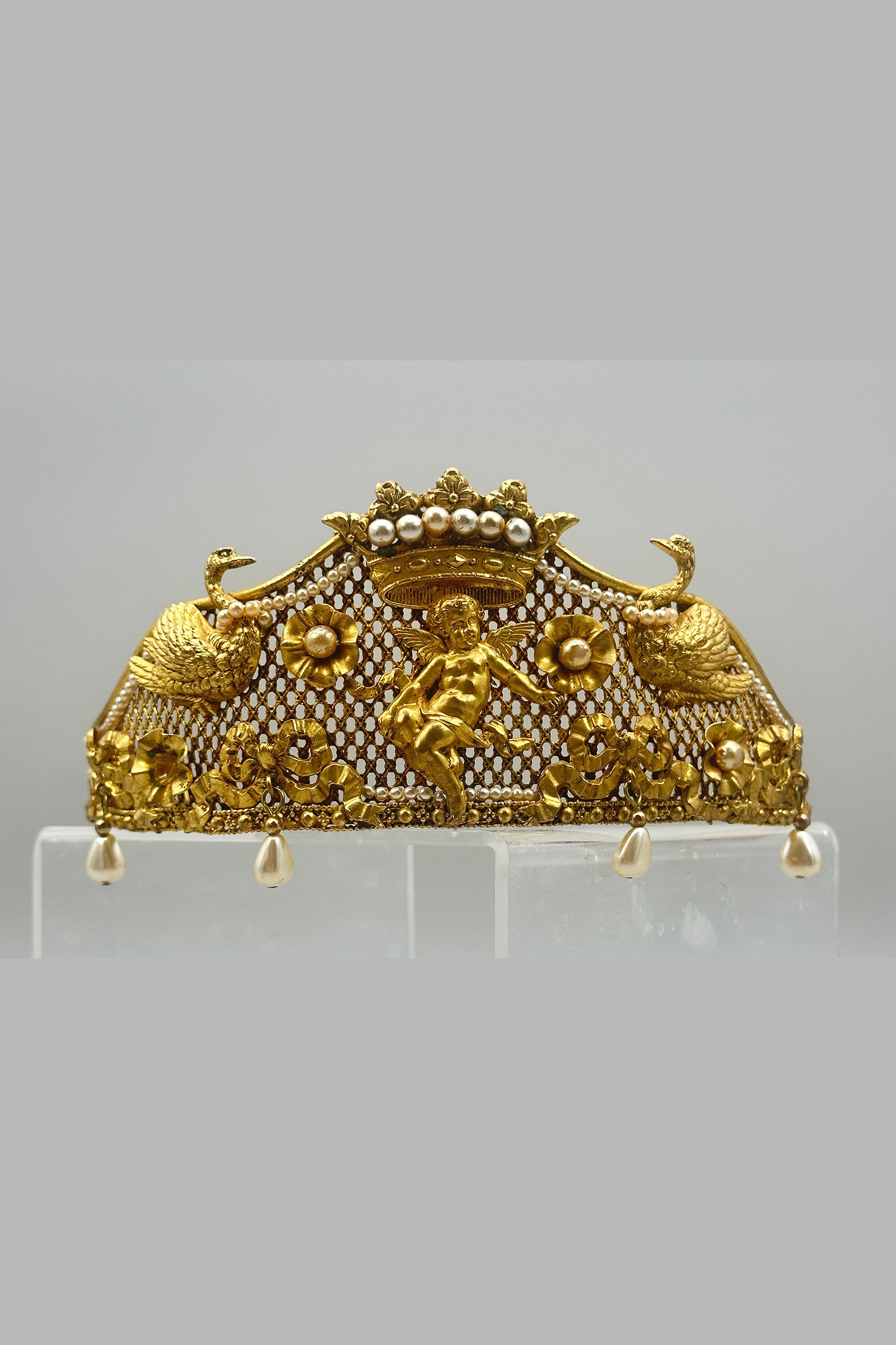 This is a very unusual piece of vintage Butler & Wilson from the 1980s. It is at the very least quite unique and it is possibly bespoke. It it extremely ornate and beautifully made with mounted festoons, putti and swans. It is finished with a large crown which is quintessential B & W. It is set with faux pearls. There are faux pearls that encircle the swans necks and hanging faux teardrop pearls along the edge. All this is built on a stiff mesh frame. It bears the Butler & Wilson mark.As most people who love costume jewellery know, Butler & Wilson have been and are a powerhouse British brand that have been designing costume jewellery since the 1970s. Pieces like this one are quite collectable due to their age and design. There are many collectors around the world that collect both vintage and new pieces. This one is for you!