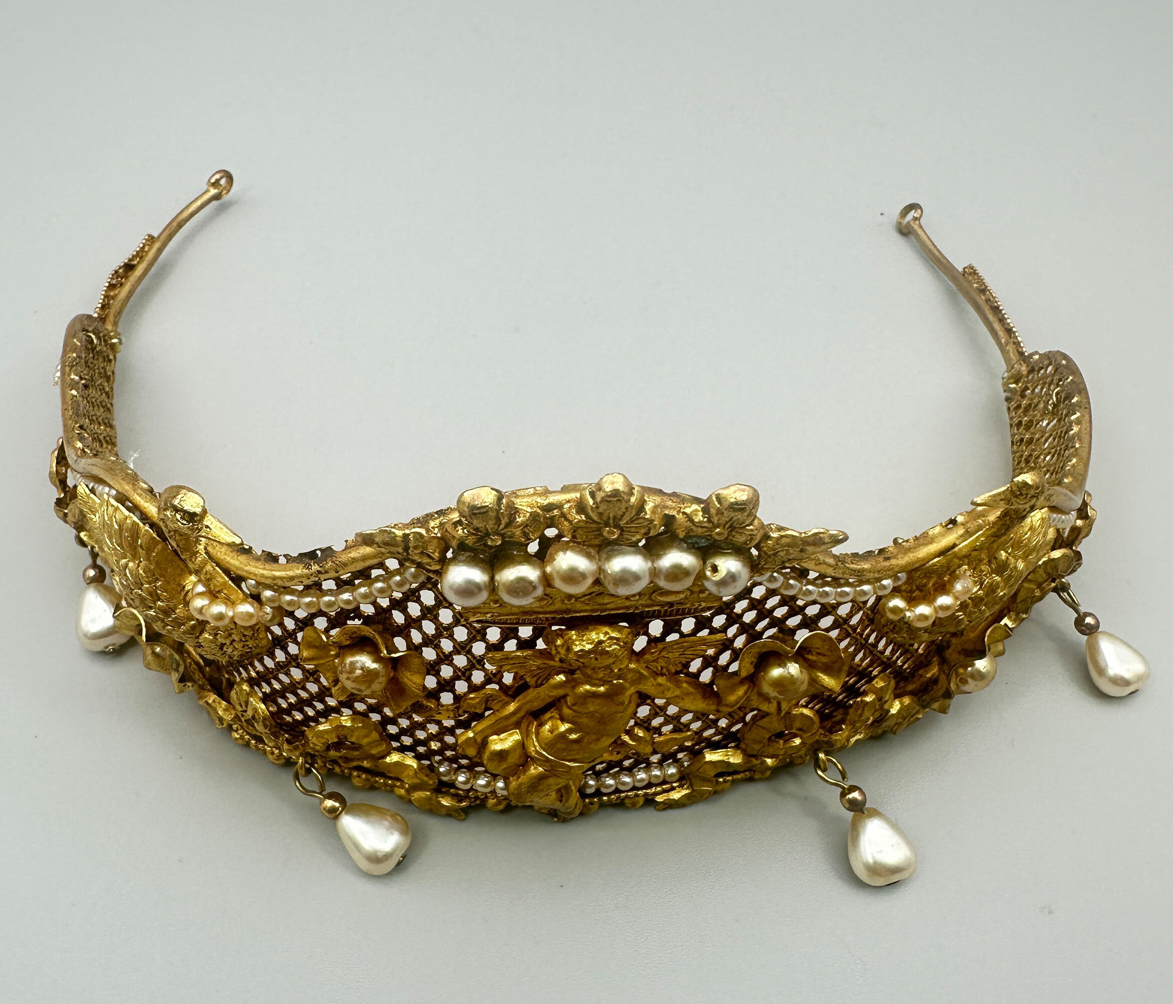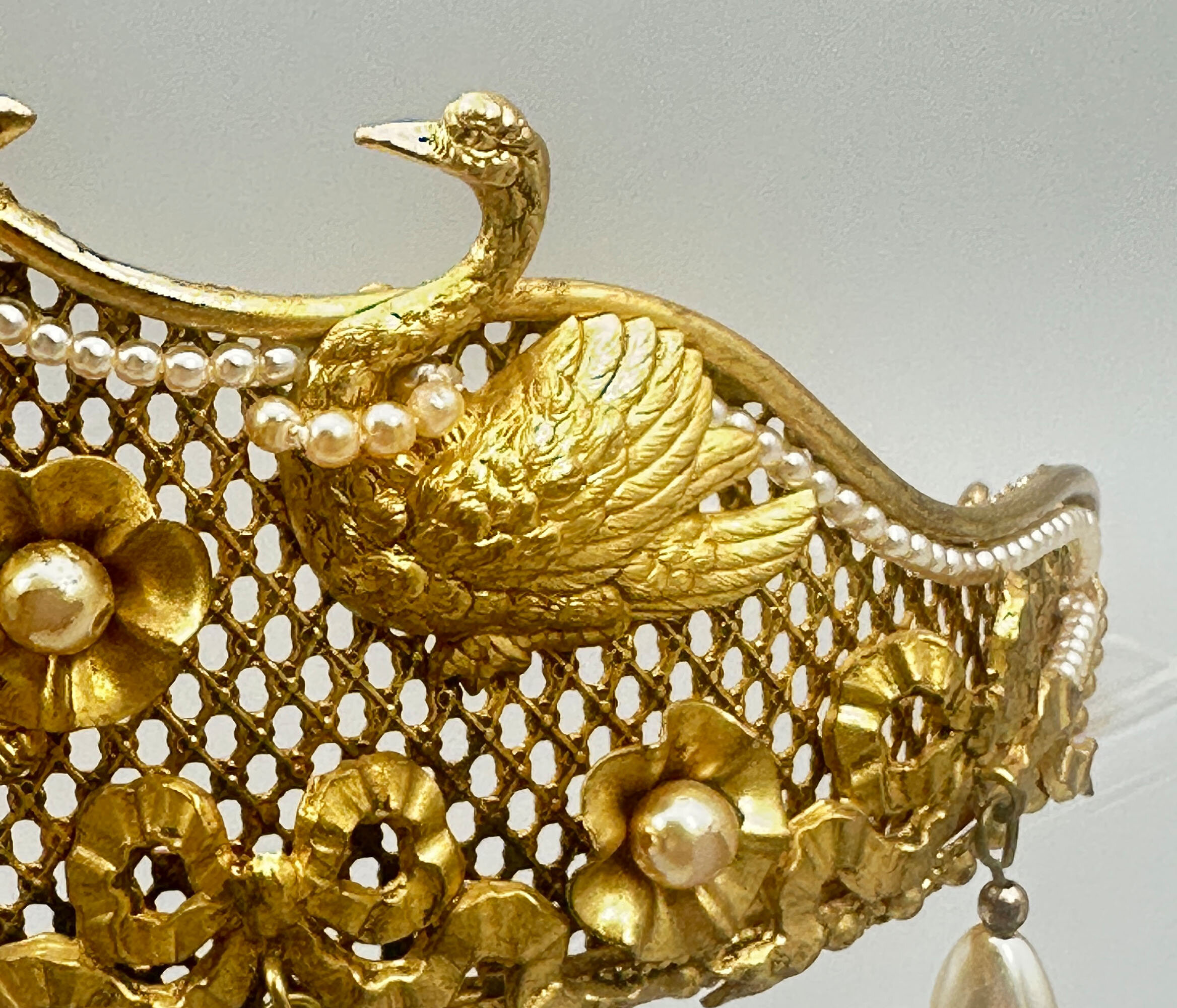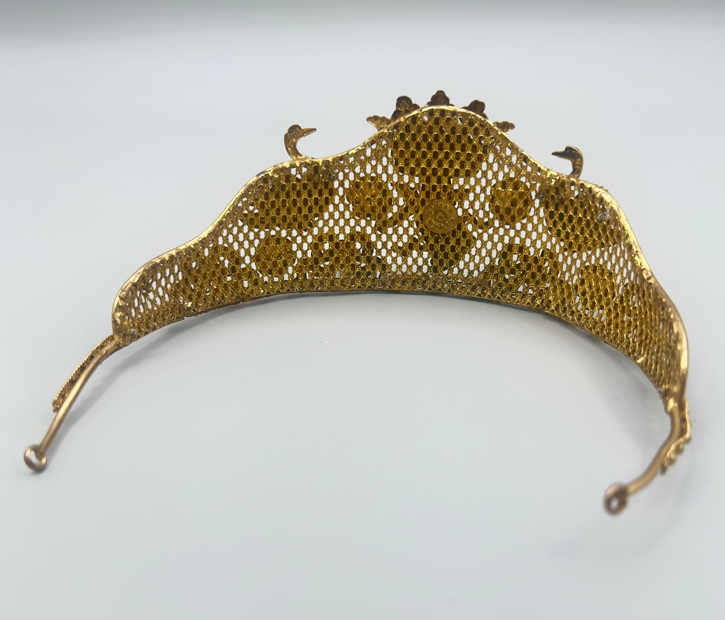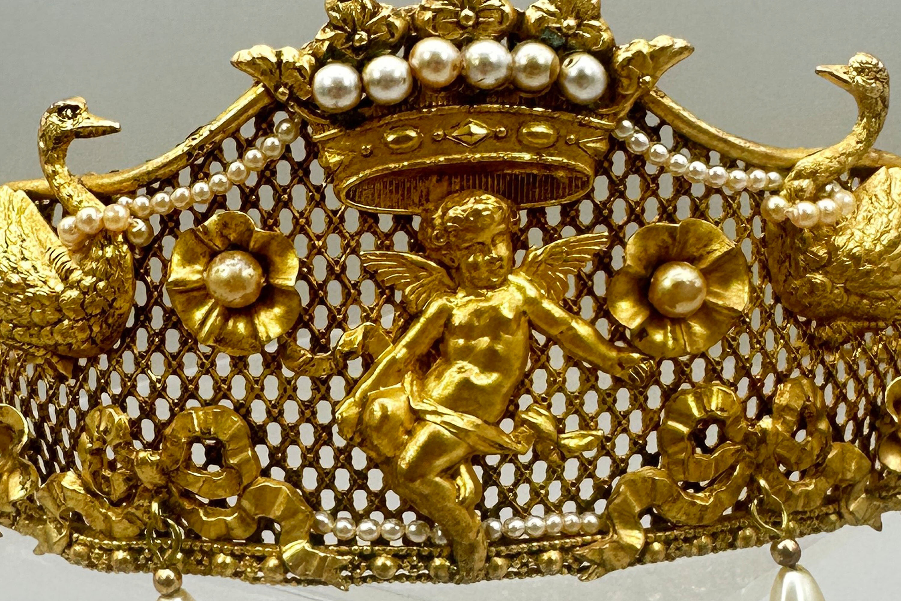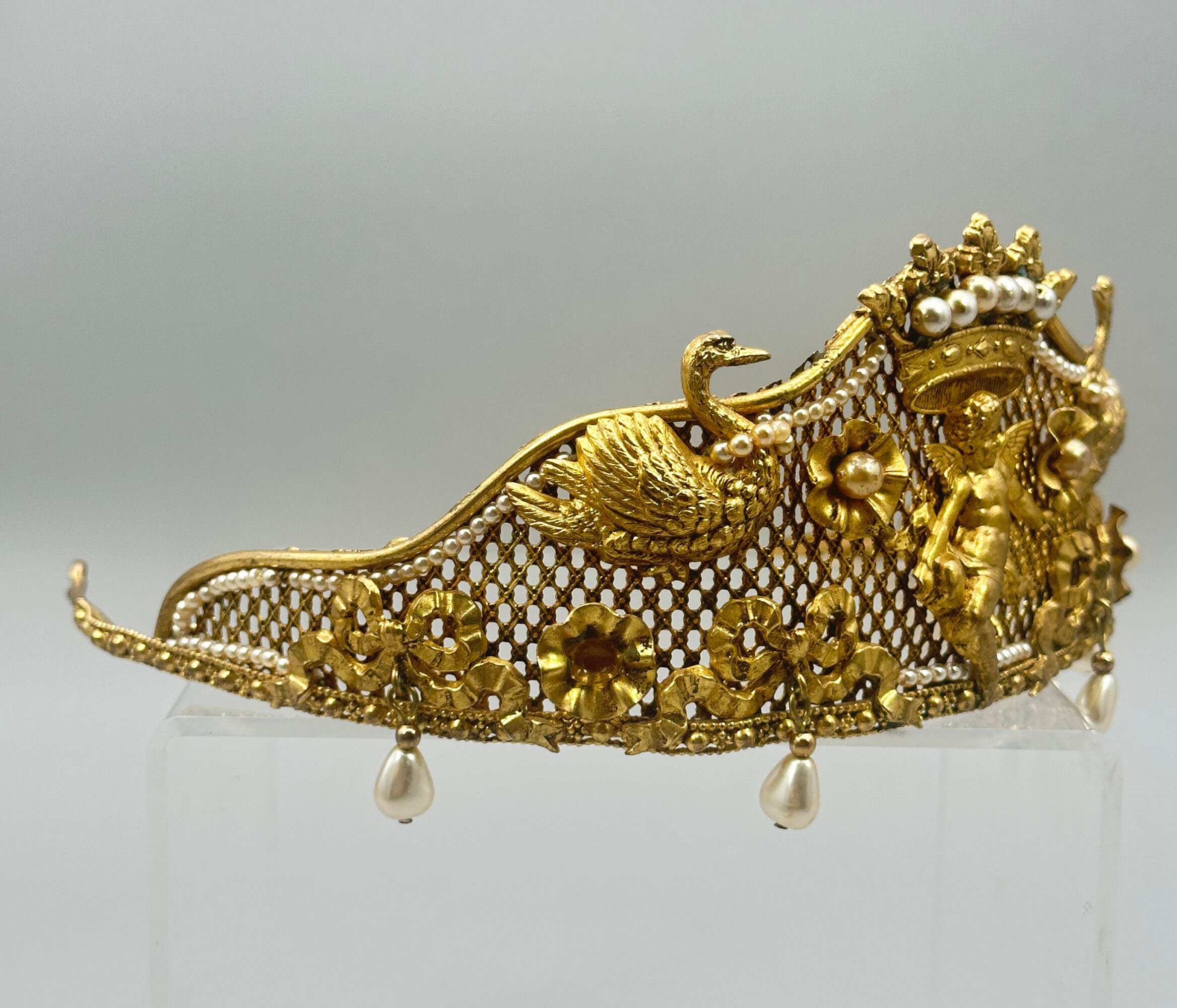 This is a very unusual piece of vintage Butler & Wilson from the 1980s. It is at the very least quite unique and it is possibly bespoke. It it extremely ornate and beautifully made with mounted festoons, putti and swans. It is finished with a large crown which is quintessential B & W. It is set with faux pearls. There are faux pearls that encircle the swans necks and hanging faux teardrop pearls along the edge. All this is built on a stiff mesh frame. It bears the Butler & Wilson mark.As most people who love costume jewellery know, Butler & Wilson have been and are a powerhouse British brand that have been designing costume jewellery since the 1970s. Pieces like this one are quite collectable due to their age and design. There are many collectors around the world that collect both vintage and new pieces. This one is for you!