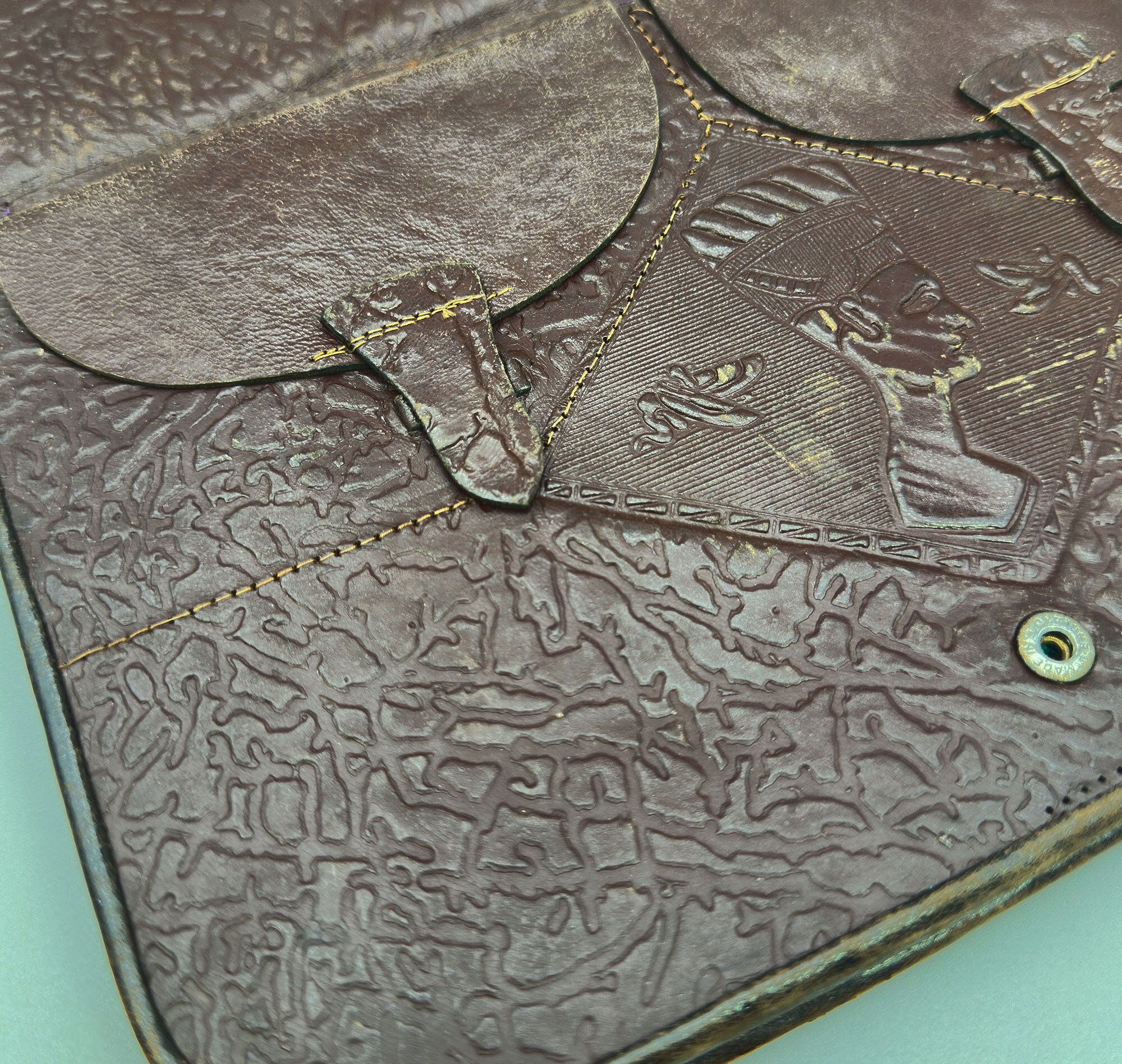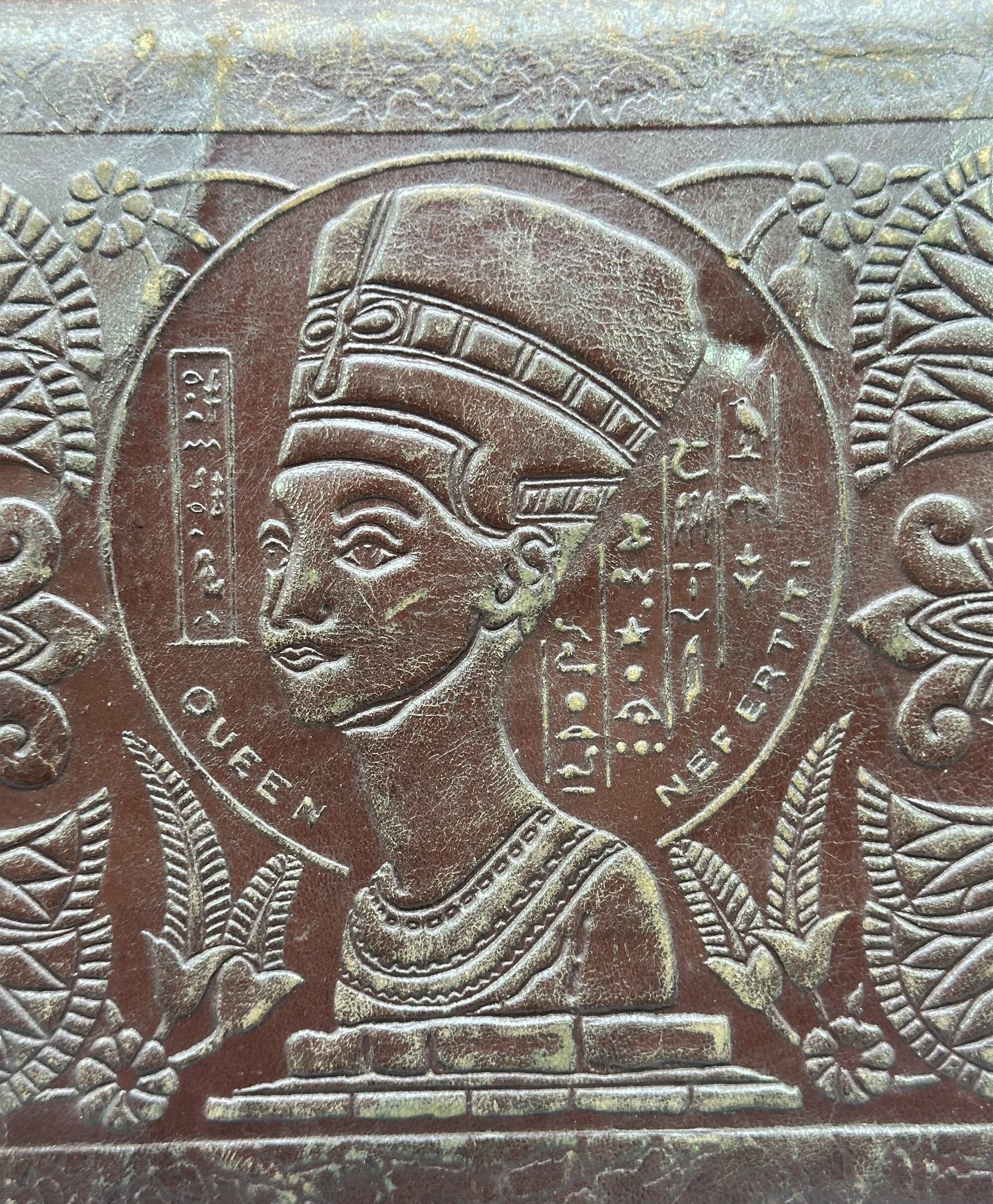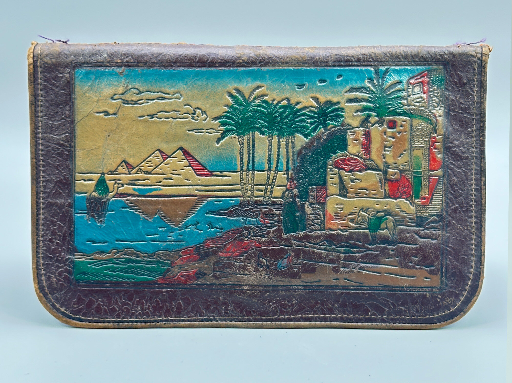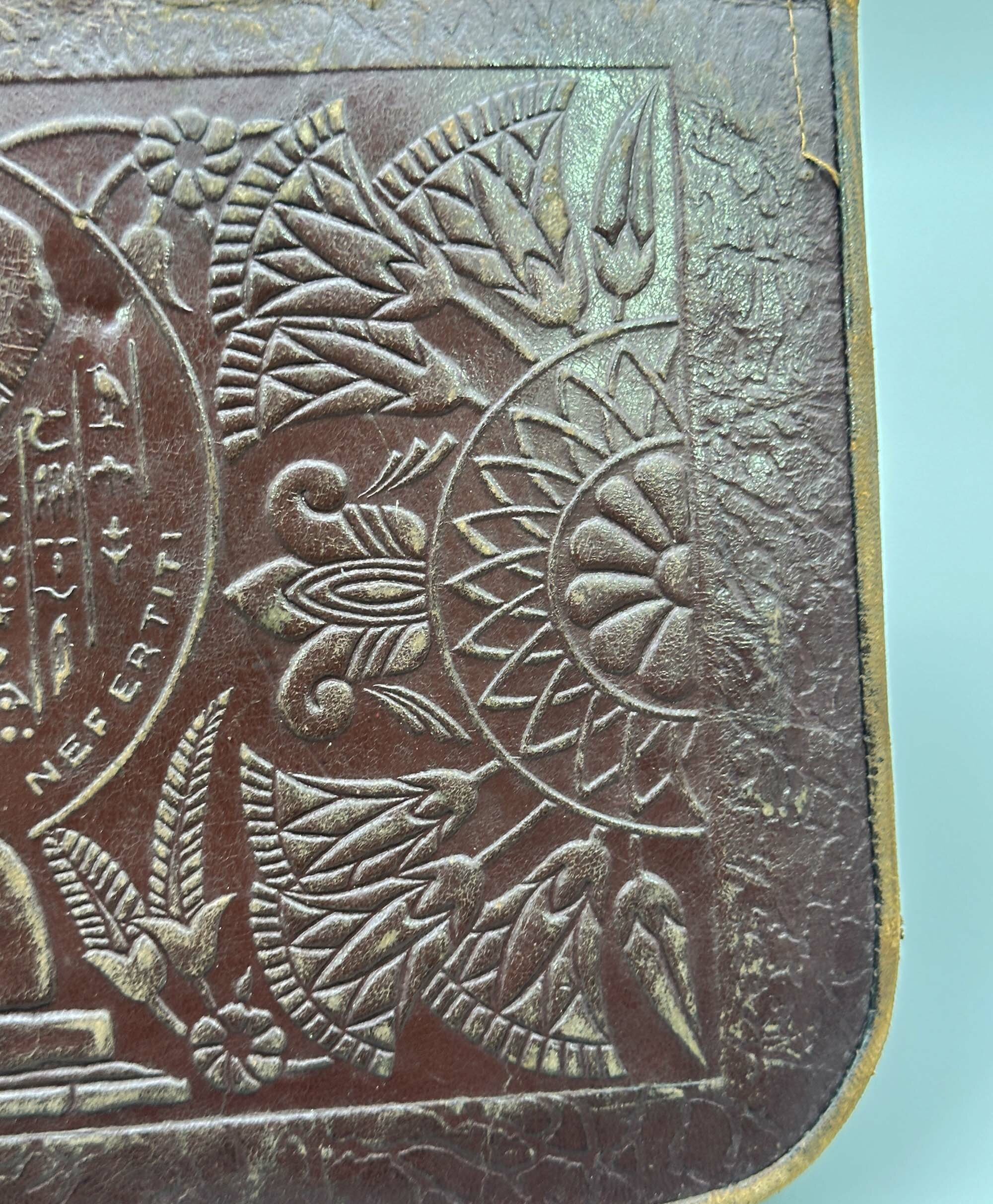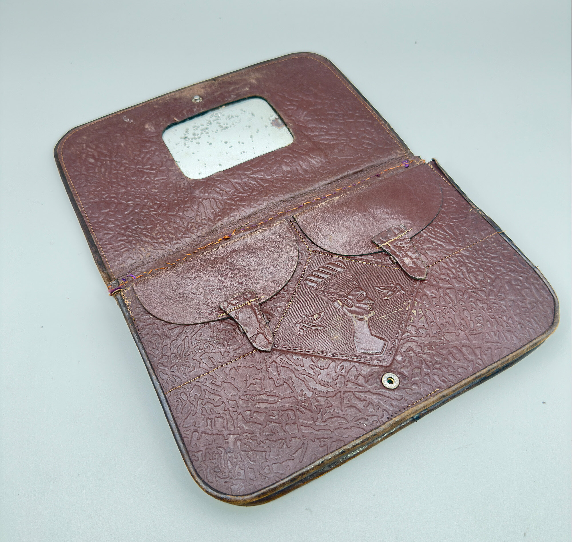 A brown leather clutch bag with tooled decoration of typical form, the front flap, with a popper fastening, folding over to cover the concertina interior which has three sections, one zipped, two strap fastened pockets to the bottom and a mirror set into the upper section. In addition, there is light brown stitching at the top, visible inside. The designs are classic ‘Egyptian Revival’ with a bust of Queen Nefertiti (named, and accompanied by hieroglyphs) surrounded by stylised palm leaves at the front and another bust of her in a diamond frame shape inside. The back of the bag has a coloured design depicting a rocky lakeside scene with pyramids in the distance, rather an idealised composition. Similar bags in a variety of forms seem to have been made in the 1940s as tourist souvenirs and this example survives in excellent condition given its age.| Size: | 25cm x 15.5cm x 2.5cm |
