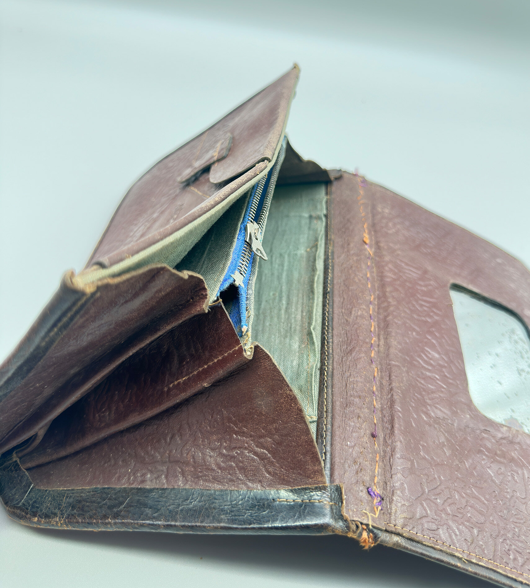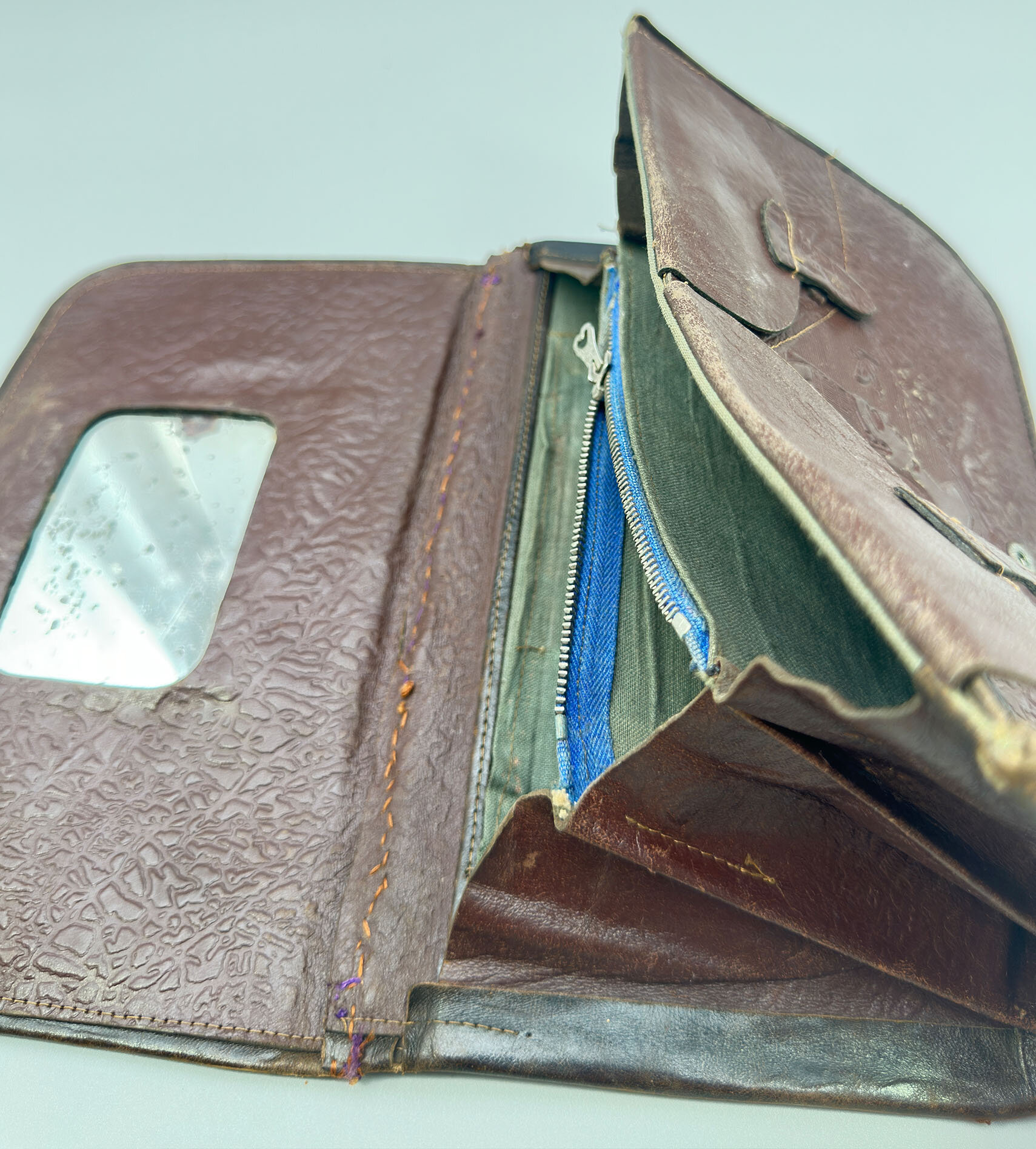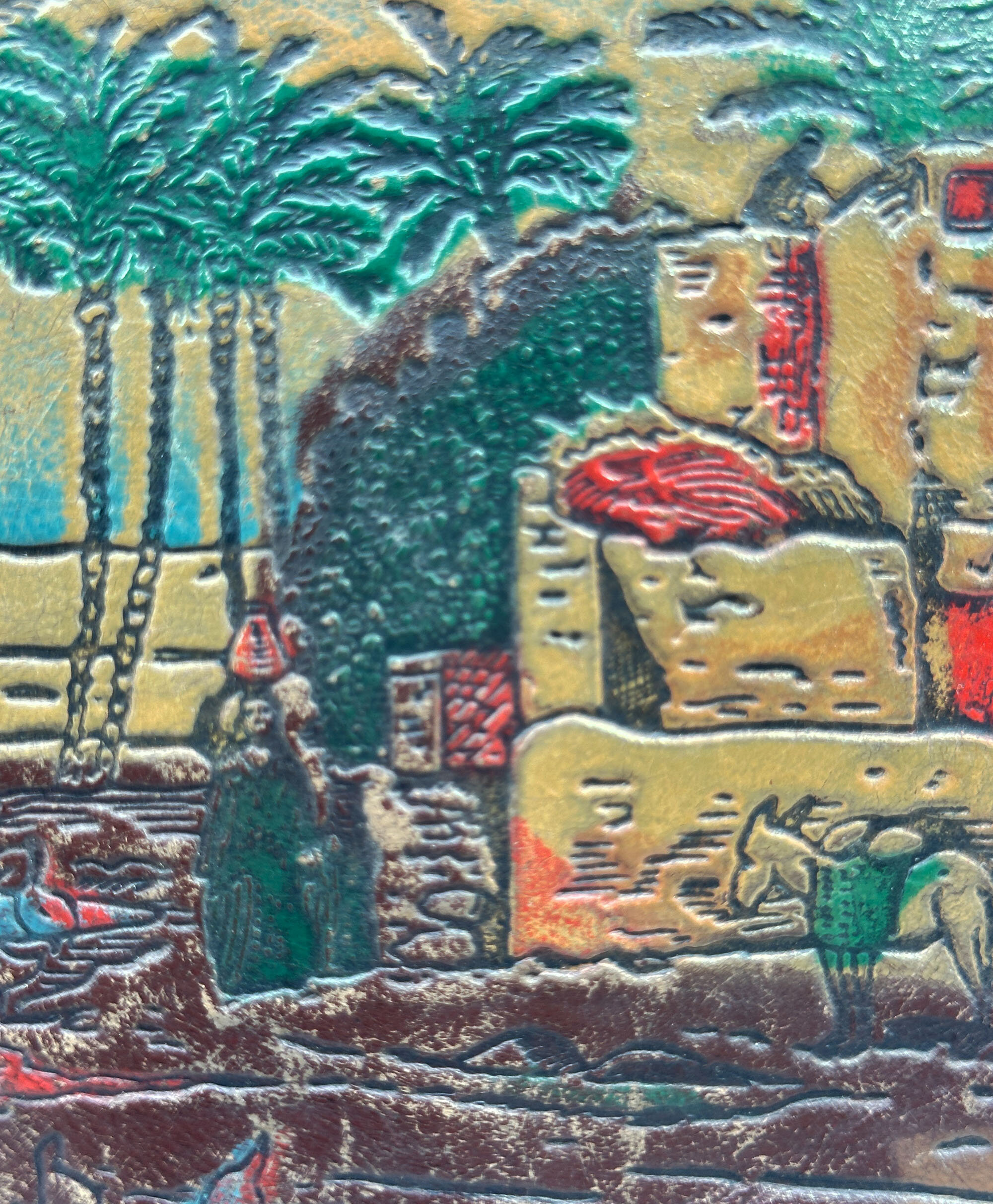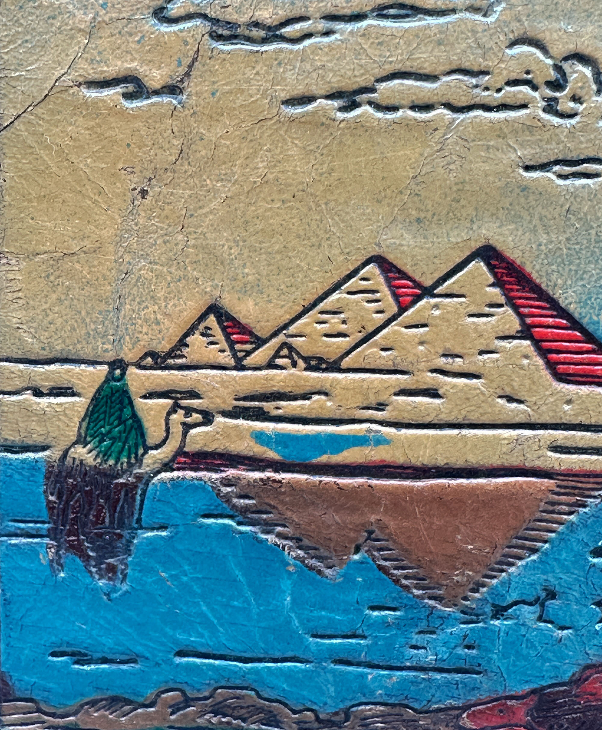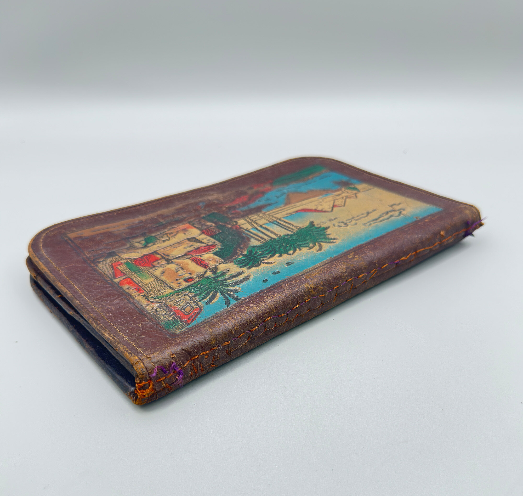 A brown leather clutch bag with tooled decoration of typical form, the front flap, with a popper fastening, folding over to cover the concertina interior which has three sections, one zipped, two strap fastened pockets to the bottom and a mirror set into the upper section. In addition, there is light brown stitching at the top, visible inside. The designs are classic ‘Egyptian Revival’ with a bust of Queen Nefertiti (named, and accompanied by hieroglyphs) surrounded by stylised palm leaves at the front and another bust of her in a diamond frame shape inside. The back of the bag has a coloured design depicting a rocky lakeside scene with pyramids in the distance, rather an idealised composition. Similar bags in a variety of forms seem to have been made in the 1940s as tourist souvenirs and this example survives in excellent condition given its age.| Size: | 25cm x 15.5cm x 2.5cm |
