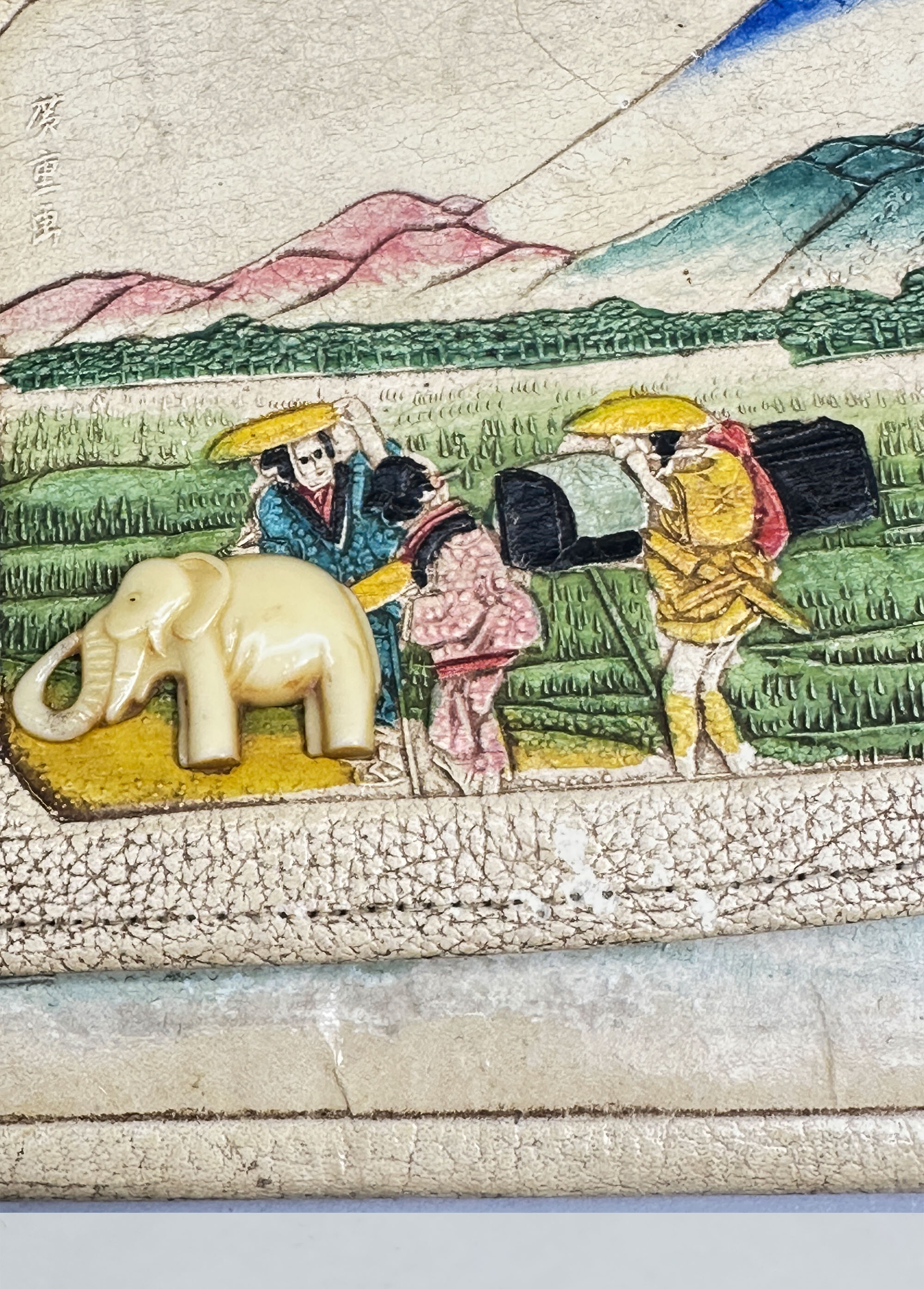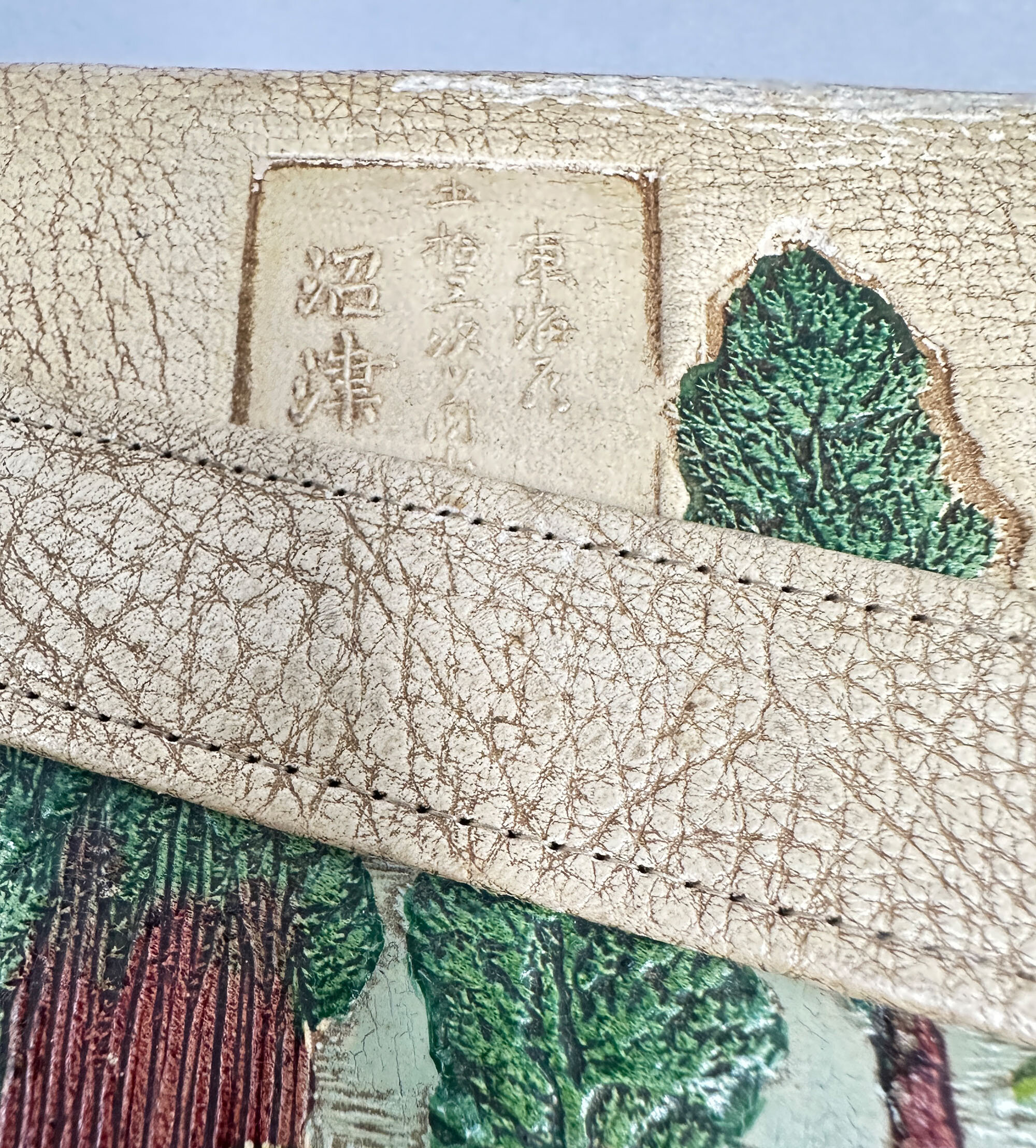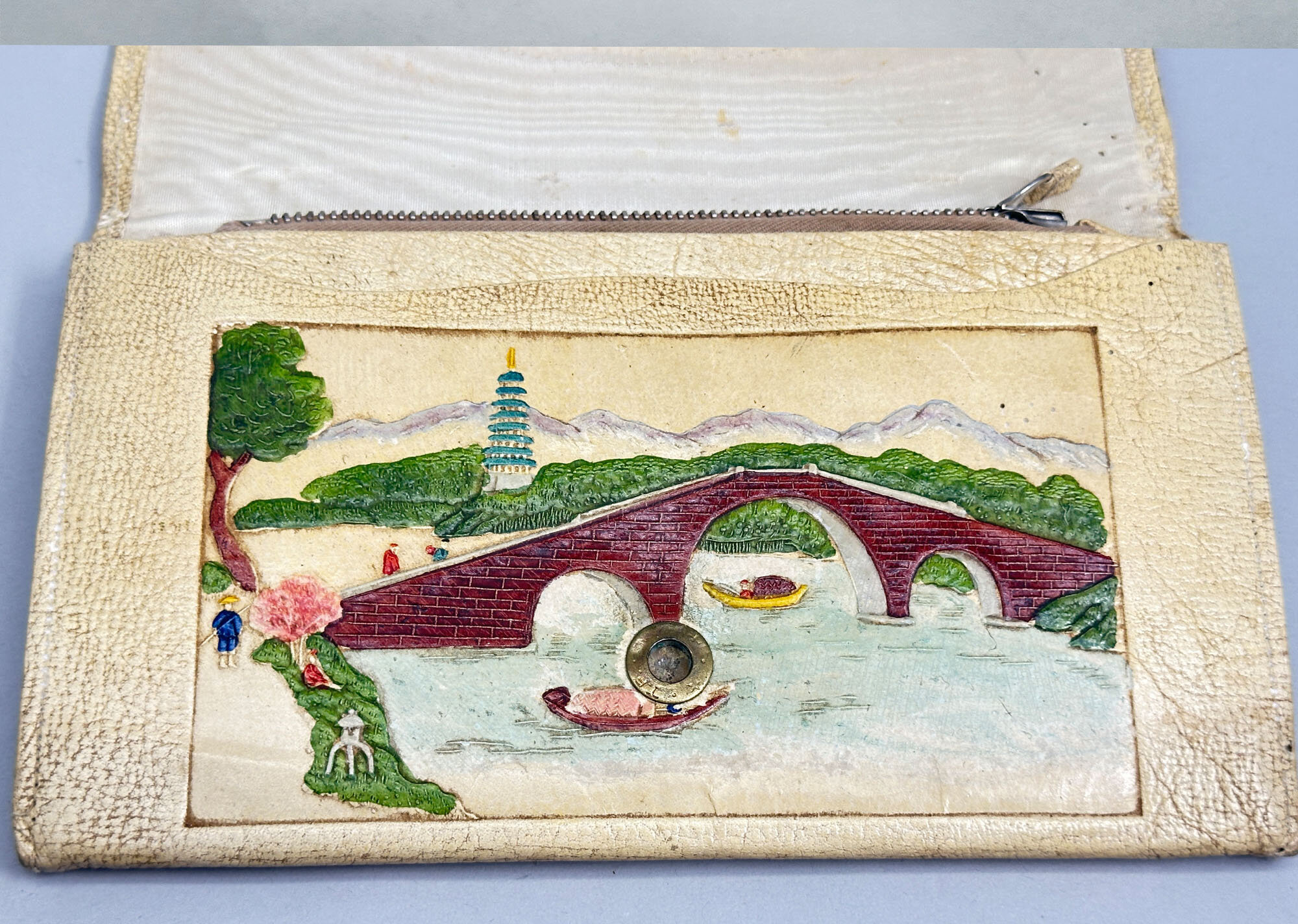 This is another clutch bag with an Japanese twist. The form is again typical, a rectangular wallet with a flap cover and two interior compartments between a zipped central bag, the rear compartment with a fabric pocket, all finished in beige silk with leather concertina sides. The body of the bag is in mustard leather with elaborate tooled and coloured designs, the front flap with two panels, one square and one rectangular, the first with buildings by a lake and the second with figures in a rice field with Mount Fuji in the background, the surface underneath with a bridge over a river with mountains and a pagoda in the distance, the back, which also has a diagonal holding strap, with a riverside scene, trees on both the banks and three figures making their way along an adjoing path. The flap is secured by a large popper with a celluloid elephant at the bottom edge. The workmanship here is obvious and the bag, which probably dates, like others similar, to the 1930s has survived in good condition, to be enjoyed and perhaps used today like its counterpart.| Size: | Width 21cm, Ht 12.3cm, Depth 1.5cm |