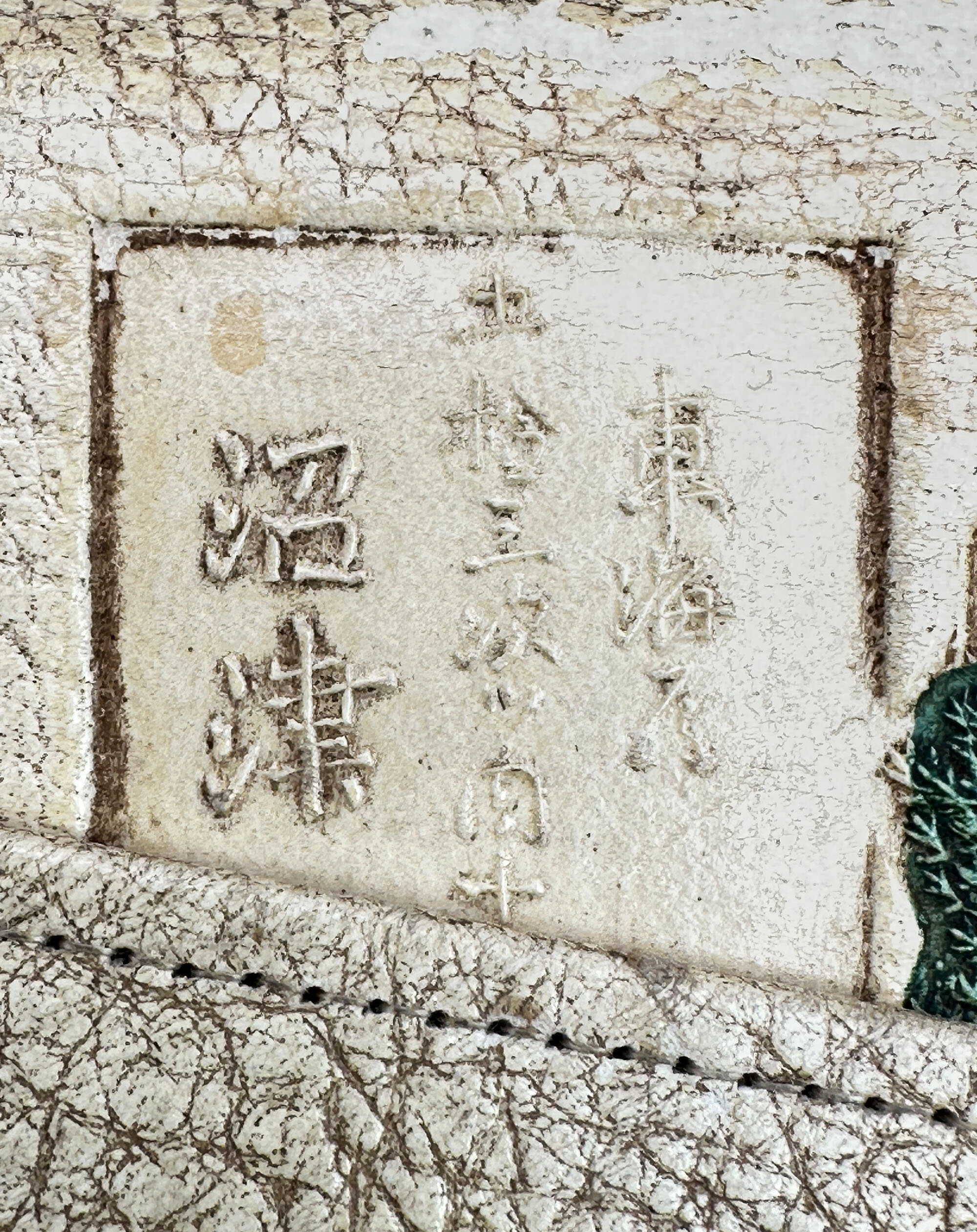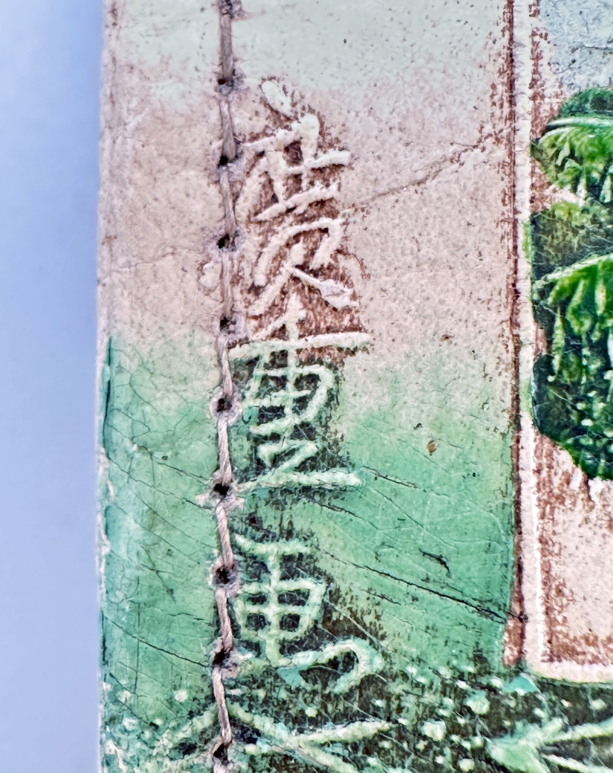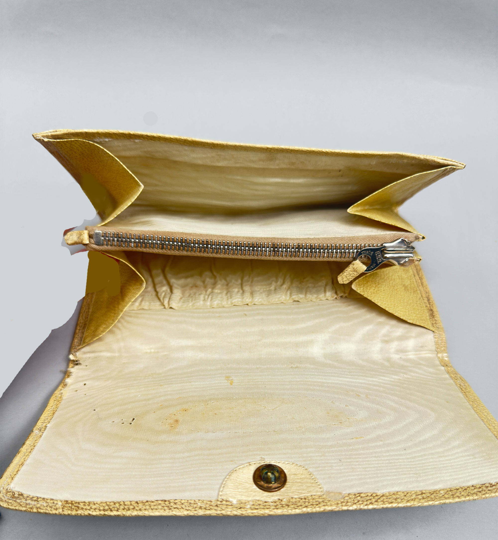 This is another clutch bag with an Japanese twist. The form is again typical, a rectangular wallet with a flap cover and two interior compartments between a zipped central bag, the rear compartment with a fabric pocket, all finished in beige silk with leather concertina sides. The body of the bag is in mustard leather with elaborate tooled and coloured designs, the front flap with two panels, one square and one rectangular, the first with buildings by a lake and the second with figures in a rice field with Mount Fuji in the background, the surface underneath with a bridge over a river with mountains and a pagoda in the distance, the back, which also has a diagonal holding strap, with a riverside scene, trees on both the banks and three figures making their way along an adjoing path. The flap is secured by a large popper with a celluloid elephant at the bottom edge. The workmanship here is obvious and the bag, which probably dates, like others similar, to the 1930s has survived in good condition, to be enjoyed and perhaps used today like its counterpart.| Size: | Width 21cm, Ht 12.3cm, Depth 1.5cm |