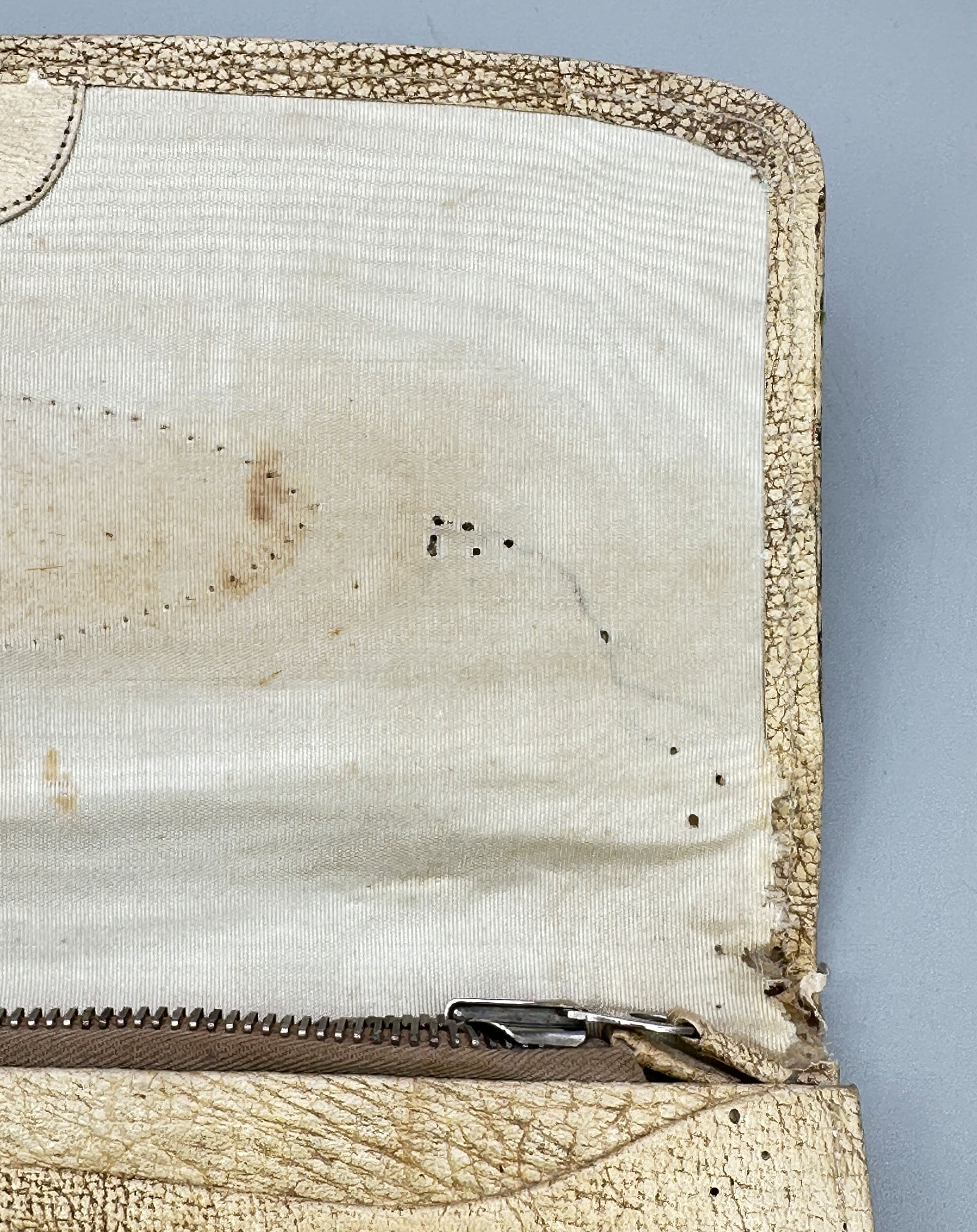 | Condition: | Fair vintage condition, the reverse of the flap possibly missing an original oval mirror, pinprock holes to same and slight damage at the bottom right (see image 12), slight scuffing at the back (see image 13) |