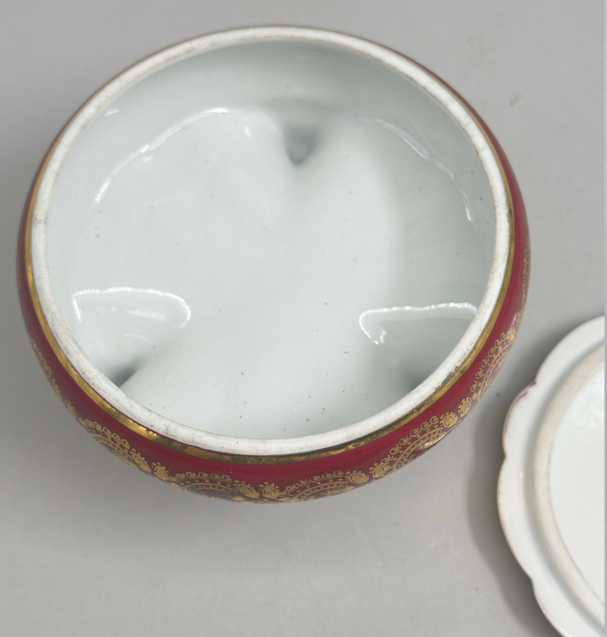 A group of three contrasting powder boxes all probably dating to the mid twentieth century. (1) Gilt metal with elaborate stylised floral designs, the lid with a petit point floral tapestry, English (2) Alabaster with a design of roses to the lid, Italian (3) Porcelain with a courting couple depicted on the lid, deep red ground with gilt floral decoration and gilt tripod feet, French, Limoges and marked underneath ‘Table et Décor’ ‘LIMOGES’ ‘FRANCE’.| Size: | (1) Ht (max) 4.3cm, Diam (max) 8.3cm (2) Ht (max) 4.8cm, Diam (max) 6.5cm (3) Ht 8.5cm (max), Diam (max) 10cm |