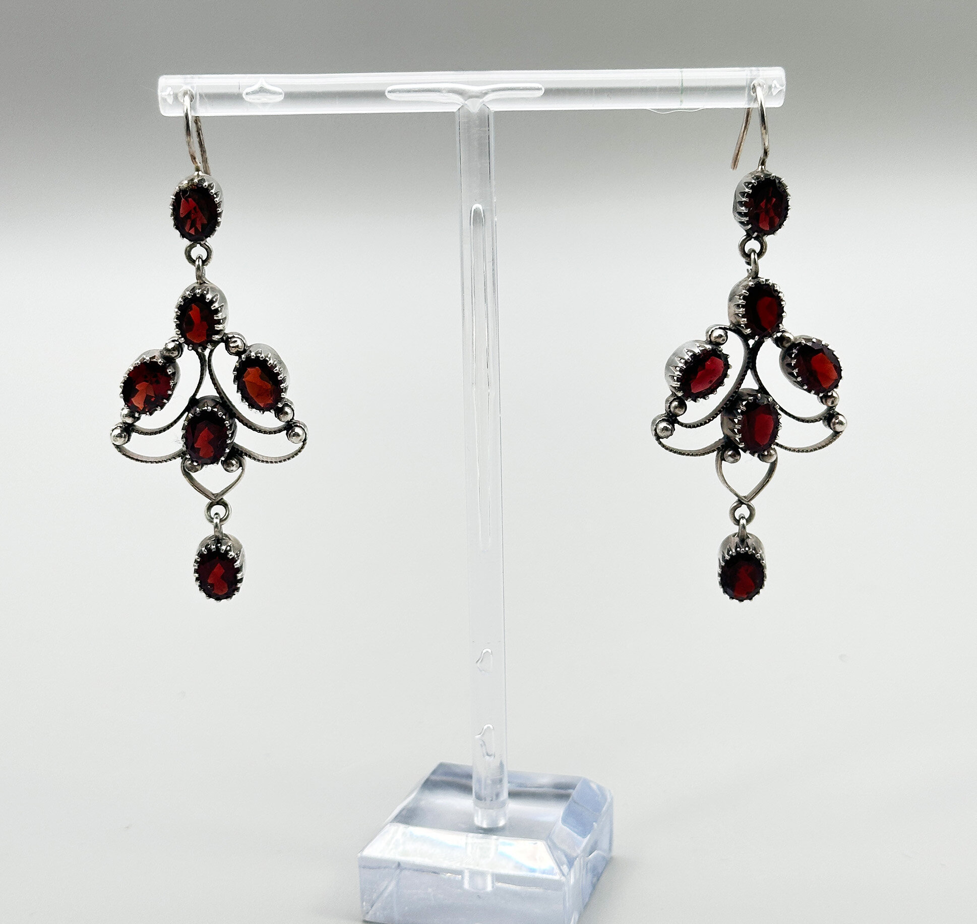 This is a dramatic pair of earrings in a chandelier design. They each have six large very high quality prong set garnets set in silver. They are unmarked and are most likely Italian in origin.| Size: | Each earring measures Height 59.6 mm Width 22.5 mm, stones are uniform in size and are 6 x 8 mm |