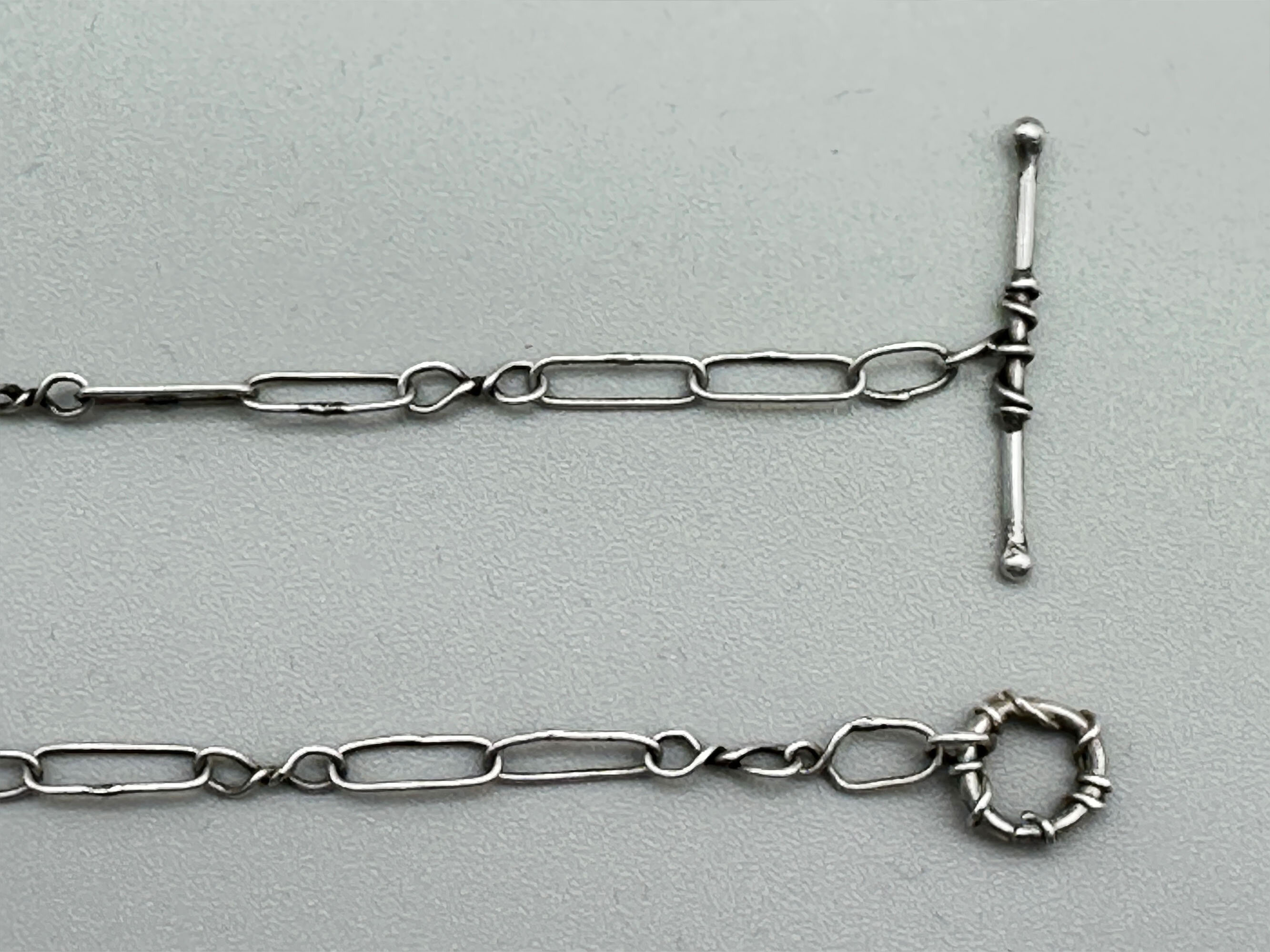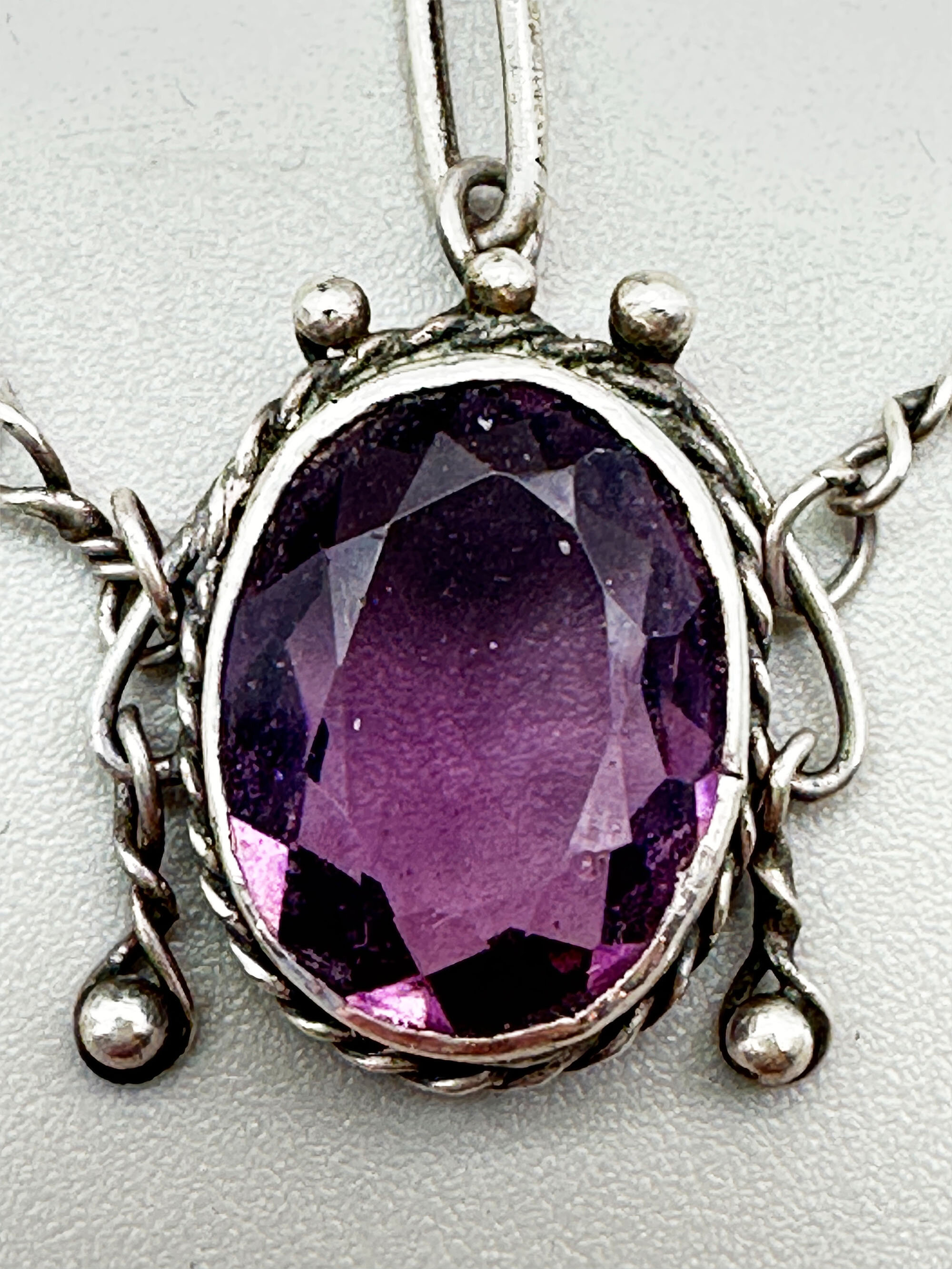 This is a rare necklace that has be very recongnisable Arts and Crafts design. It is set with three moonstones and one large amethyst. it has a twisted link design with a matching t bar clasp. It is umarked but is most likely English.| Size: | 37 cm long, Amethyst is 11.8 x 15.1 mm |
