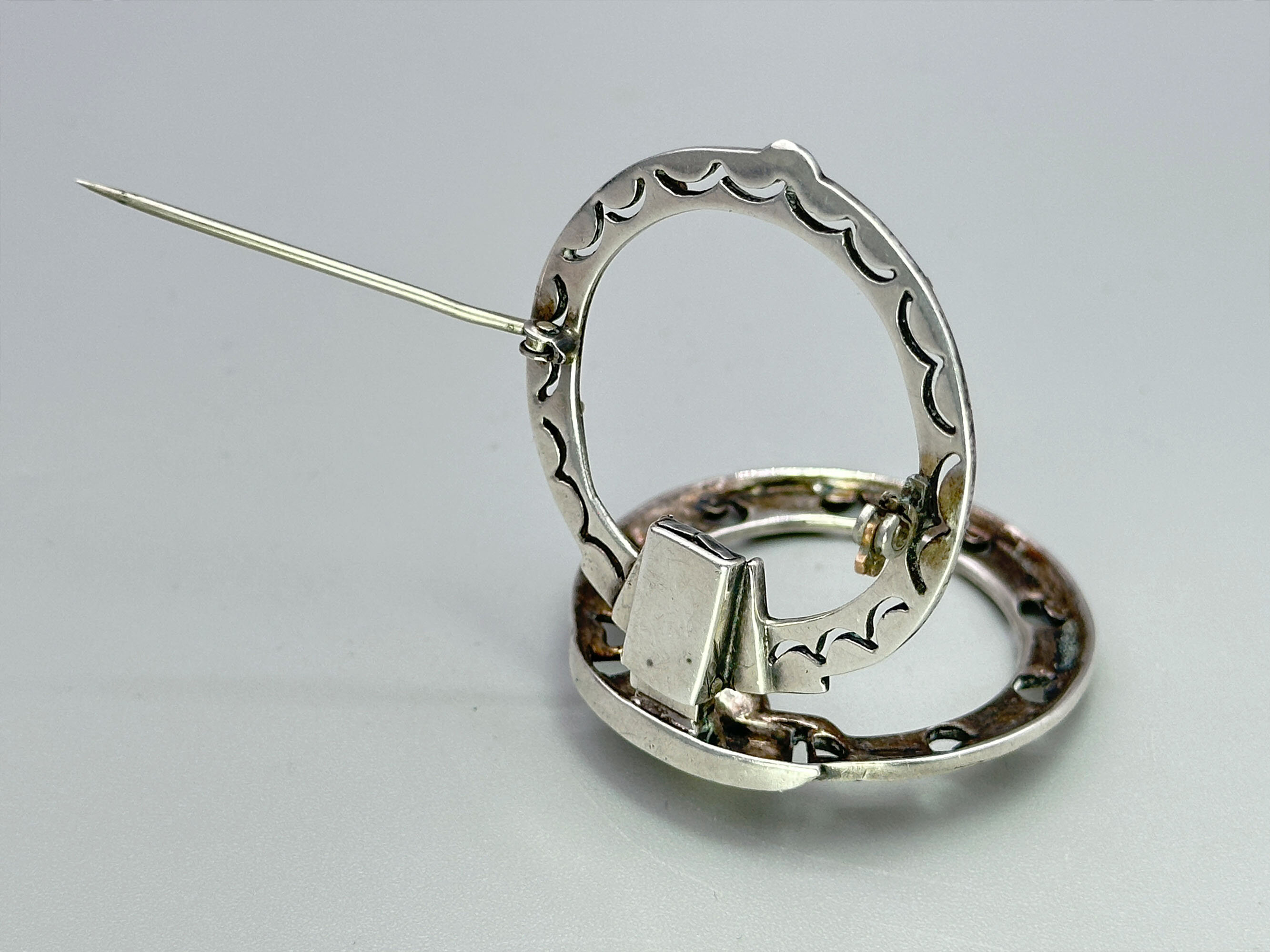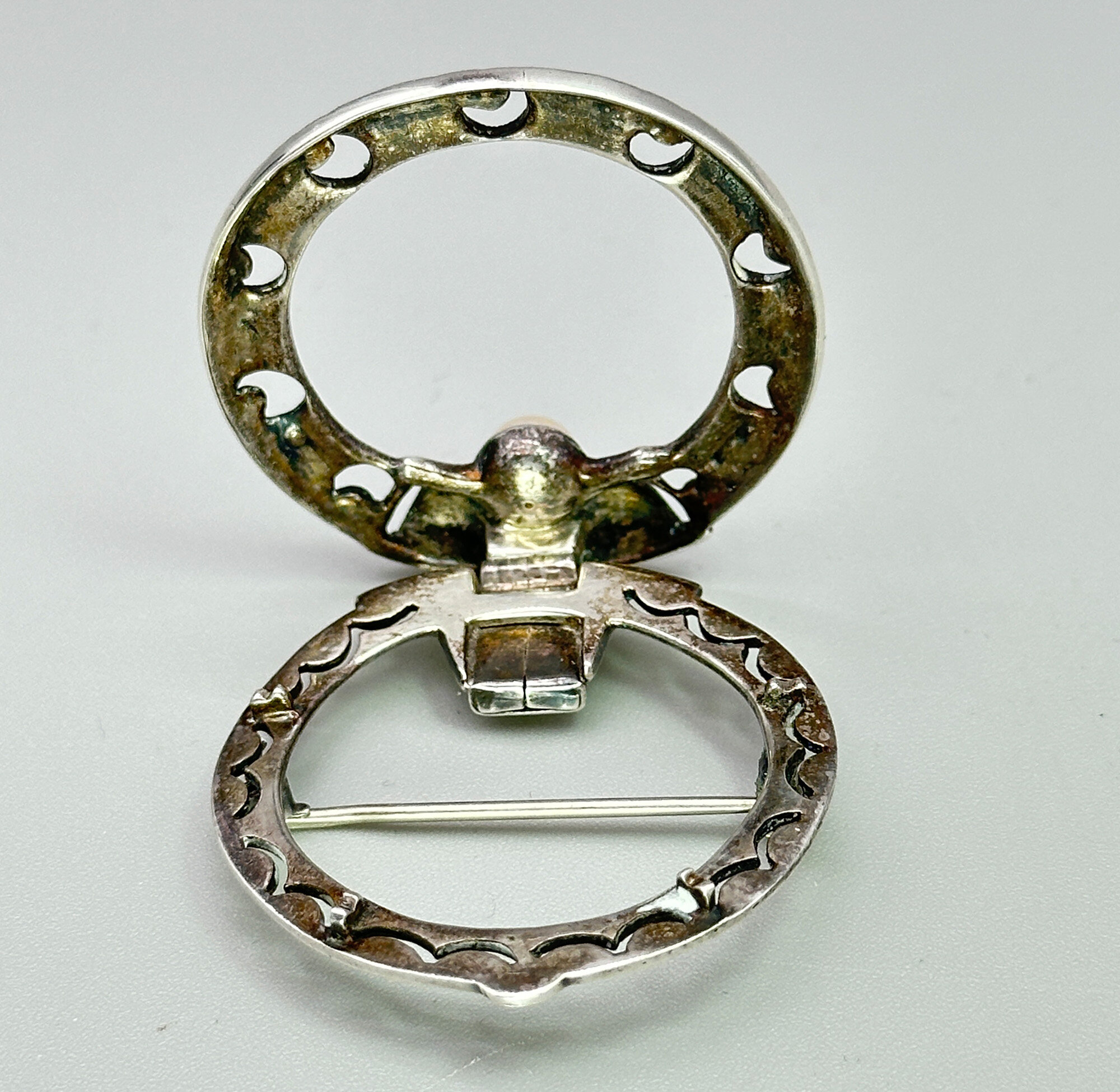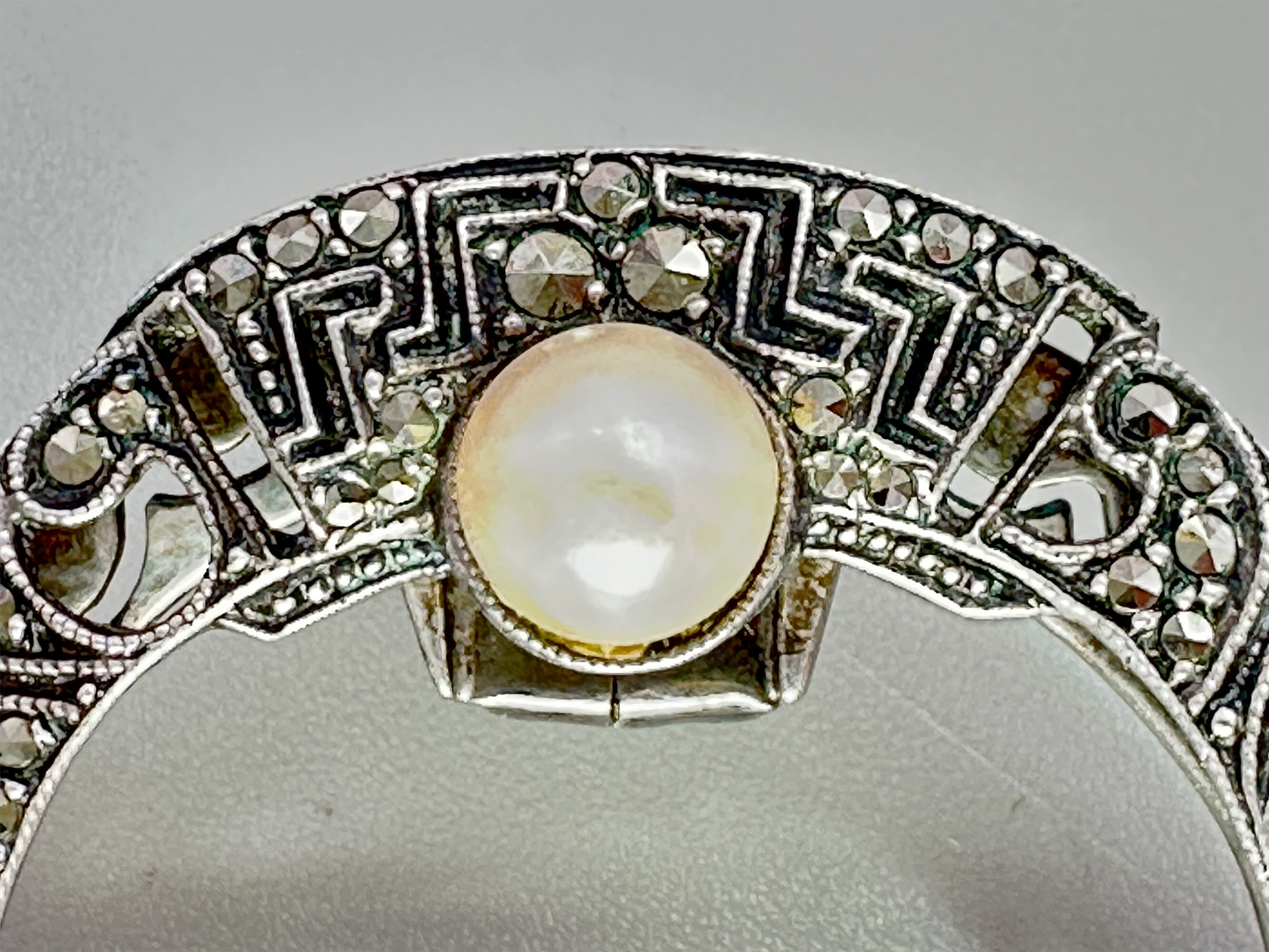 This is a silver brooch or dess clip set with a real pearl and marcasite stones. It is unmarked. The main part of the brooch is silver and clip is most likely white metal. It is most likley American.| Size: | 39.7 mm diameter |