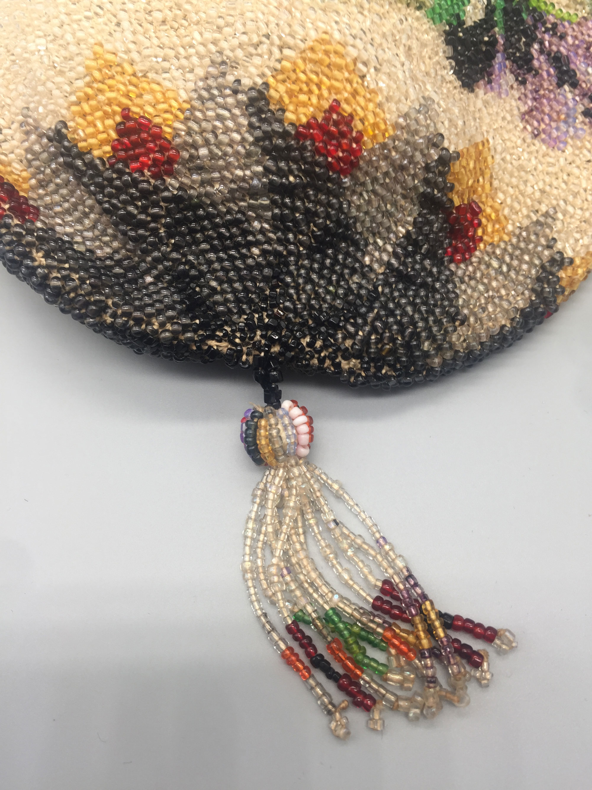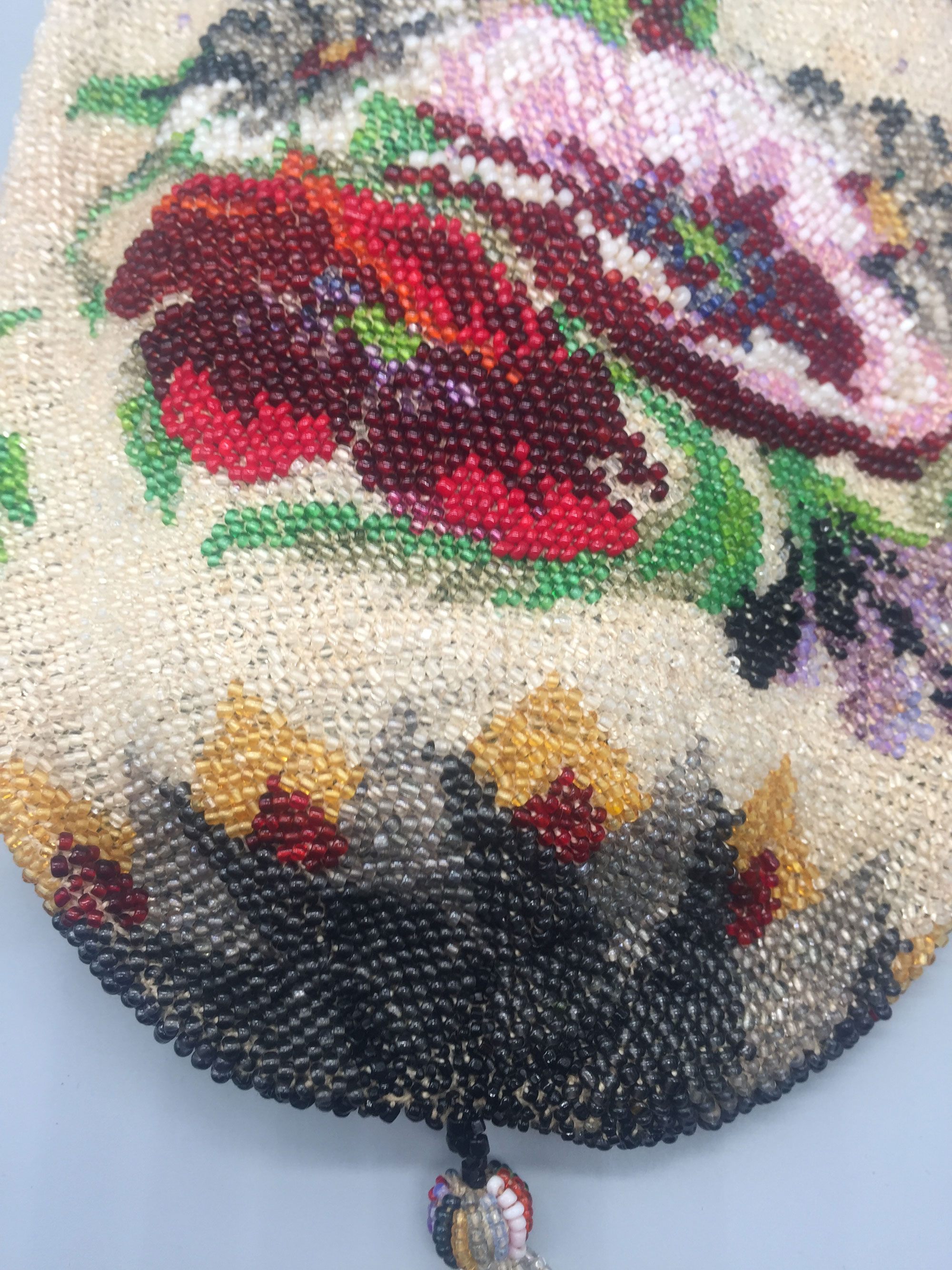 Early Victorian beaded bag, floral motif on white ground, lined in green taffeta| Size: | 22 x 16 cm |