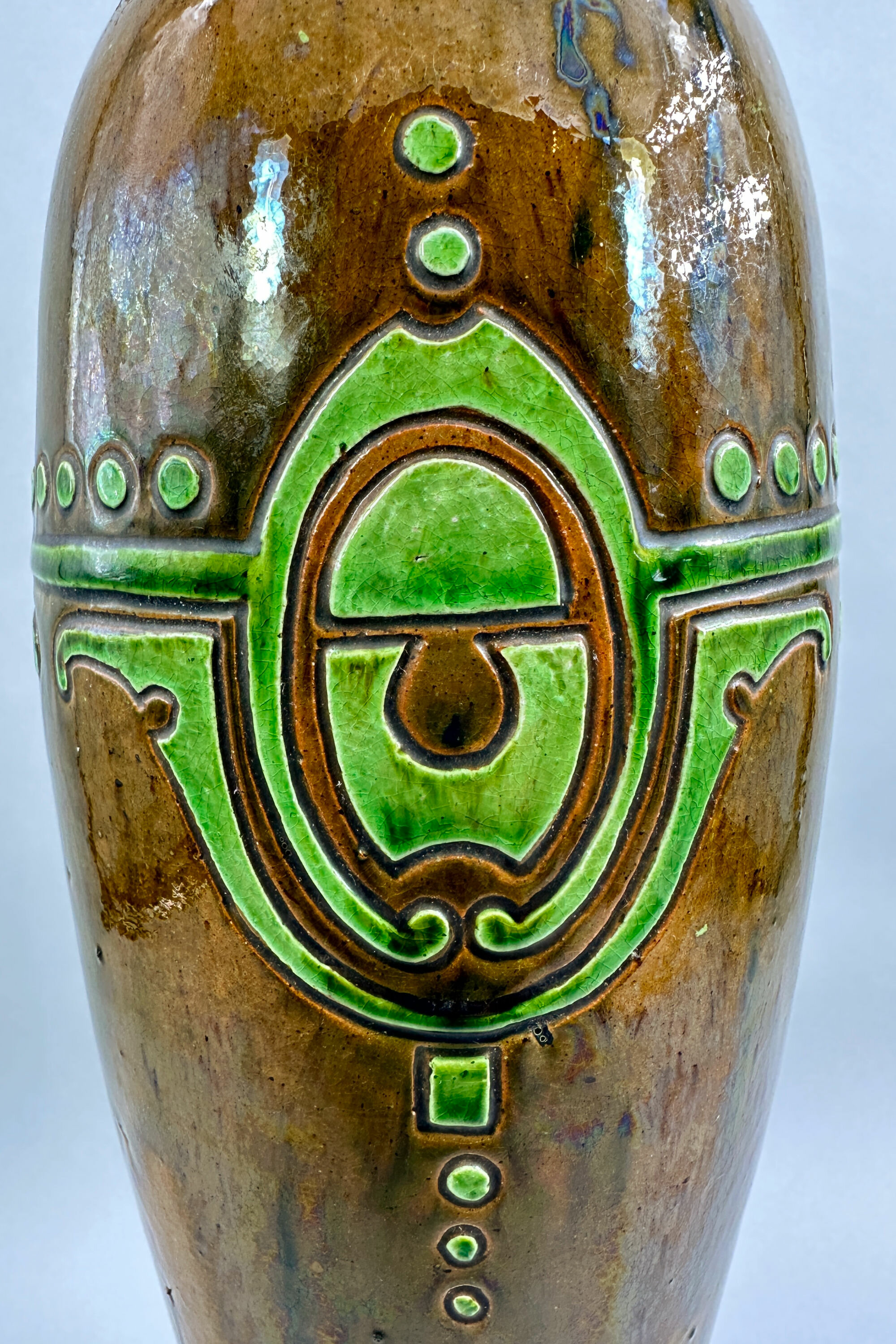 An Art pottery Vase of slender ovoid form, narrowing slightly towards the base and with a short everted rim, the body splash glazed in brown with raised geometric motifs and bead work in green, the base with a blue green glaze and a repeating geometric design again in green incorporating rectangular motifs and bead work, the foot also glazed in a blue green glaze.The style of decoration suggests Art Nouveau designs but there are no obvious parallels. Continental manufacture seems likely, perhaps France or Germany.