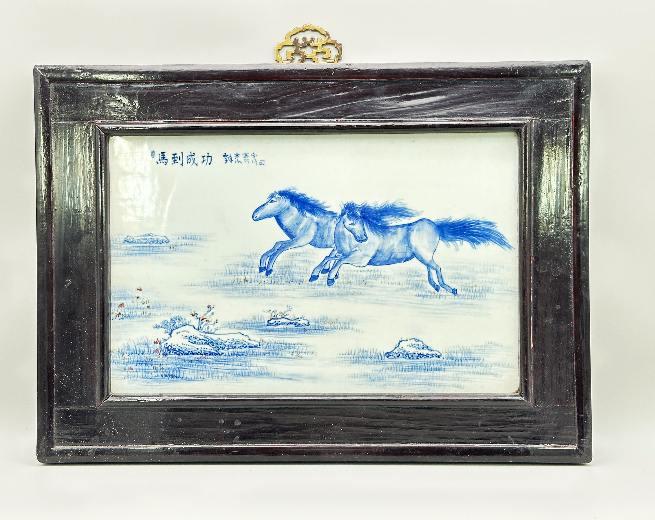 Chinese blue and white porcelain Plaque with two horses, framed, C20th