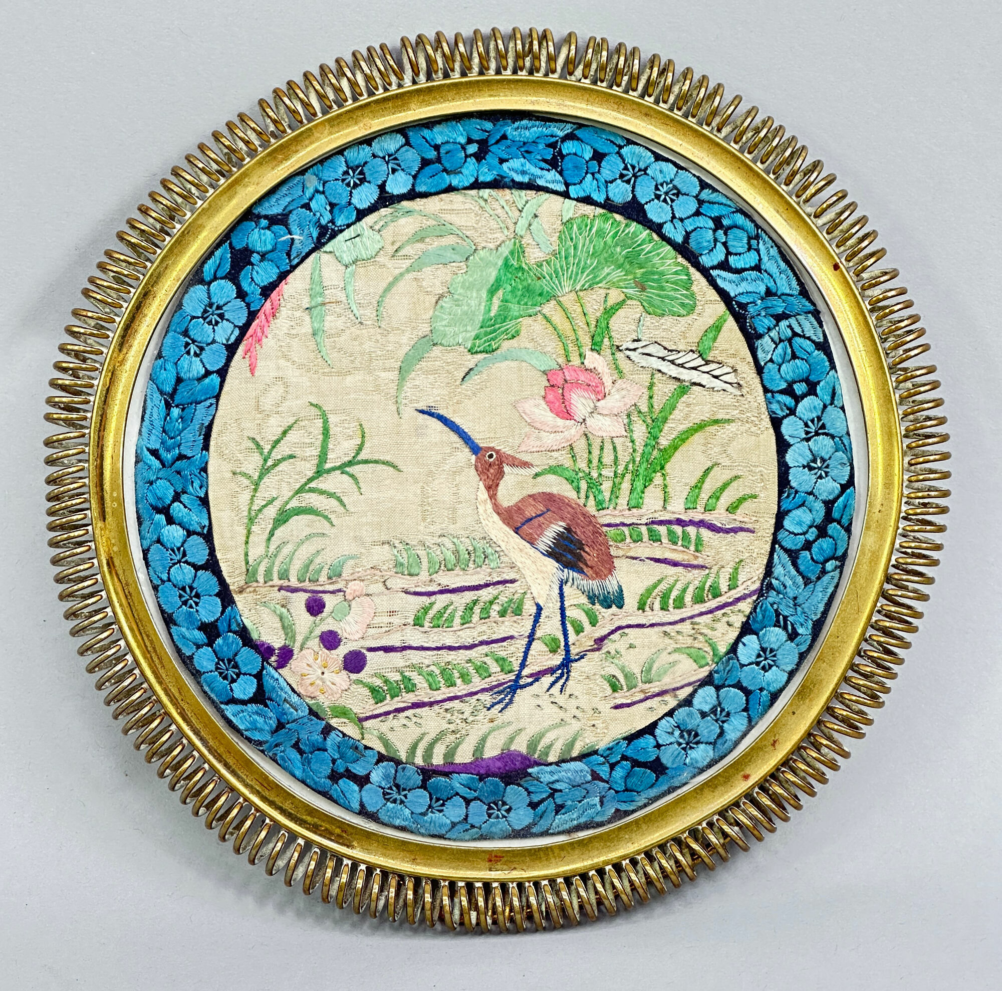 Chinese circular silk textile Panel in later European brass metal Frame, C19th/C20th