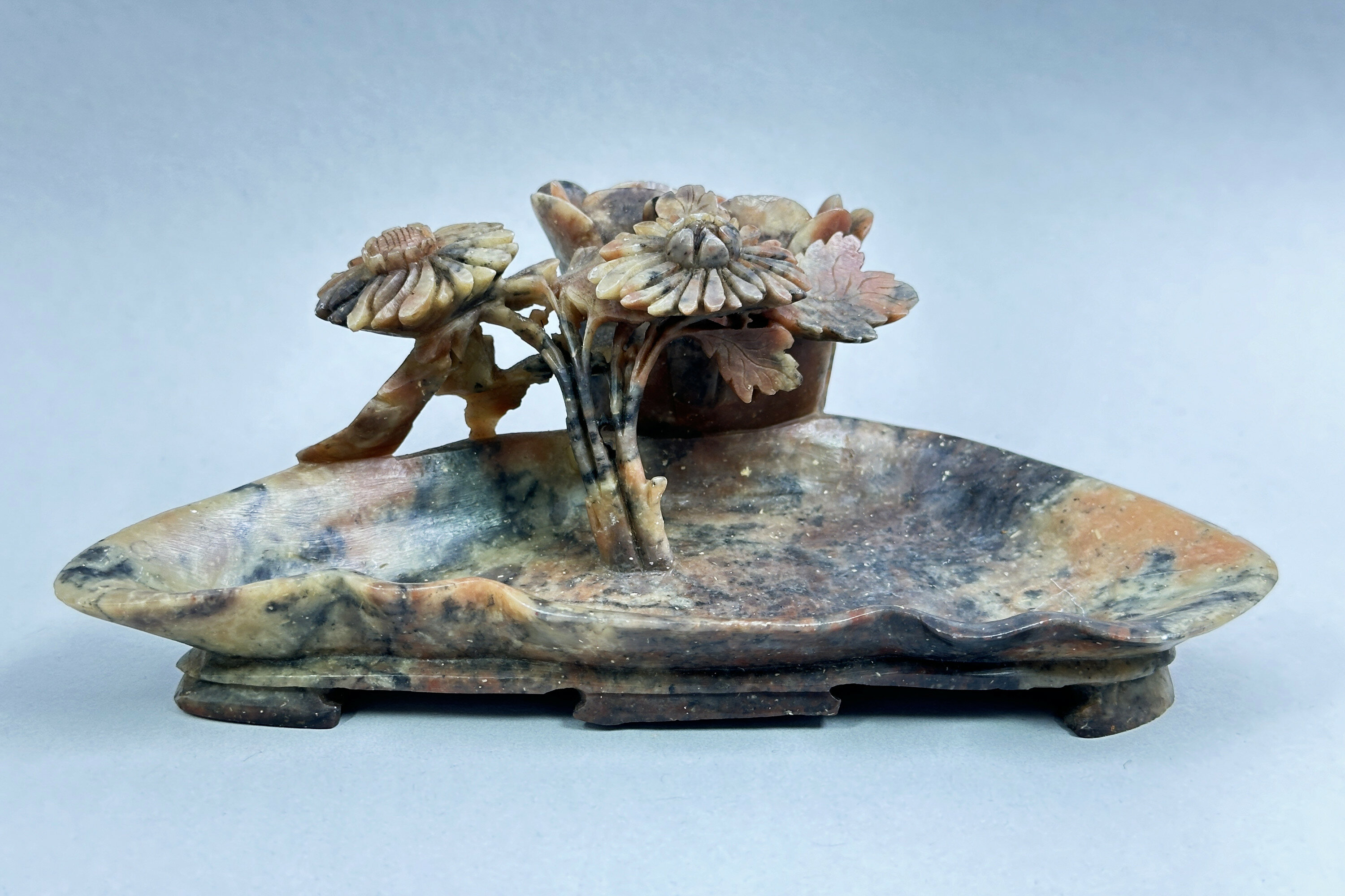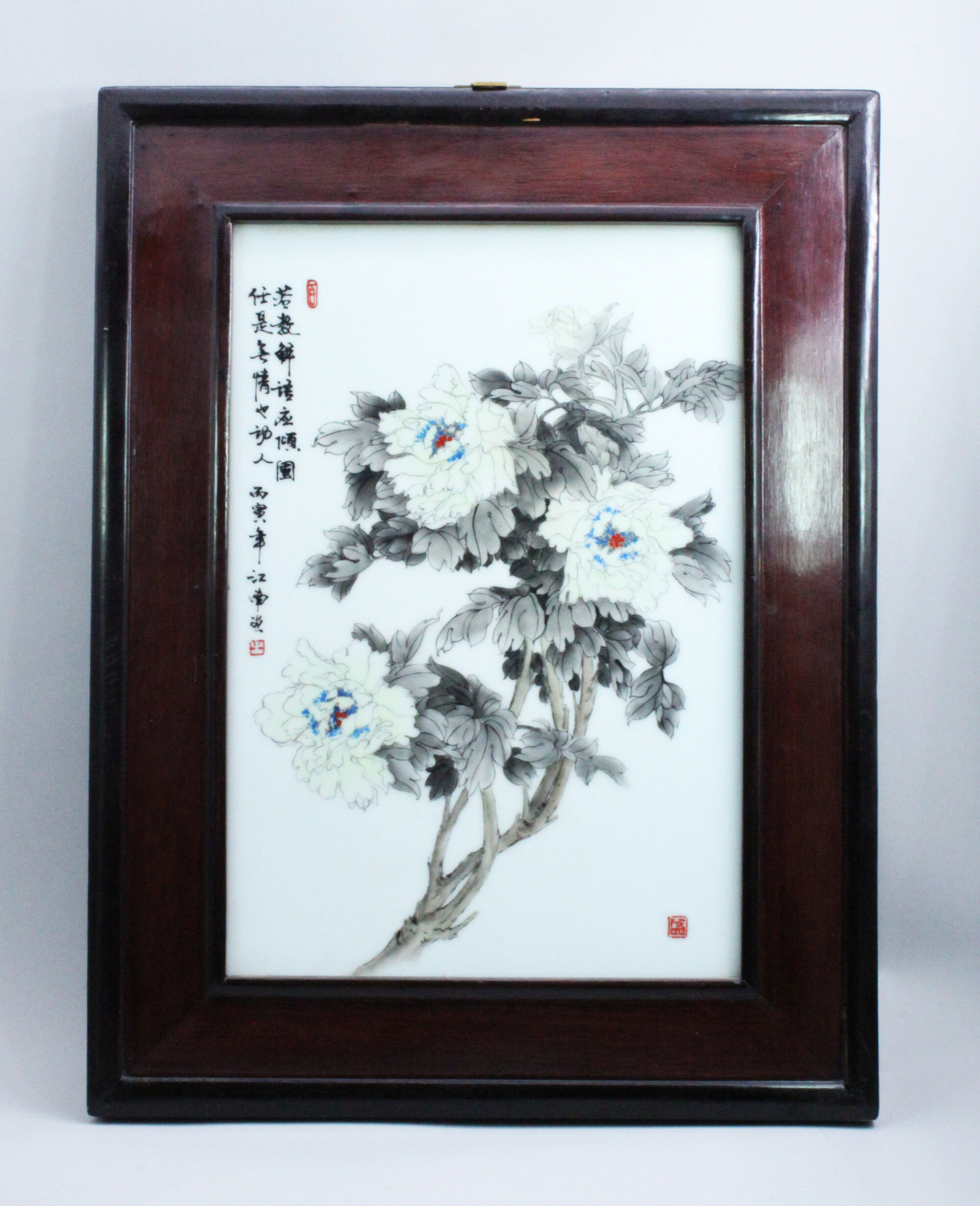 Chinese Framed Ceramic Plaque depicting Peony, C20th