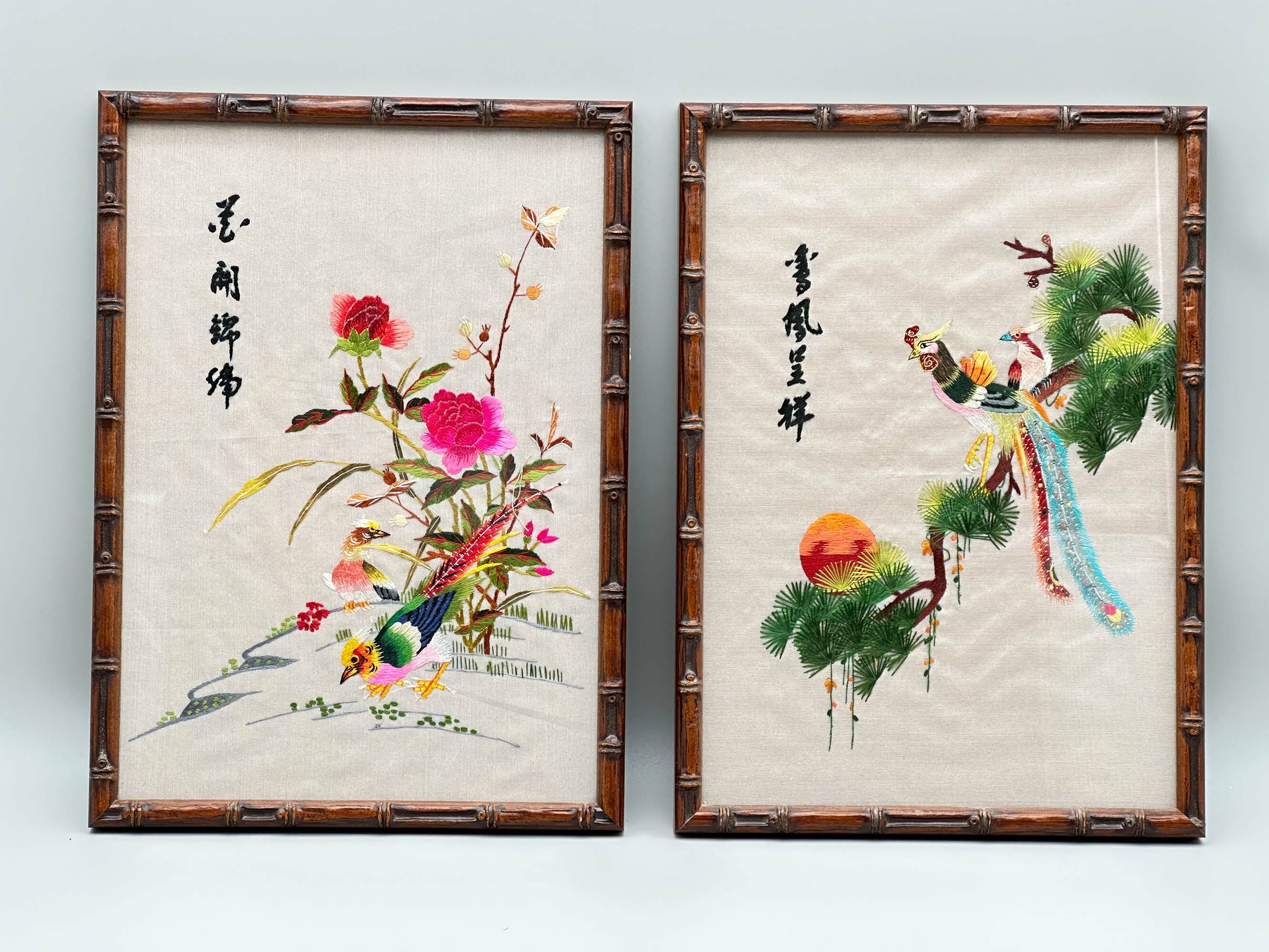 Pair of Chinese embroidered silk Panels, signed, in later frames, C20th