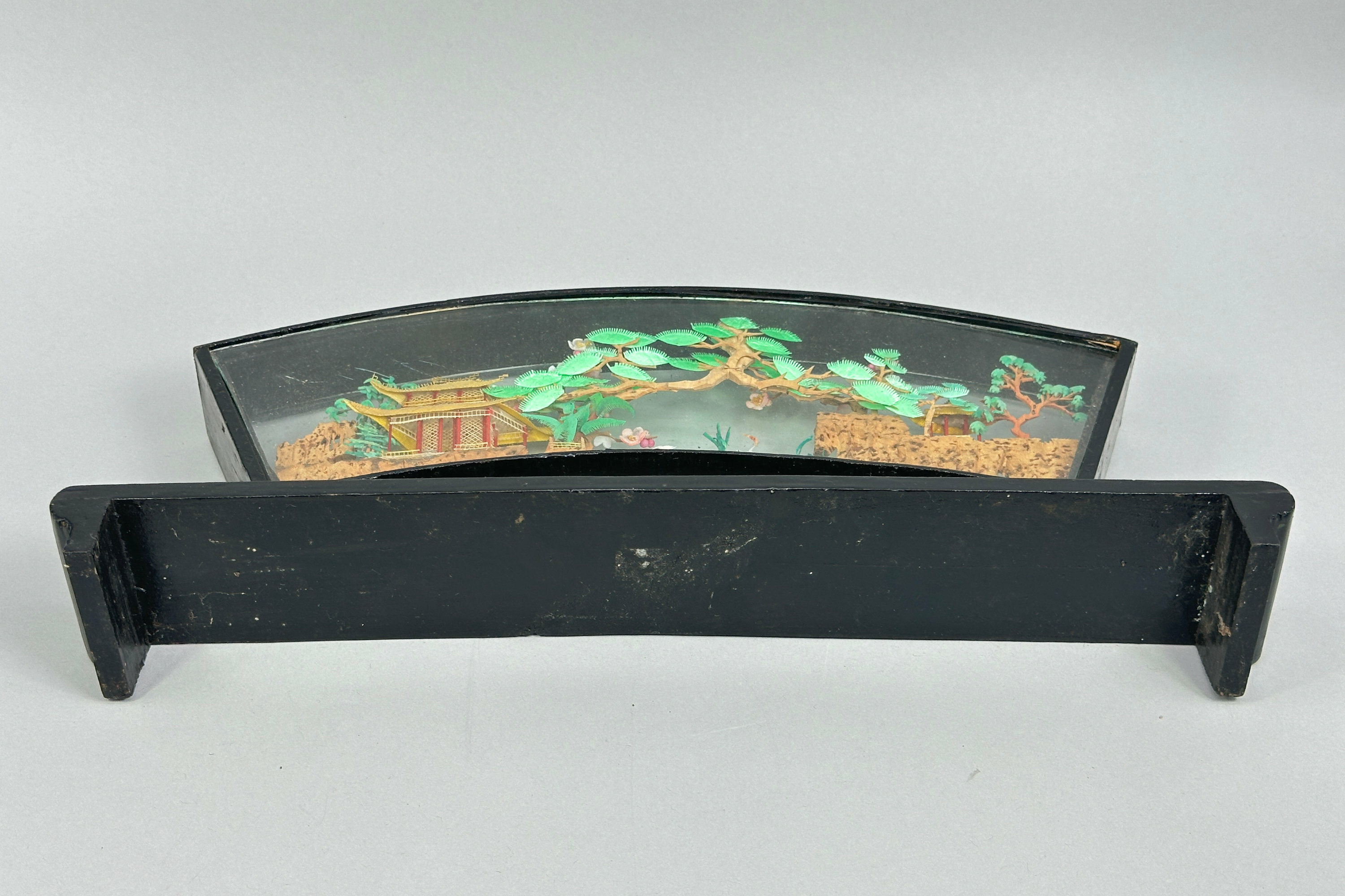 A fine quality Chinese carved and coloured cork sculpture with pavilions on rocks, pine trees and crane amidst reeds, all rendered in minute and meticulous detail and set in a fan shape glazed frame of lacquered wood set on an altar table form stand.Chinese cork carving, also known as cork sculpture, is a traditional Chinese art form depicting intricate landscapes with pavilions and animals. The cork (from cork bark of trees) is cut, carved, coloured and glued together into pictures after which it is wood-framed, usually painted in black lacquer, with clear glass protection. The tradition seems to have begun in the early twentieth century when the Chinese wood carving artist Wu Qiqi from Xiyuan village in Fuzhou was inspired by a wood carving picture that brought back from Germany to create something in imitation using locally cork for the main elements with rice paper plant to form the animals. The sculptures proved popular and many were exported. This piece is an excellent example with a particularly attractive frame and probably dates to before the Second World War.