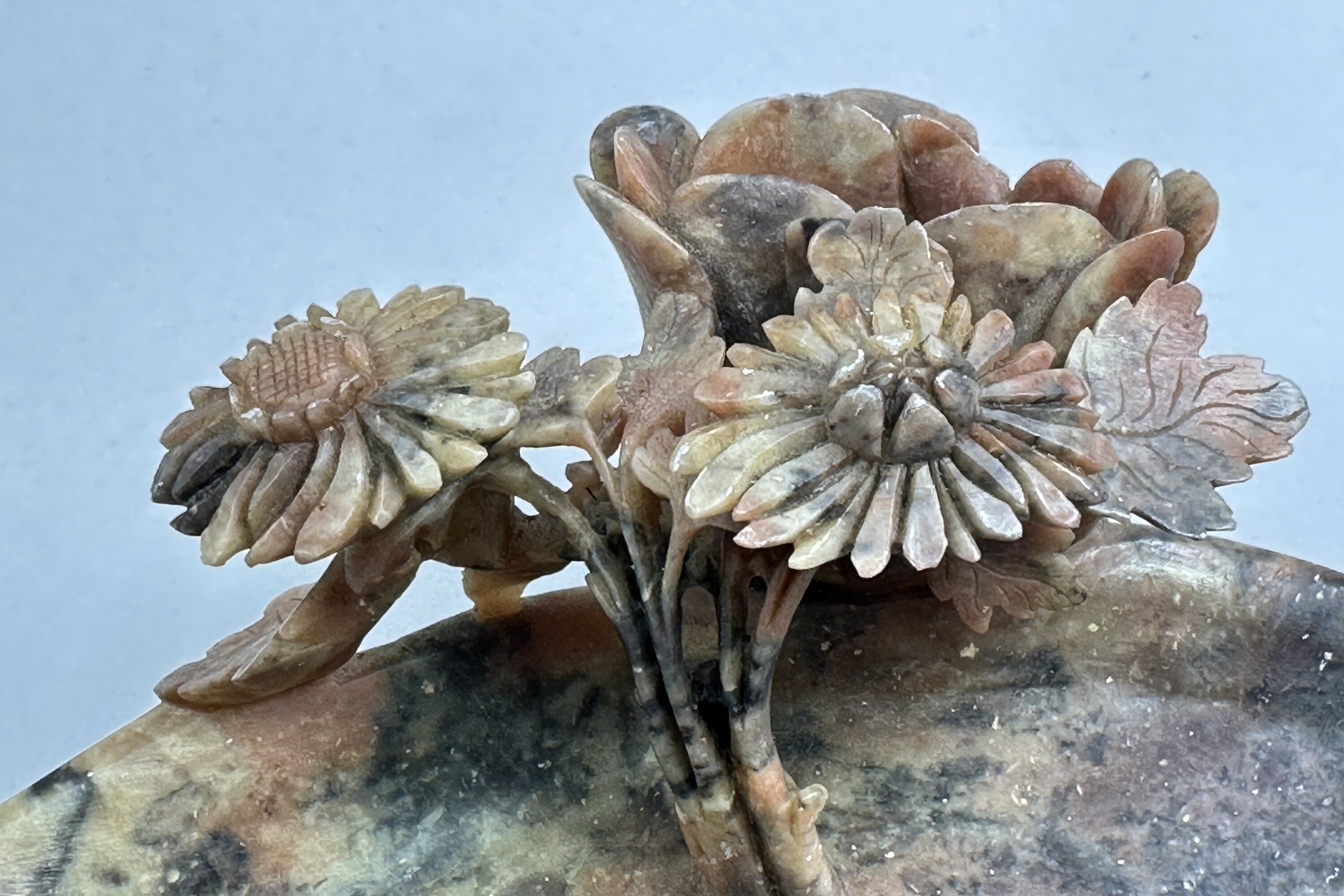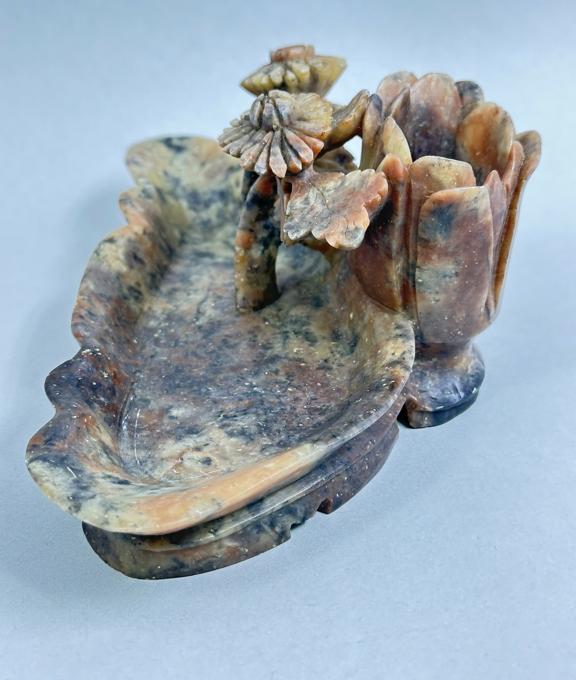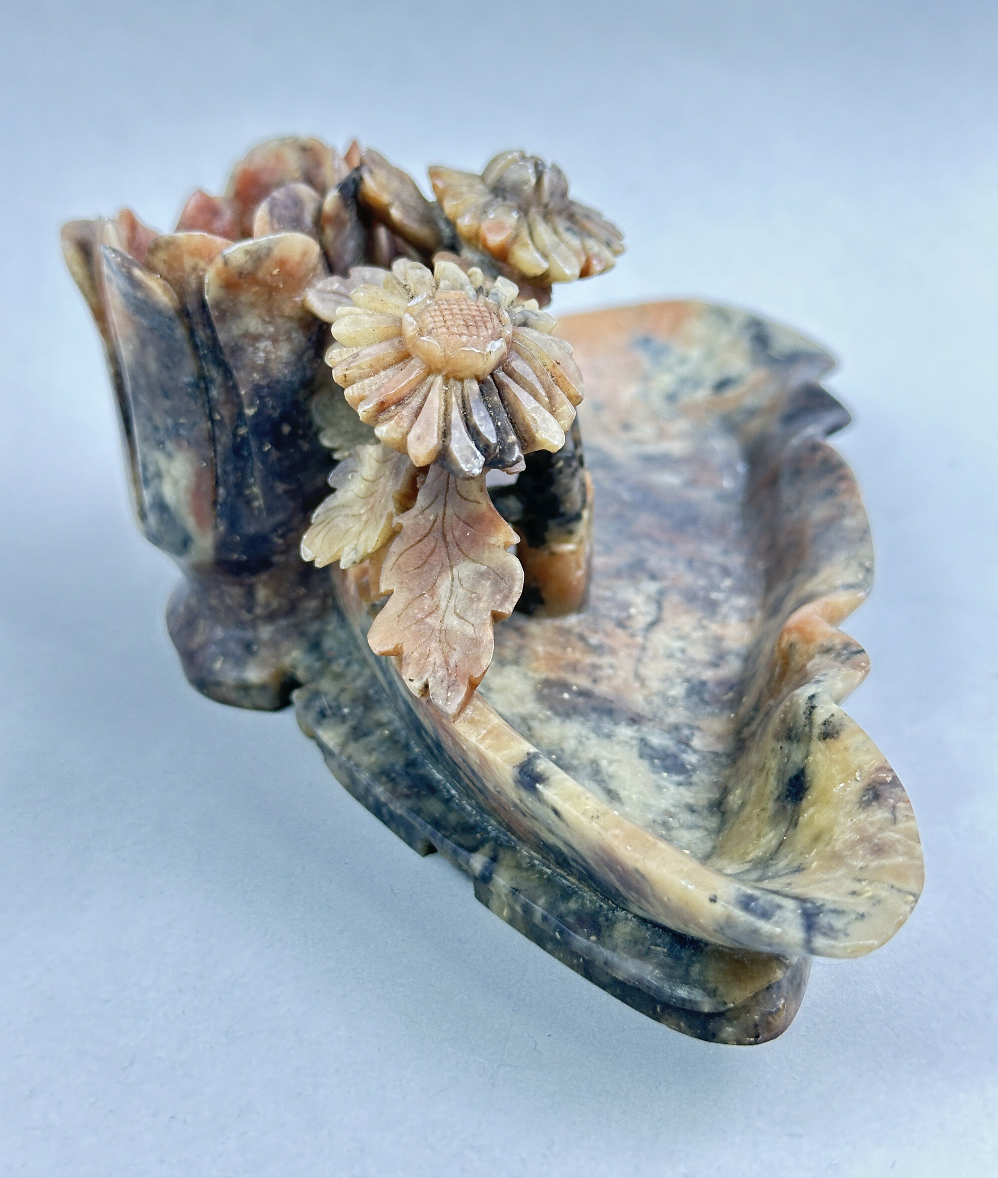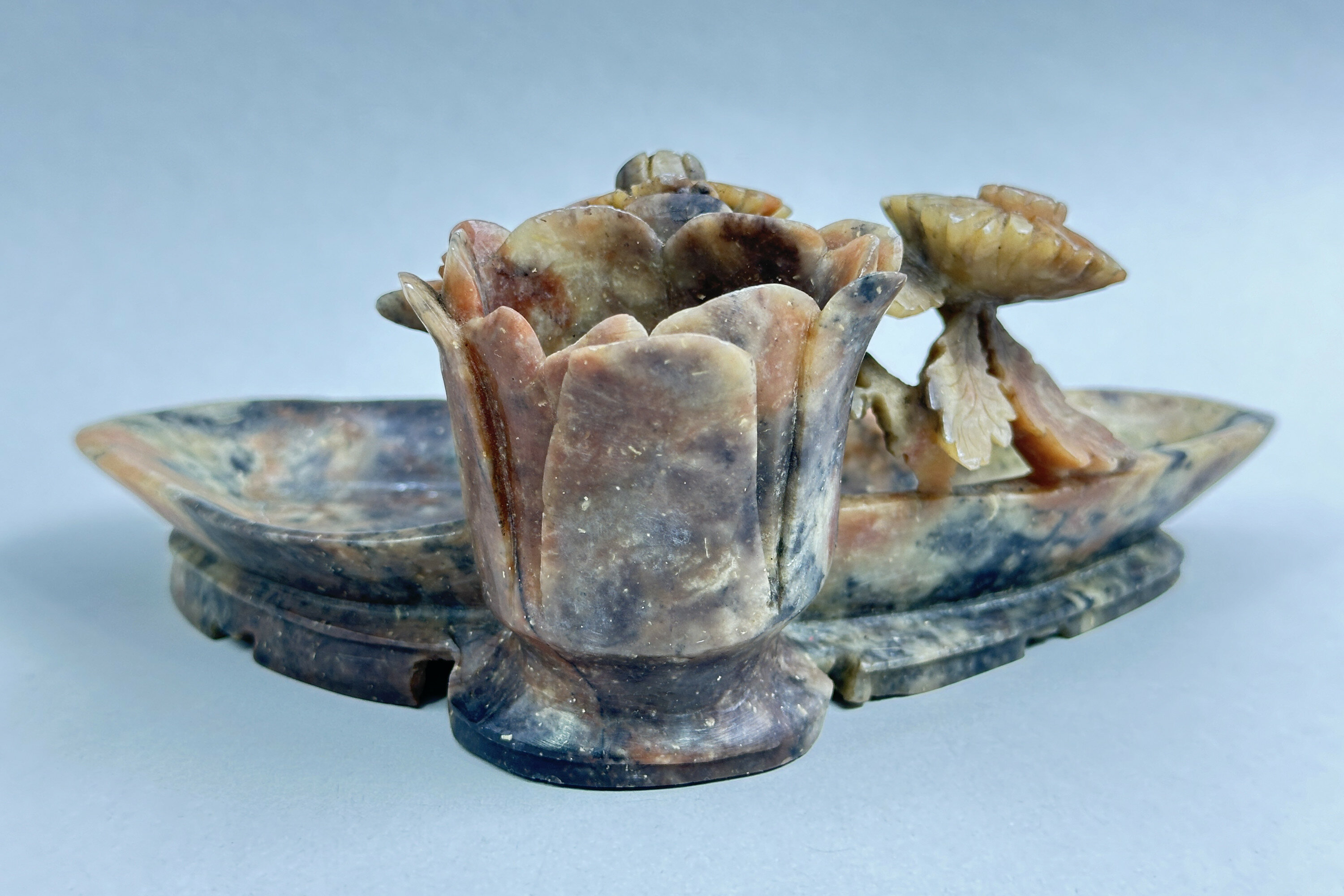 A Chinese soapstone brush washer unusually modelled as a rounded triangular shallow basin in the form of a lotus leaf, footed and with a sprig of flowering lotus growing upwards from it with a vase behind in the form of lotus leaves. The skill of the carver is self evident and the design has been very carefully conceived, artistically employing the varied detail of the natural stone from which the piece was made. Soapstone was first used by the Chinese over three thousand years ago but began its popularity in the Ming dynasty (1368 -1644) with the height of production during the ensuing Qing dynasty (1644 – 1911) when a stone mined in the Shoushan village in northern Fujian was most commonly used. Shoushan soapstone is noted for its smooth texture, bright colours and fine grain and a wide variety of objects were carved from it. This piece is an excellent example of the genre and has survived in pristine condition to become a scholar’s object from the past which can be enjoyed and appreciated today. Production of soapstone carvings continued into the twentieth century and this is probably what we have here but almost certainly from the early years of the period.| Size: | 18 cm (width) x 10 cm (depth) x 7 cm (ht : max) |