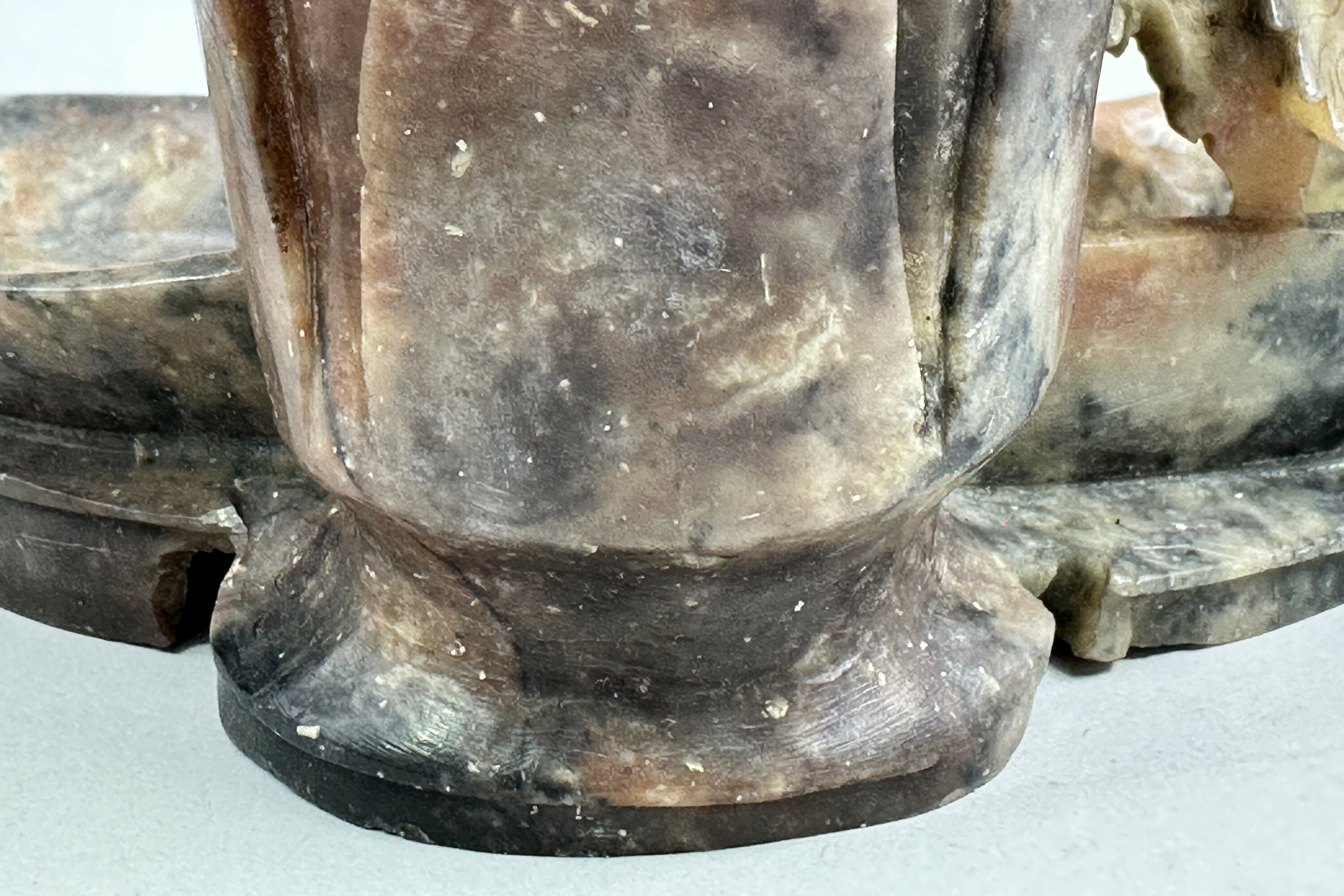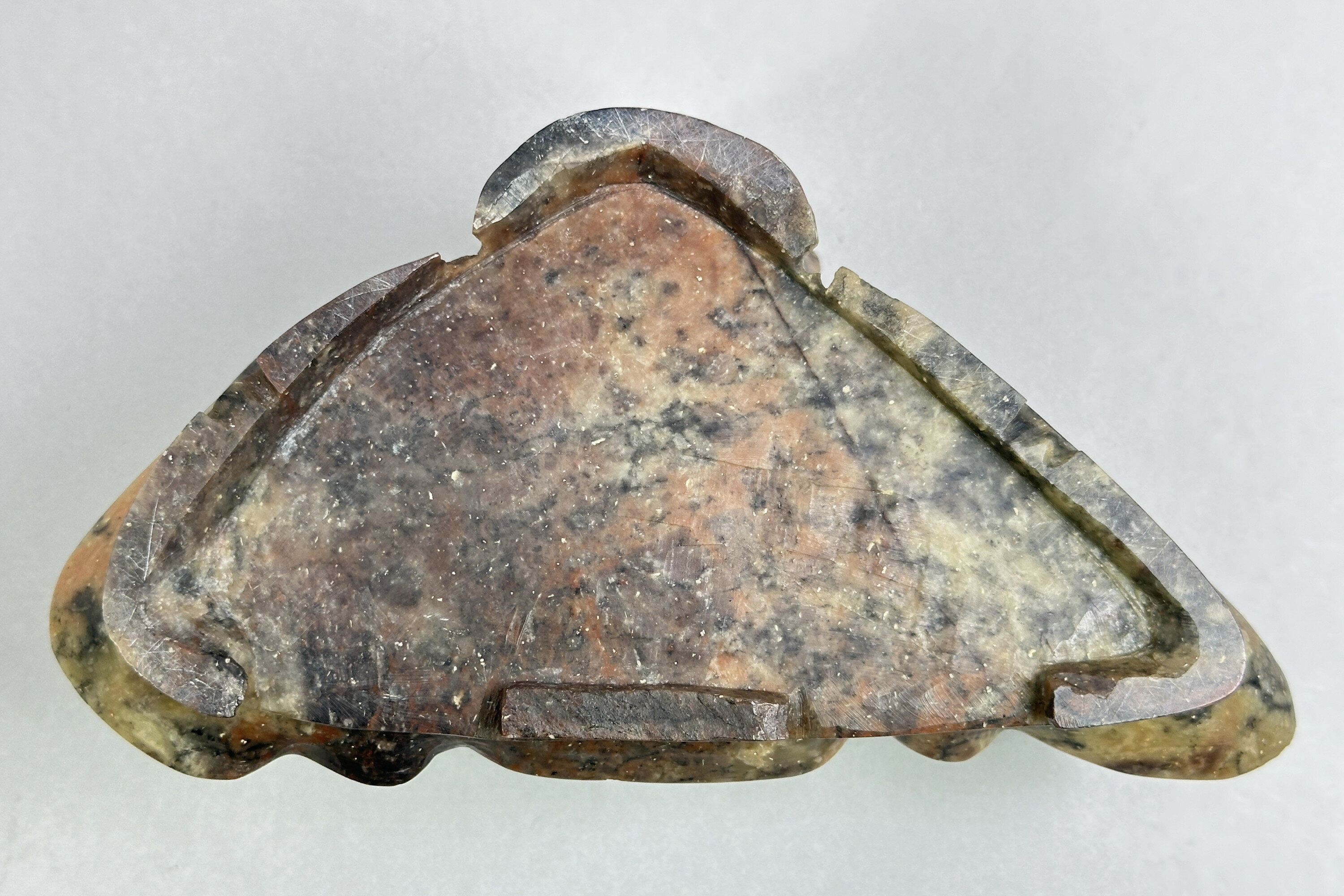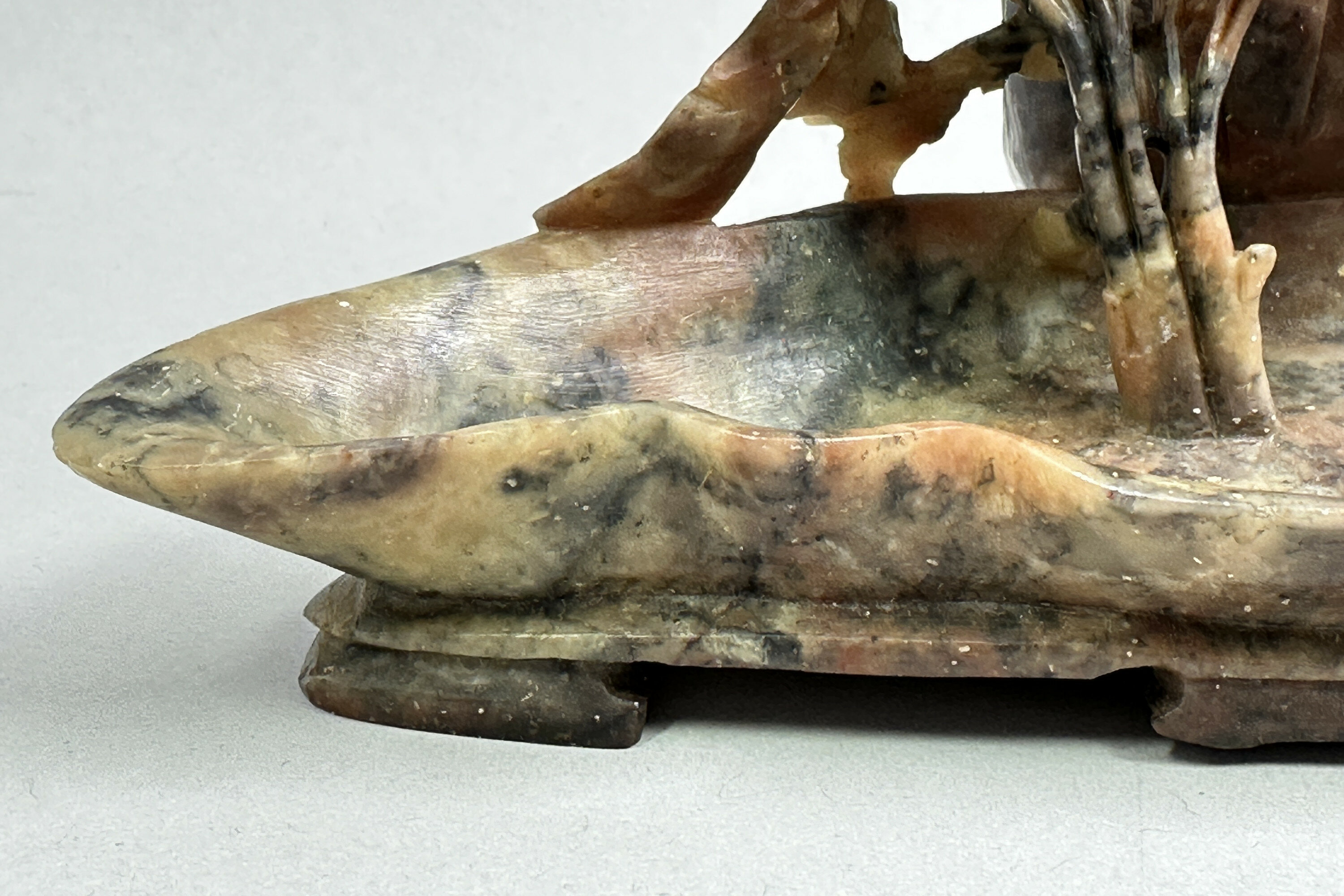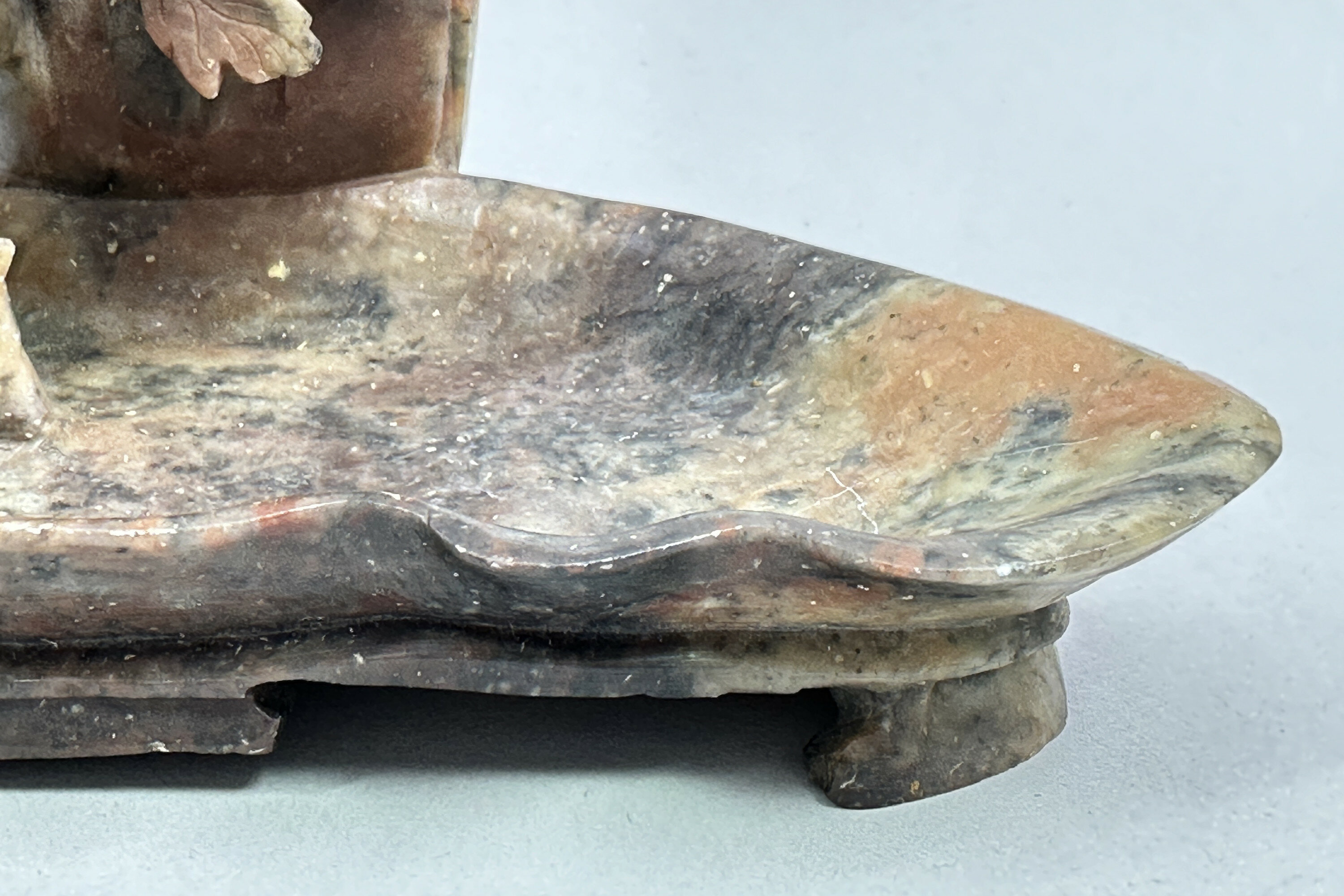 A Chinese soapstone brush washer unusually modelled as a rounded triangular shallow basin in the form of a lotus leaf, footed and with a sprig of flowering lotus growing upwards from it with a vase behind in the form of lotus leaves. The skill of the carver is self evident and the design has been very carefully conceived, artistically employing the varied detail of the natural stone from which the piece was made. Soapstone was first used by the Chinese over three thousand years ago but began its popularity in the Ming dynasty (1368 -1644) with the height of production during the ensuing Qing dynasty (1644 – 1911) when a stone mined in the Shoushan village in northern Fujian was most commonly used. Shoushan soapstone is noted for its smooth texture, bright colours and fine grain and a wide variety of objects were carved from it. This piece is an excellent example of the genre and has survived in pristine condition to become a scholar’s object from the past which can be enjoyed and appreciated today. Production of soapstone carvings continued into the twentieth century and this is probably what we have here but almost certainly from the early years of the period.| Size: | 18 cm (width) x 10 cm (depth) x 7 cm (ht : max) |