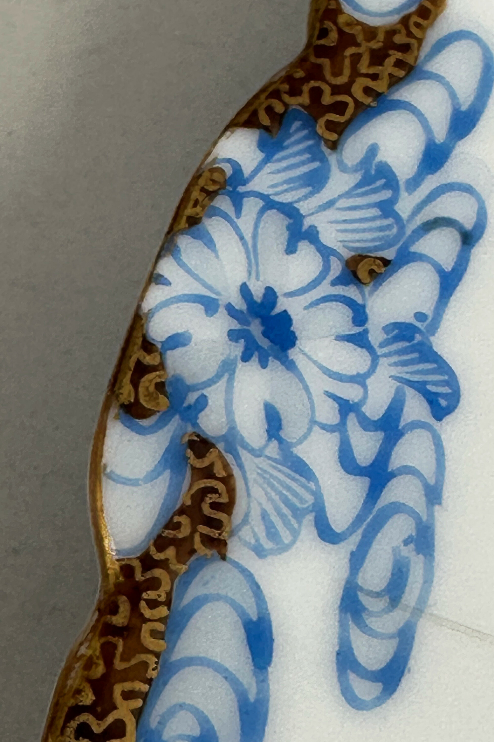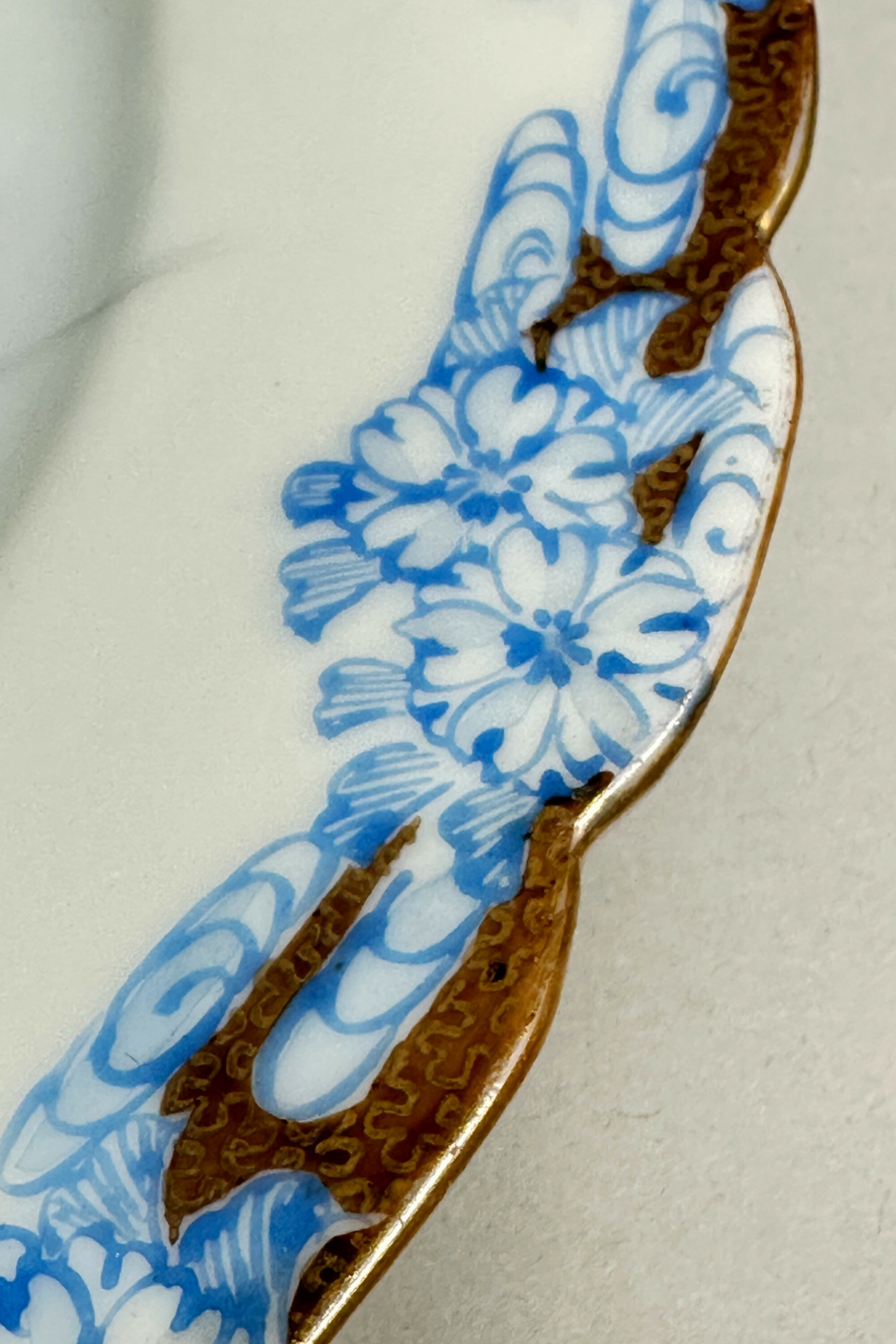 A fine quality Japanese porcelain plate with a lightly scalloped edge, decorated to the centre with two carp swimming amidst reeds within an elaborate border of stylised floral sprays in blue between cloud form segments in brown and gilt, the reverse with a three character script mark. Unfortunately, the artist cannot be identified from his signature but there are elements here in common with various of the Japanese potteries producing pieces for export in the late nineteenth and early twentieth centuries, including those at Kutani and Seto along with the ubiquitous output from Noritake. But the craftsmanship here is not in doubt and the representation of the two carp, symbols to the Japanese of good fortune and friendship, highly skilful. The style of painting and the paste of the foot suggests a dating to the early twentieth century, probably to the Taisho period (1912-1924).| Size: | Diam (max) 21.5cm, Ht 2.5cm, Base 12cm |