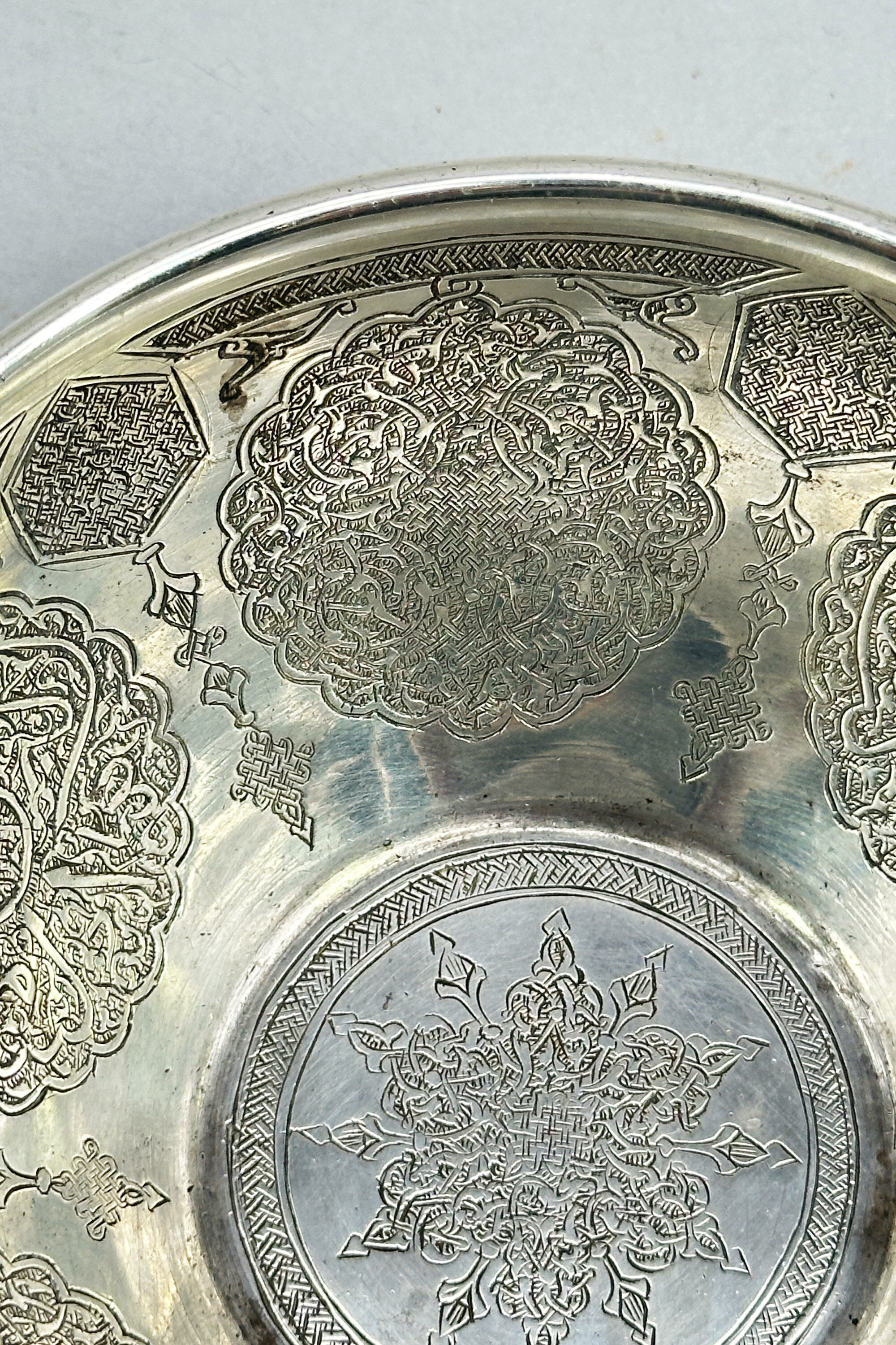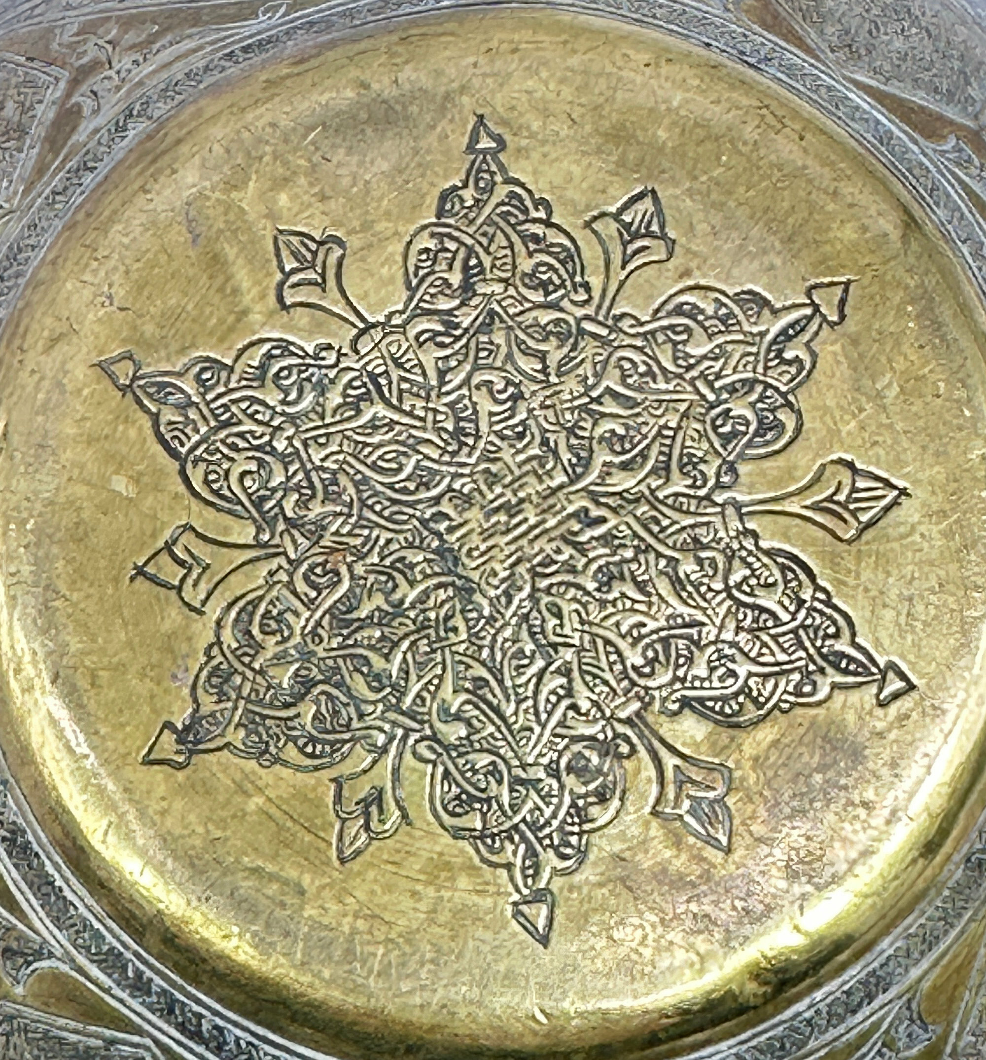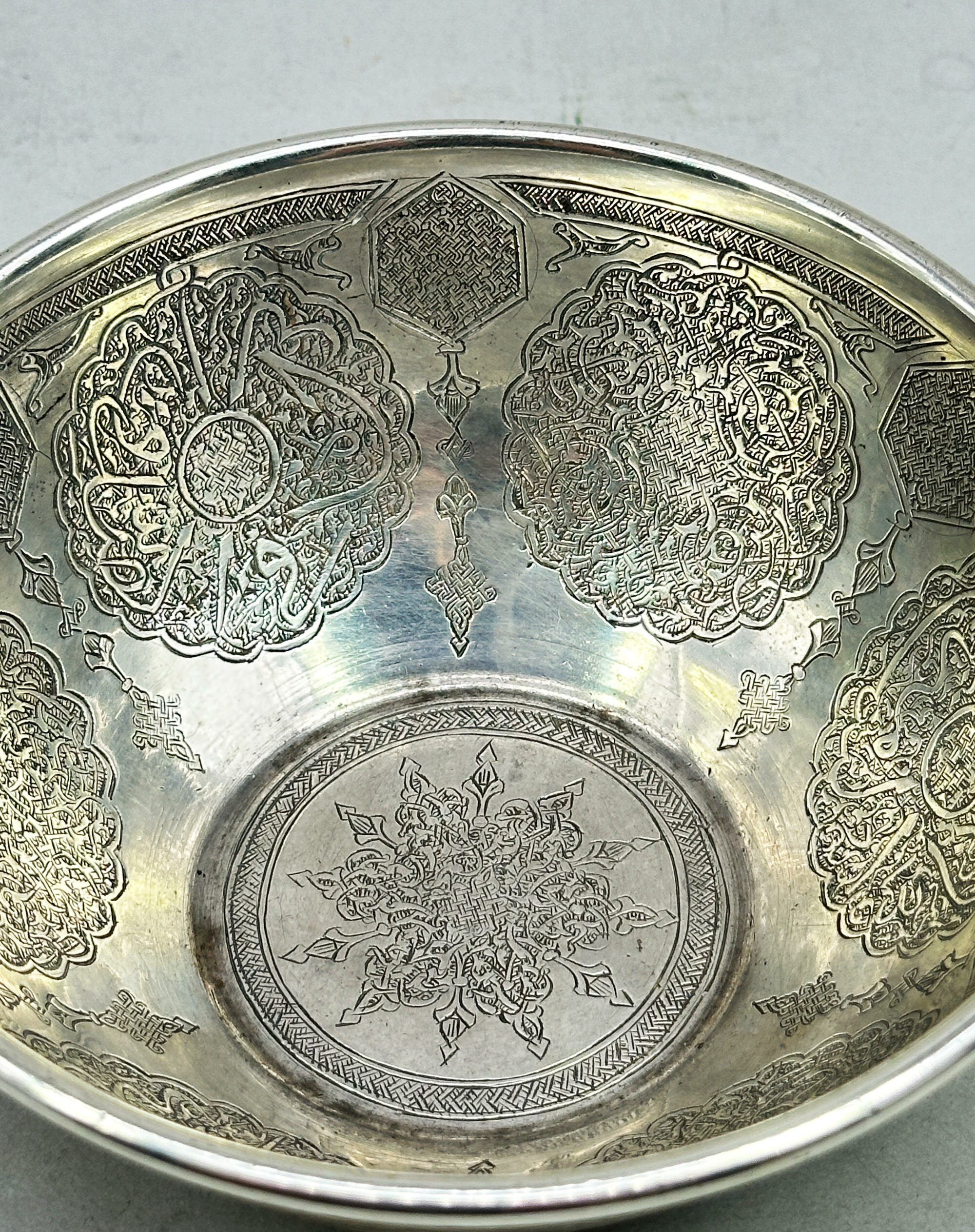 This is a very finely worked small bowl, the gently curved sides with a lipped rim, made from silver with brass inlay to the exterior. The decoration inside and out is mainly quite distinct demanding great skill from the silversmith who had to hammer punch the designs on both sides without damaging the body of the piece in any way. The exterior has a continuous series of panels in rounded and geometric shapes all intricately decorated with either Moorish style stylised floral designs or diaper work between two diaper filled line borders and at the base is star like emblem with arabesque designs. The star emblem is repeated in the centre of the interior and surrounded by six lobed emblems, again with arabesque designs, between six pendants with drops in the form of endless knots suspended from hexagonal diaper filled panels. The lipped rim was deliberately left plain. That this was a luxury item at the time of its production is quite clear. The form is said to be that of a ‘Hammam’ bowl, used by bathers to sprinkle water over themselves while visiting the Hammam (commonly termed by Westerners the ‘Turkish Bath’), a type of steam bath or a place of public bathing associated with the Islamic world. Unlike the practice in baths of the Classical world, bathers at the Hammam usually wash themselves with running water instead of immersing themselves, since this is a requirement of Islam. The ‘Hammam’ bowl was designed as an accessory in the process. Dating is slightly speculative, but these finely worked bowls, though not often as finely worked as this example, are usually ascribed to the early years of the twentieth century. Given the theme of this sale, this bowl could be regarded as a useful companion when the scholar seeks relaxation at the end of a long day’s study!| Size: | W 12cm H 4.5cm |