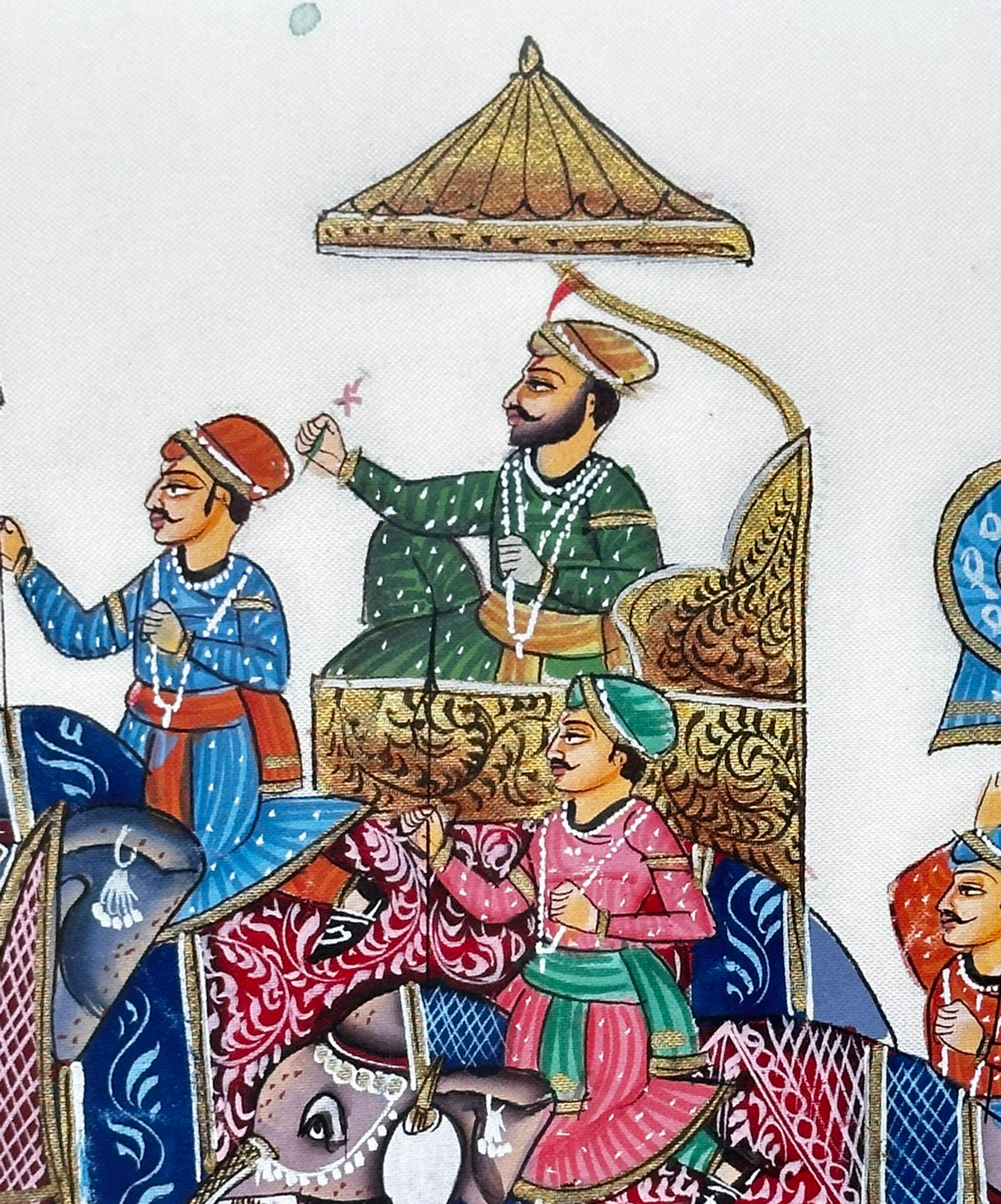This is an attractive painting of a court procession, the principal figure, presumably a Sultan, seated in a howdah borne by an elephant and accompanied by an attendant, also conveyed by an attendant. A further attendant follows on foot carrying a banner and in front is a group of five ladies, two carrying baskets with floral petals. The style of painting here can be loosely termed ‘Mughal’ but similar works are often ascribed to the artists of Rajasthan in India, which is probably the case here. The composition is lively and the work finely detailed but dating is probably to the late twentieth century, and the frame itself can be firmly placed in the years between 1995 and 2000 since it was only during this time that the outer London dialling code ‘0181’ was used.| Size: | Frame : 38.8cm x 30.5cm x 1.5cm Gouache (visible) : 28cm x 22cm |