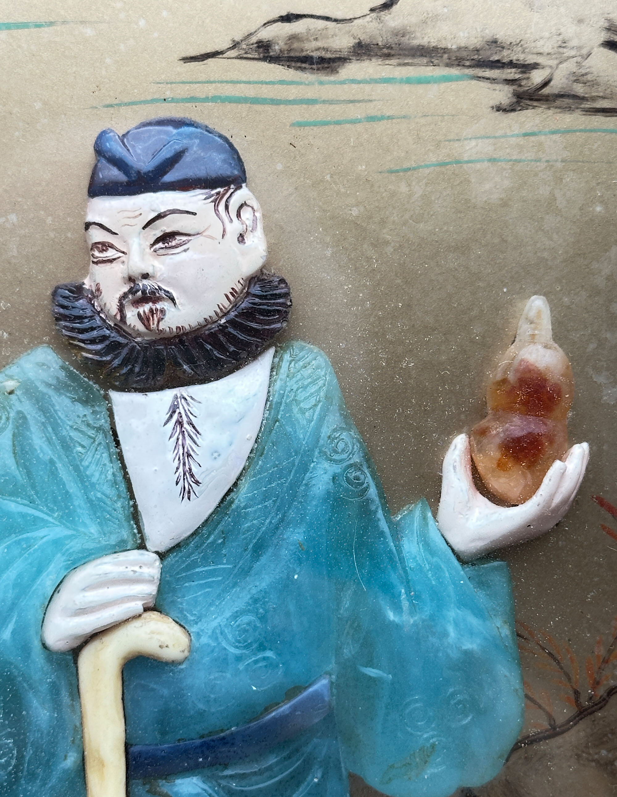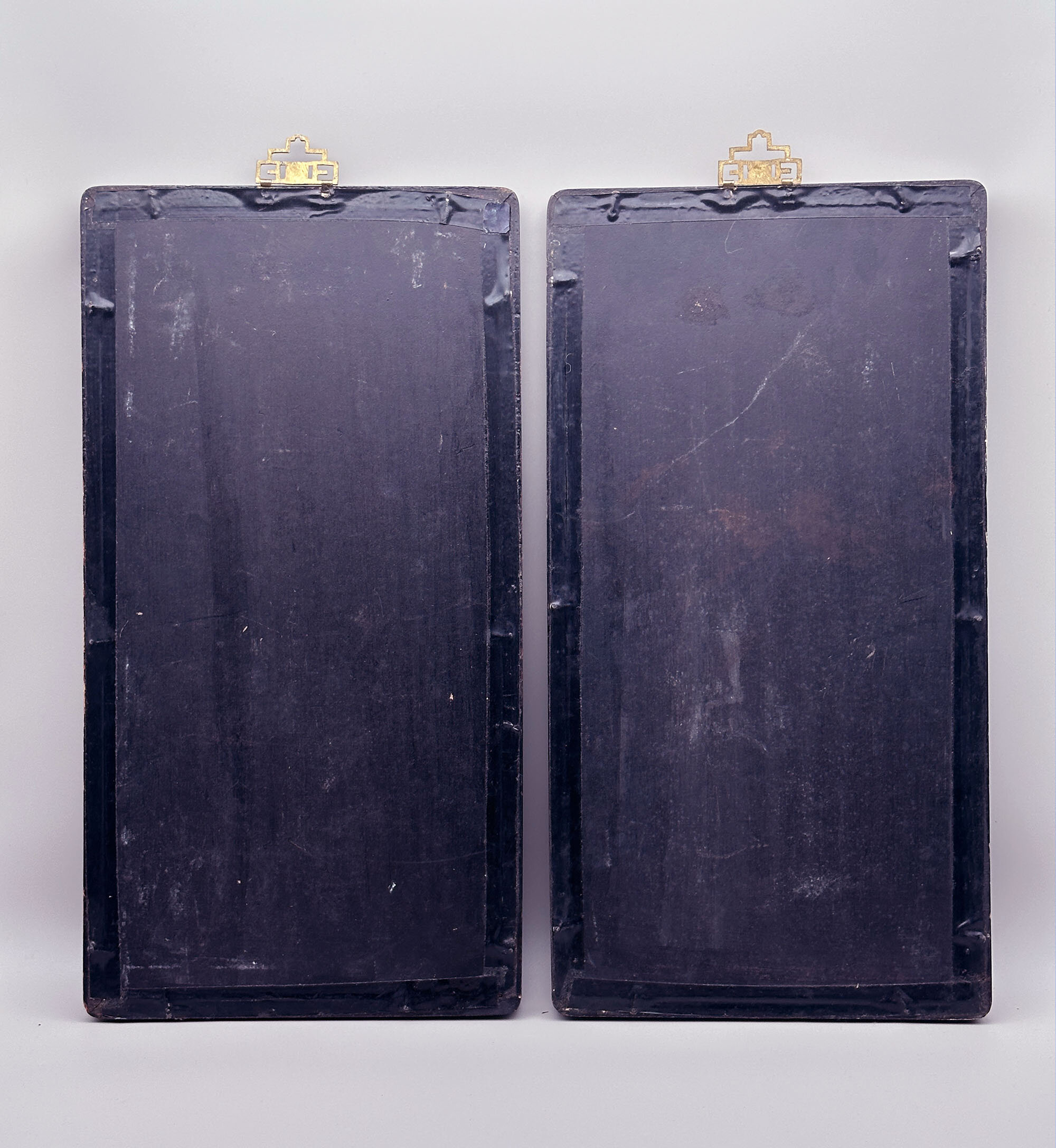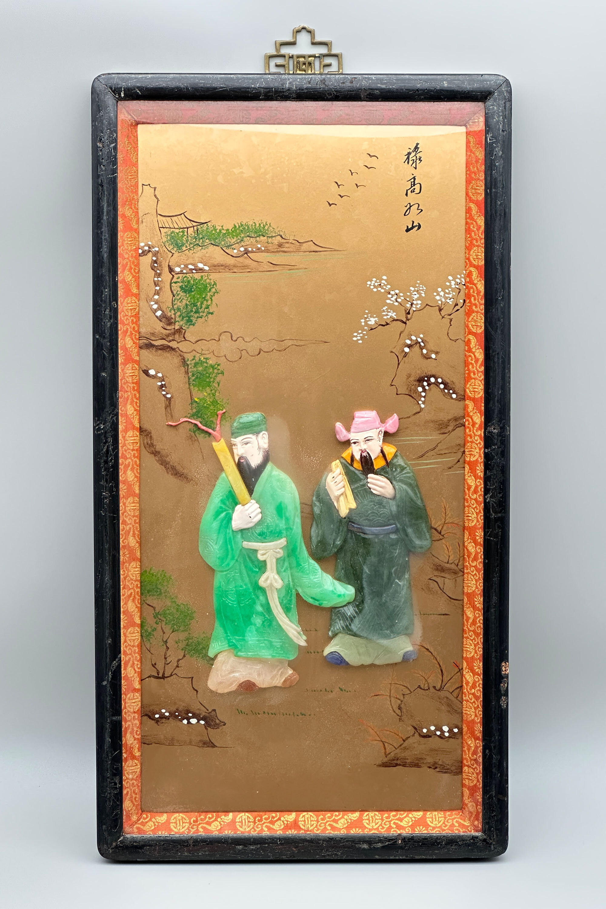 xA pair of Chinese lacquer panels, the gold ground with painted decoration and hardstone inlay depicting four of the eight immortals, or Baxian, in a stylised garden scene. Amidst painted rocks and flowering prunus with lakes and mountains in the background stand, on the left plaque, Lan Caihe, the patron of florists and gardeners, and Lü Dongbin, a scholar and poet, and on the right plaque Zhongli Quan, associated with death and the power to create silver and gold, often depicted holding a fan, and Li Tieguai, associated with medicine and easing the suffering of the sick and needy, identified by his iron crutch and calabash bottle. The eight immortals are figures of legend which feature in Chinese mythology and are worshipped by Taoists as well as appearing in secular Chinese culture. They are often depicted in Chinese art and it is possible that we have here two plaques from an original set of four representing them all. That said, the compositions here are well balanced with perhaps a deliberate contrast between the attributes of the figures. Plaques with hardstone inlay are known amongst the items exported to the West in the early twentieth century and sometimes occur as furniture screens. The work here is both colourful and expressive and an excellent example of the genre. The frames with their silk border may be slightly later but are certainly Chinese and well complement the compositions which they surround contributing to a highly decorative ensemble for a contemporary interior.| Size: | Frame : 26.8cm x 50.5cm x 2cm; Plaques 21cm x 45cm |