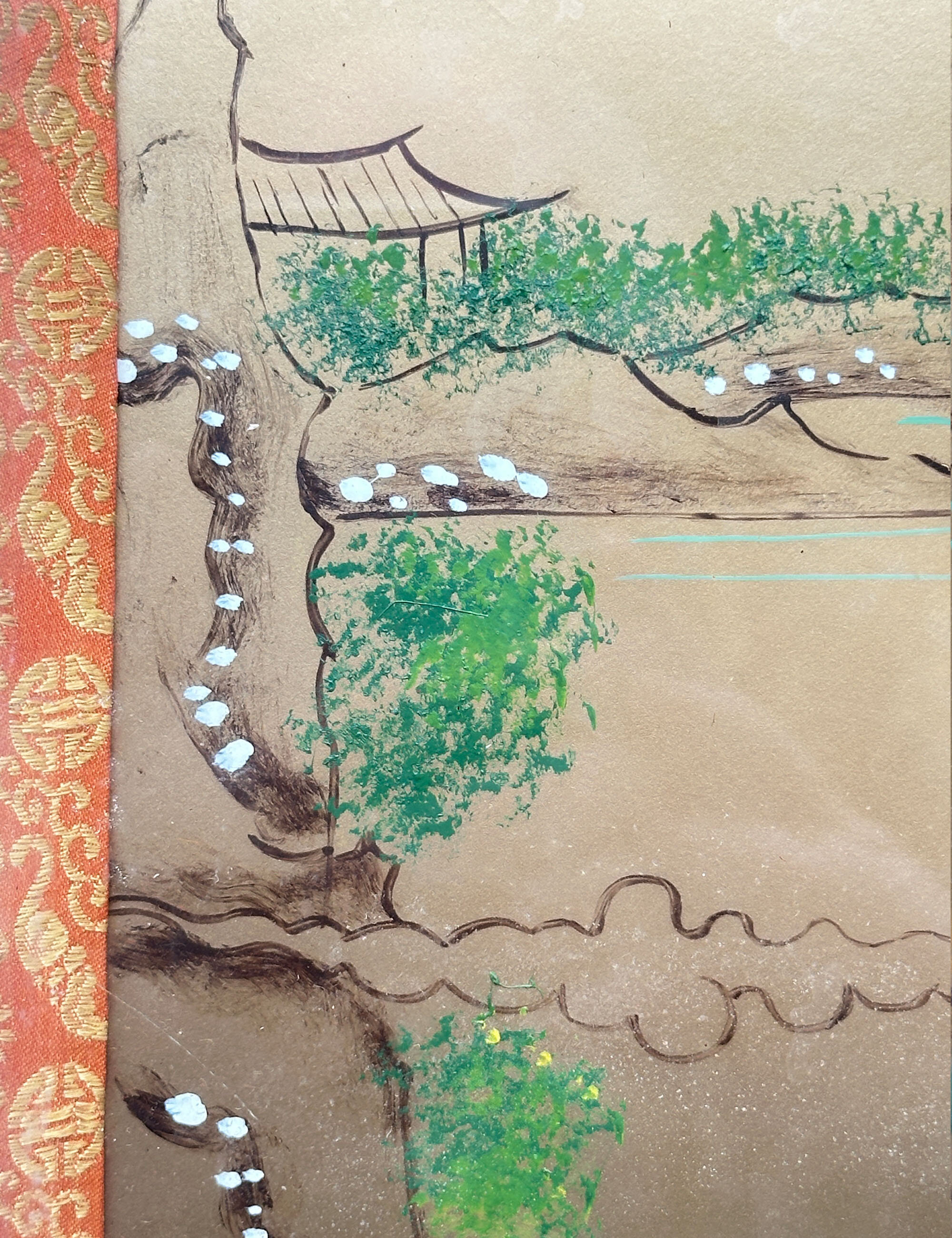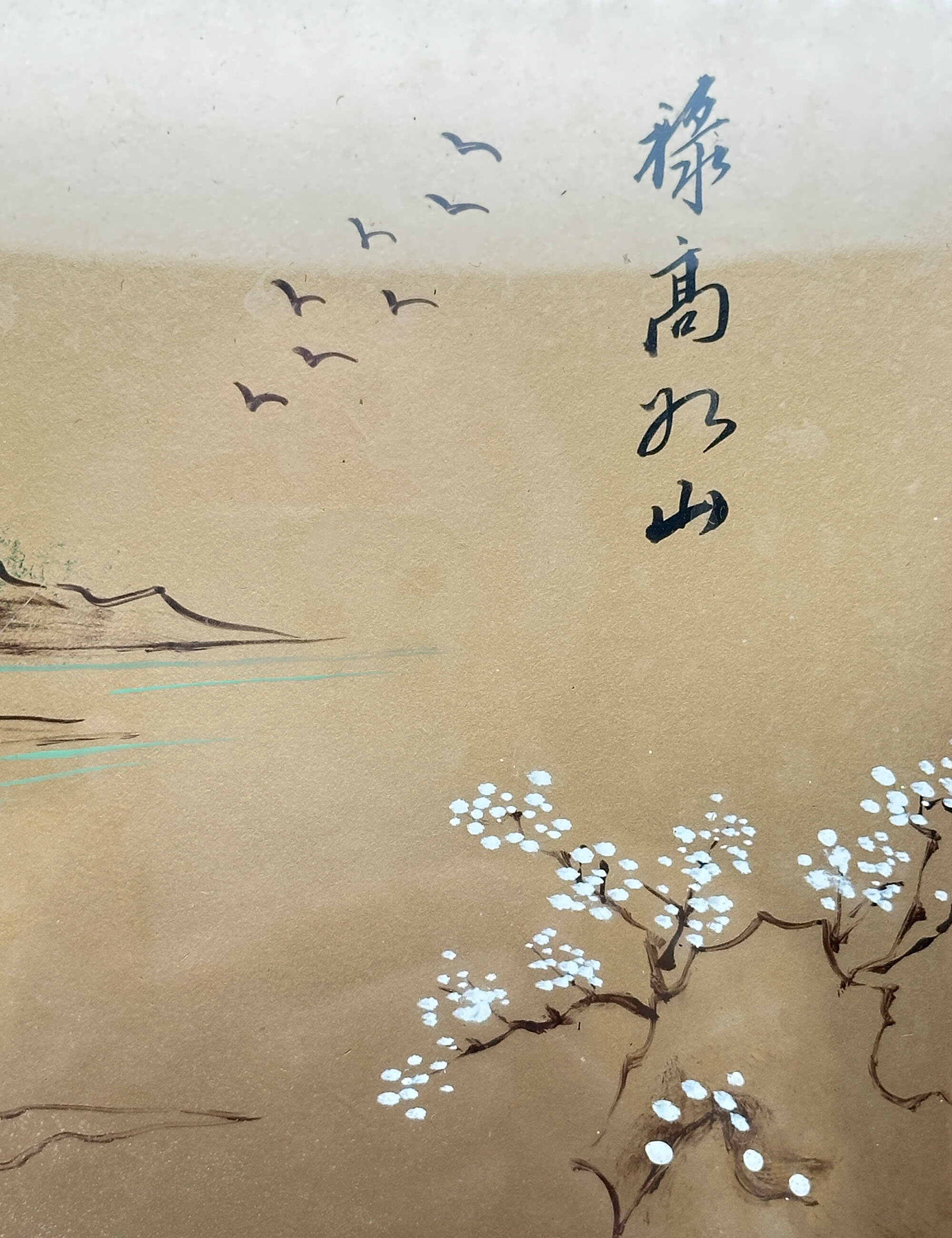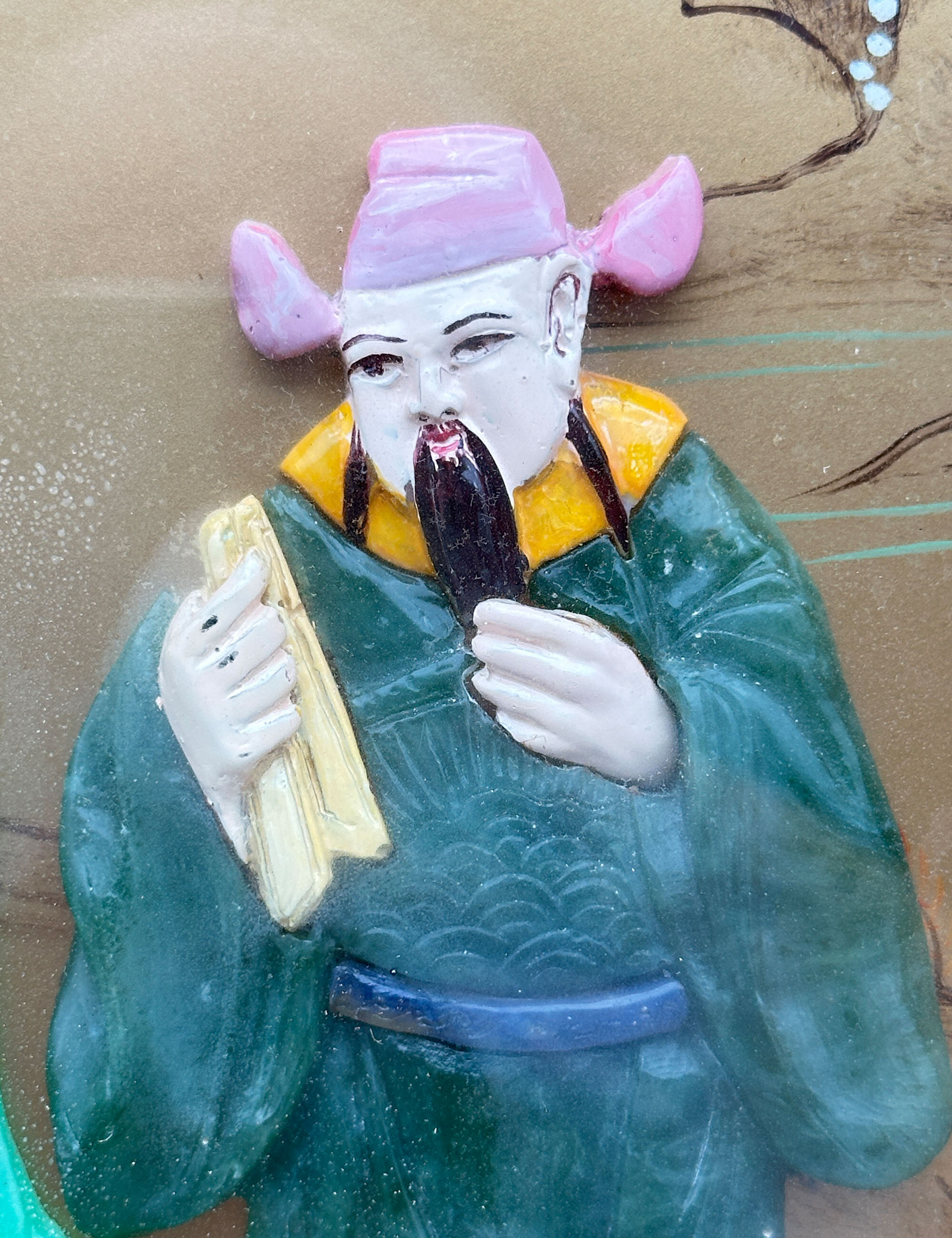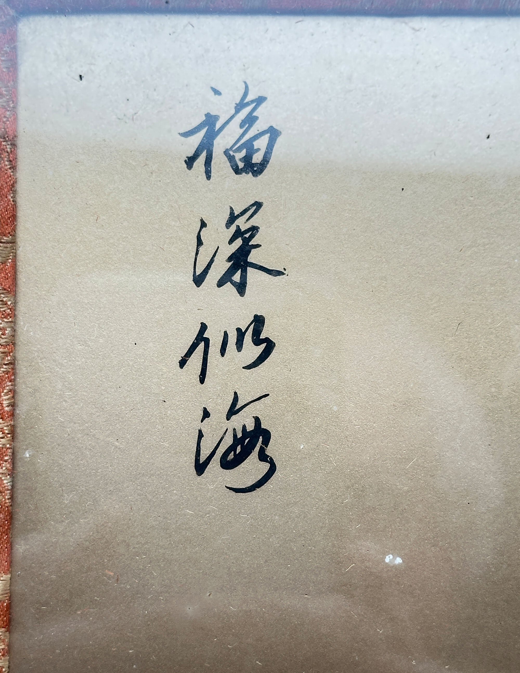 xA pair of Chinese lacquer panels, the gold ground with painted decoration and hardstone inlay depicting four of the eight immortals, or Baxian, in a stylised garden scene. Amidst painted rocks and flowering prunus with lakes and mountains in the background stand, on the left plaque, Lan Caihe, the patron of florists and gardeners, and Lü Dongbin, a scholar and poet, and on the right plaque Zhongli Quan, associated with death and the power to create silver and gold, often depicted holding a fan, and Li Tieguai, associated with medicine and easing the suffering of the sick and needy, identified by his iron crutch and calabash bottle. The eight immortals are figures of legend which feature in Chinese mythology and are worshipped by Taoists as well as appearing in secular Chinese culture. They are often depicted in Chinese art and it is possible that we have here two plaques from an original set of four representing them all. That said, the compositions here are well balanced with perhaps a deliberate contrast between the attributes of the figures. Plaques with hardstone inlay are known amongst the items exported to the West in the early twentieth century and sometimes occur as furniture screens. The work here is both colourful and expressive and an excellent example of the genre. The frames with their silk border may be slightly later but are certainly Chinese and well complement the compositions which they surround contributing to a highly decorative ensemble for a contemporary interior.| Size: | Frame : 26.8cm x 50.5cm x 2cm; Plaques 21cm x 45cm |