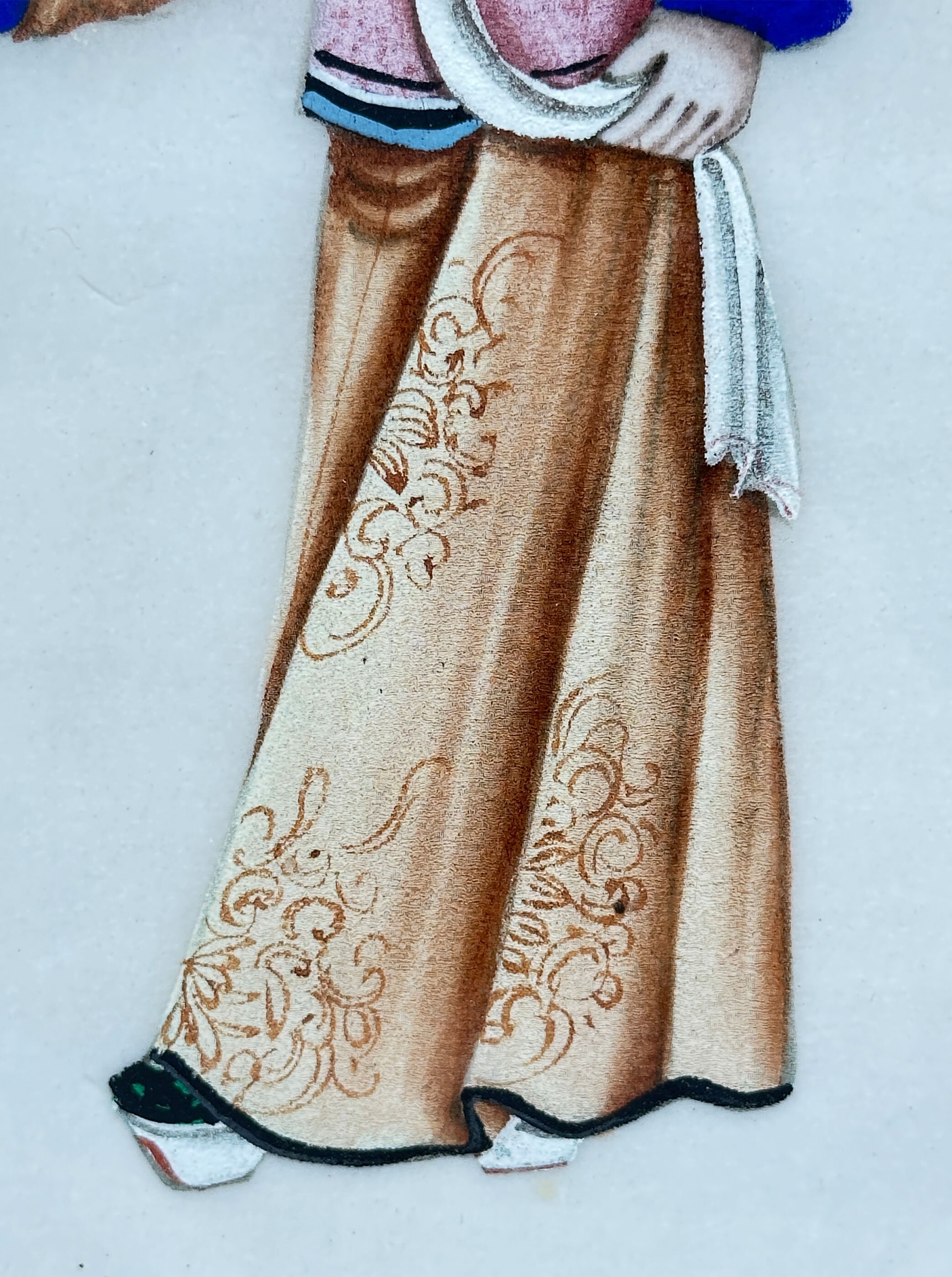 A pair of Chinese paintings on rice paper of two figures, a lady and a gentleman, in traditional court dress. She holds a fan while he holds a quiver of arrows in one hand and a bow in the other, suggesting, perhaps fancifully, a contrast between war and peace. Finely detailed, almost jewel-like, cabinet paintings of this type were made in the 18th and 19th centuries for export to Europe, from the Chinese ports and in particular Canton. The subject matter included botanical studies, commercial and domestic scenes and, as here, people depicted wearing elaborate Chinese dress. These paintings were often issued in sets or albums either to be enjoyed as connoisseurs’ items or for framing to be used as wall decoration. The detail of the brushwork here, especially seen on the robes, and the expression of the faces represents the best of work which was exported and the rice paper ground is in remarkably good condition with little or no trace of foxing. Dating is fairly certainly to the nineteenth century and perhaps to the 1840s/1860s since the style of work resembles that seen on the porcelains produced at this time. The simple frames are doubtless a twentieth century addition and allow these two miniature masterpieces to be displayed with great effect.| Size: | Ht 27cm, Width 18.8cm, Depth 1.3cm |