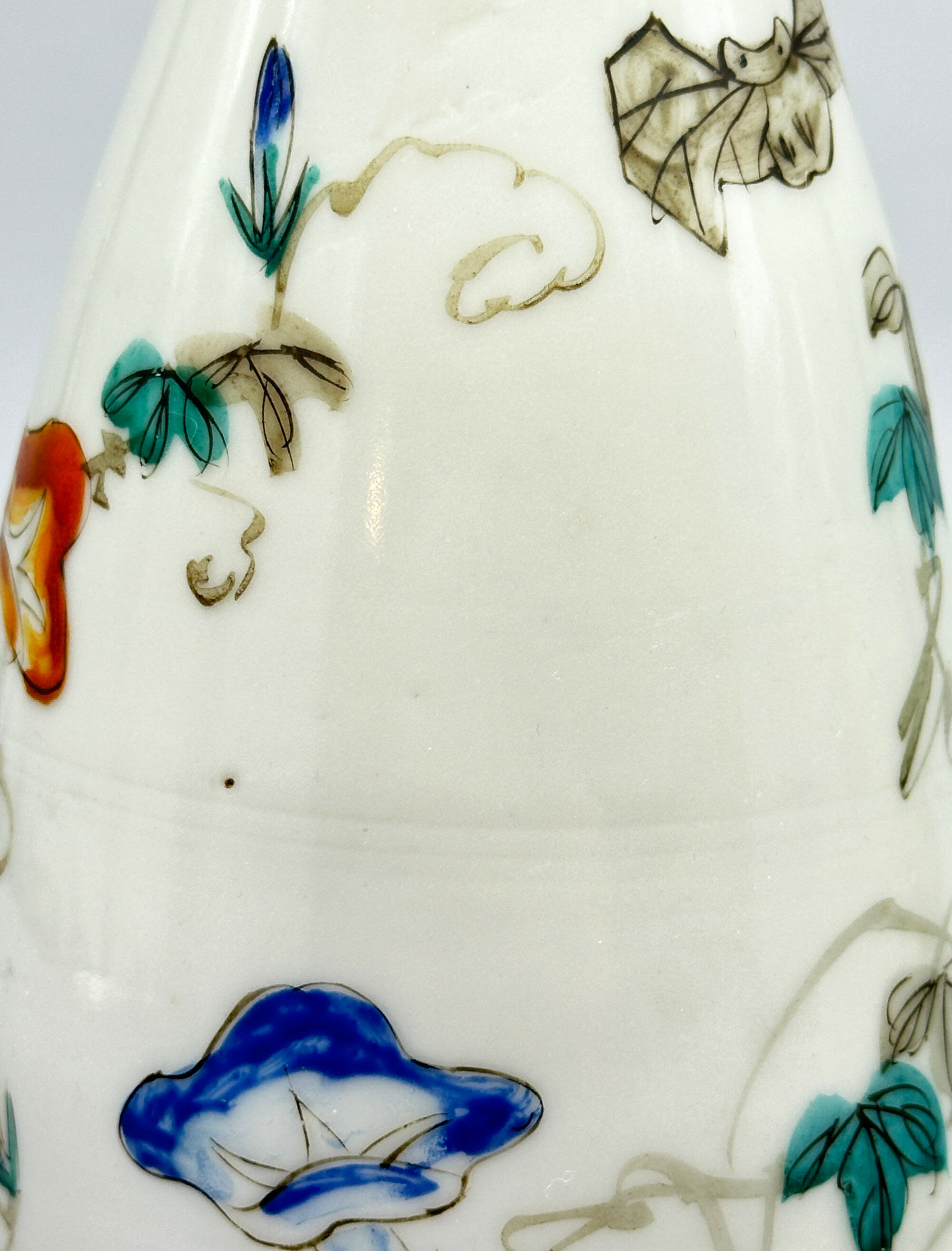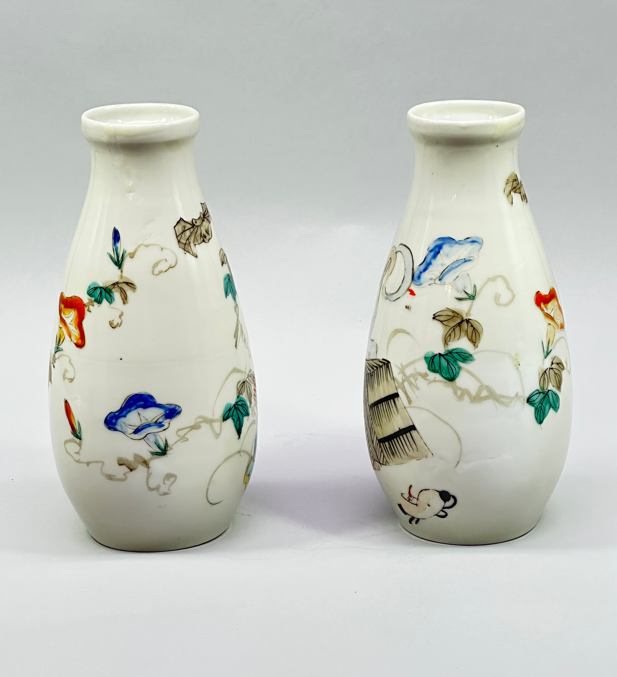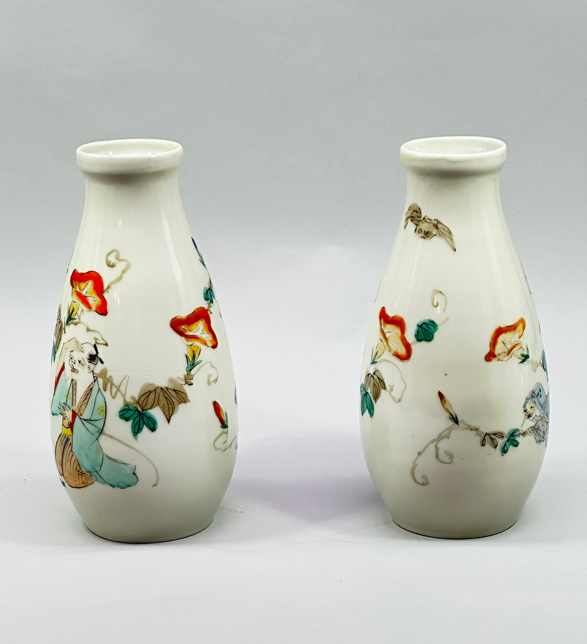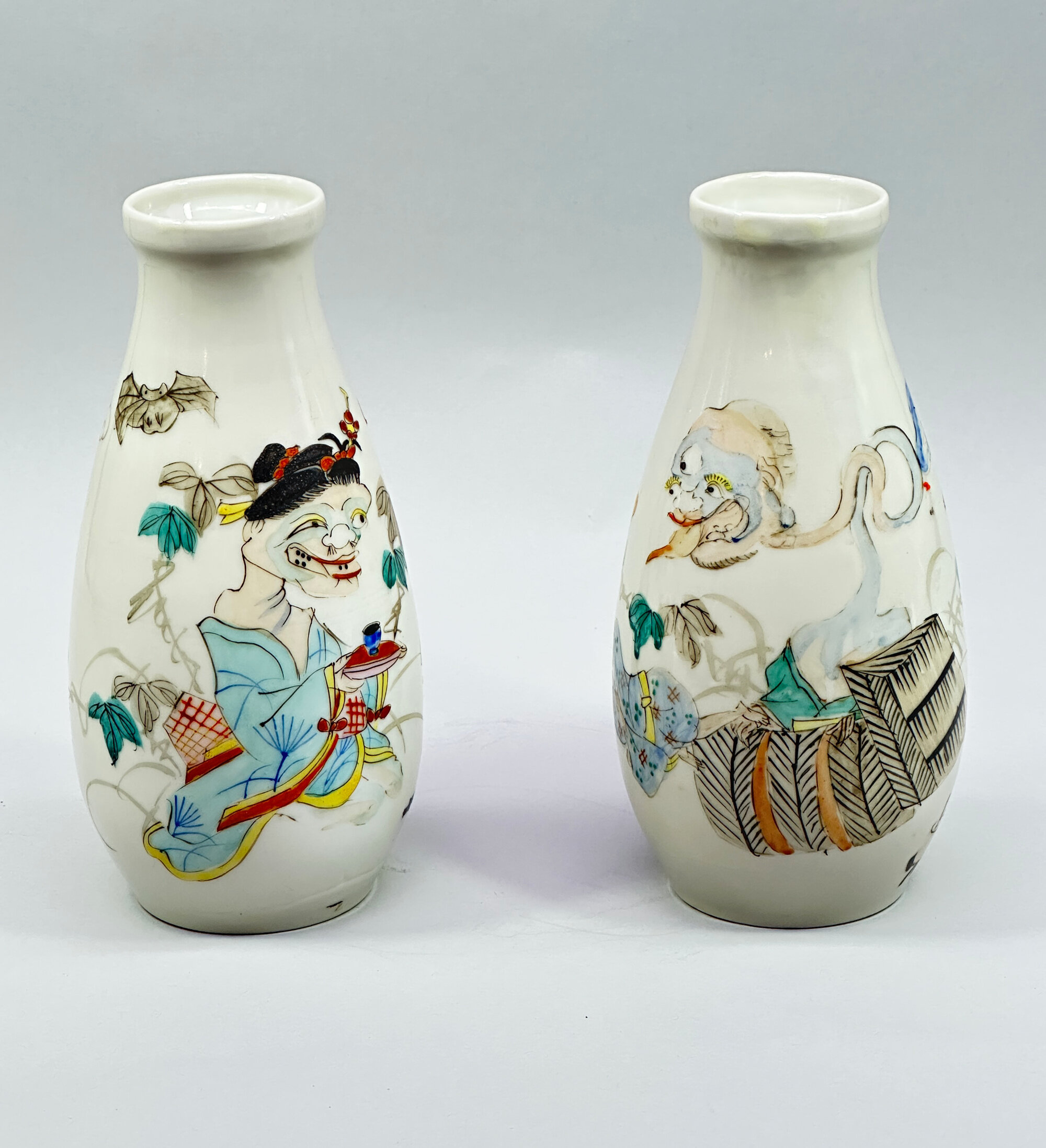 A pair of ceramic vases of tapering ovoid form with a galleried rim, decorated in polychrome enamels with complementary scenes of oni, or demons, one offering a drink on a cushion to a terrified attendant and the other in pursuit of a fleeing maiden whom he holds fast by her left leg, both with scrolling lotus to the reverse, the bases glazed white but not marked. Oni were a fundamental part of Japanese folklore and were often represented in art, usually with exaggerated bodies and sometimes with three eyes, as is the case with one of the demons here. There is more humour than terror in these images but the work cannot be attributed with certainty to any of the known ceramics factories and is best termed Arita from its use of a wide palette of colours. The paste of the foot rim, though, clearly indicates late nineteenth century work, presumably made for export to the West.| Size: | Ht 18.5cm, Top diam 4.8cm, Width (max) 8.5cm, Base 6.2cm |