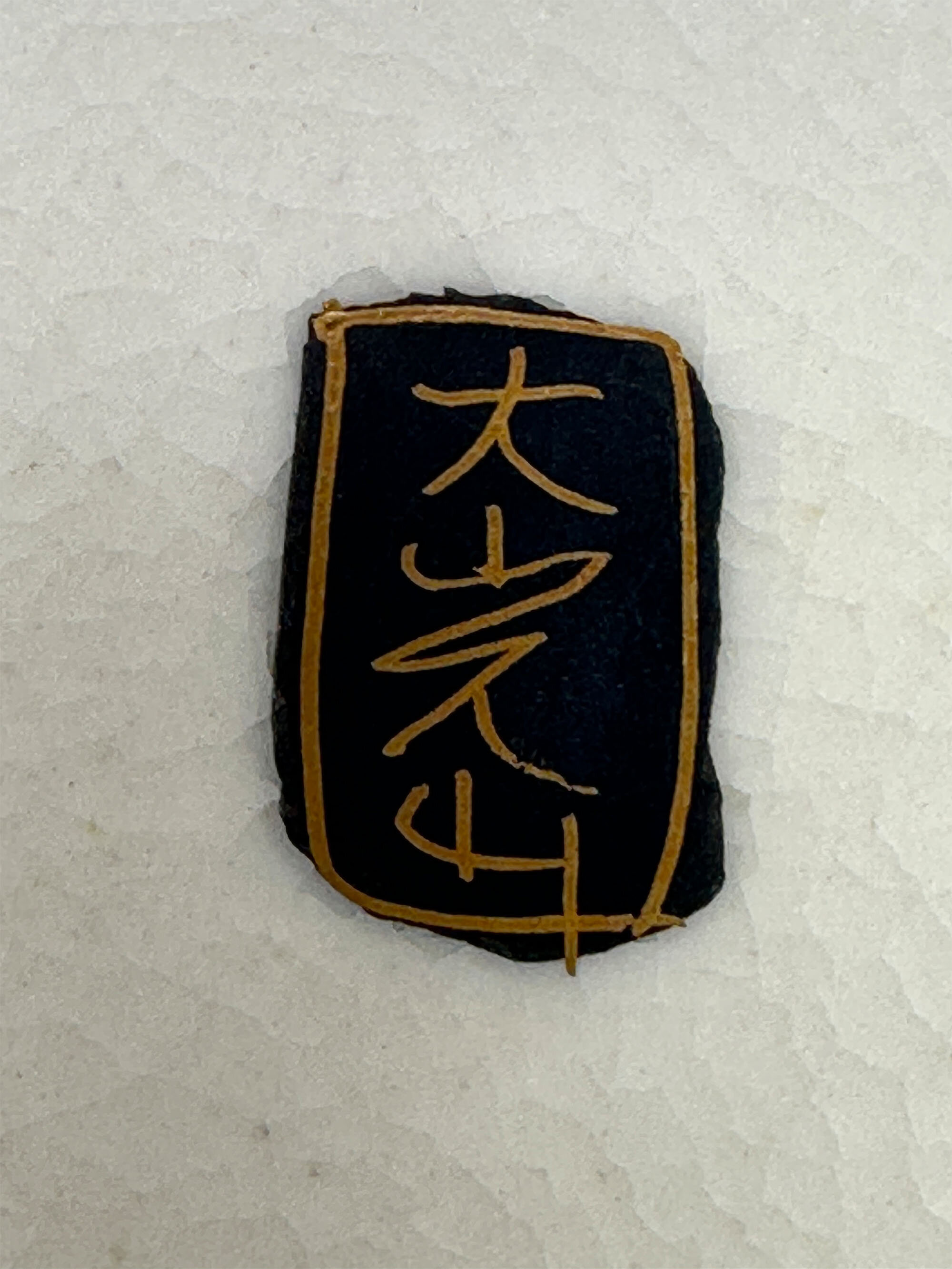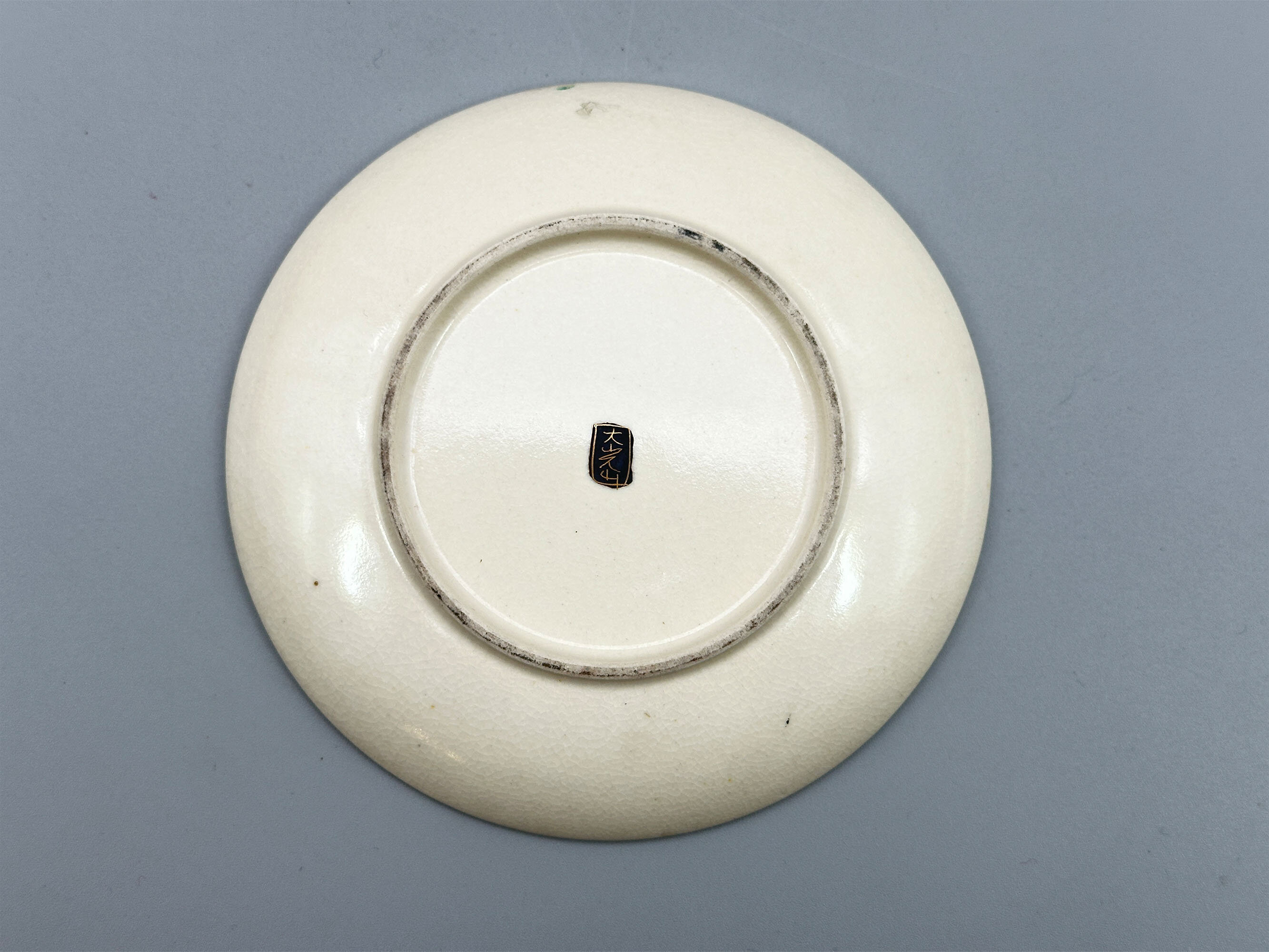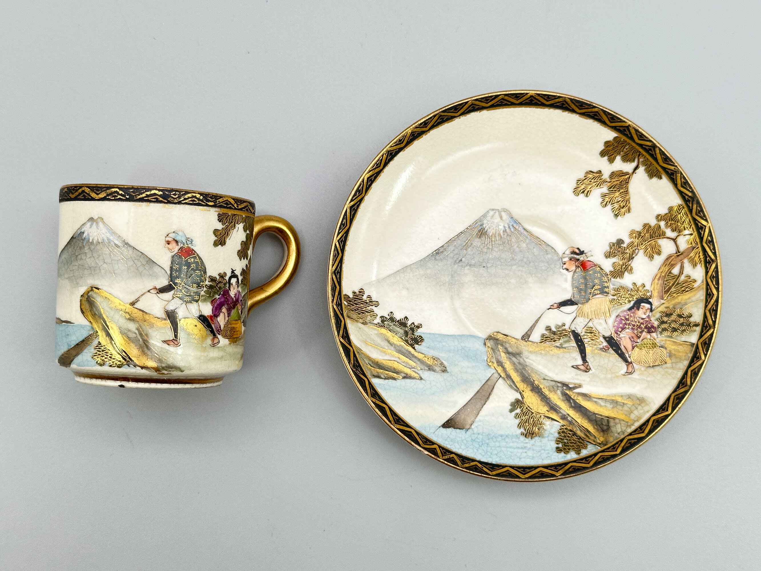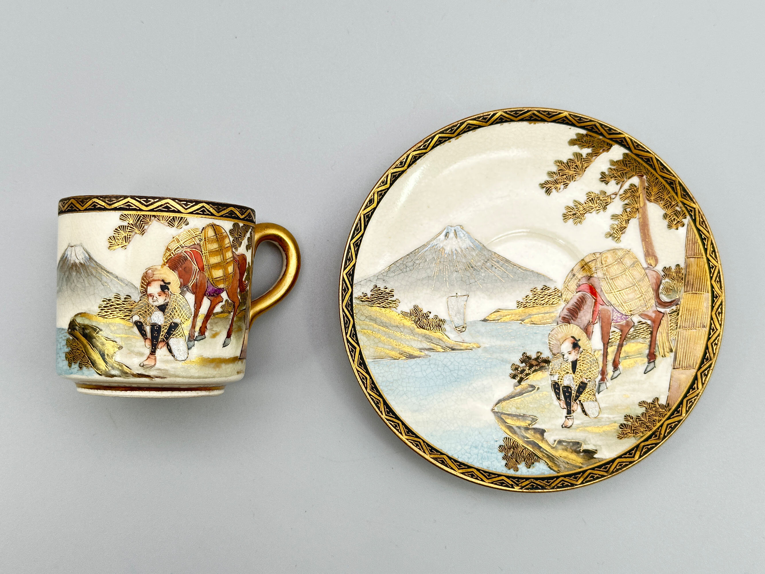 A set of six earthenware cups and saucers, the cups straight sided with loop handles and the saucers with an interior well, finely painted with six different genre landscape scenes, matching on each of the two pieces and within geometric pattern black and gilt borders, in a palette of colours emphasising browns, grisaille and gilt, on a cream ground with a very fine craquelure glaze which is repeated on the reverse of the saucers and the base of the cups, all twelve with a small central mark of three gilt characters on a black ground. The style of decoration here is that of the workshops from the province of Satsuma who produced a wide range of pieces, some of exhibition quality, for export to the West in the late nineteenth and early twentieth centuries. While not by one of the best known artists, these cups and saucers are of very high quality and the identity of their maker, which unfortunately cannot be established at present, is probably contained in the signatures. The detail of the painting speaks for itself and all six scenes feature Mount Fuji in the background with a lake in front with figures on the bank engaged in a variety of activities including one scene of a figure contemplating the mountain itself - the artistry is sometimes combined with a wry sense of humour. While most likely part of a larger tea service, these six cups and saucers may possibly have been intended just as cabinet display pieces. Certainly, they could fulfil that function now. Dating is probably to the early twentieth century and within the Taisho period (1912-1926).| Size: | Saucers : Width 12cm, Ht 1.6cm, Base 7cm Cups : Ht 5.5cm, Width (max) 7.5cm, Top diam 5.5cm, Base 4.2cm |