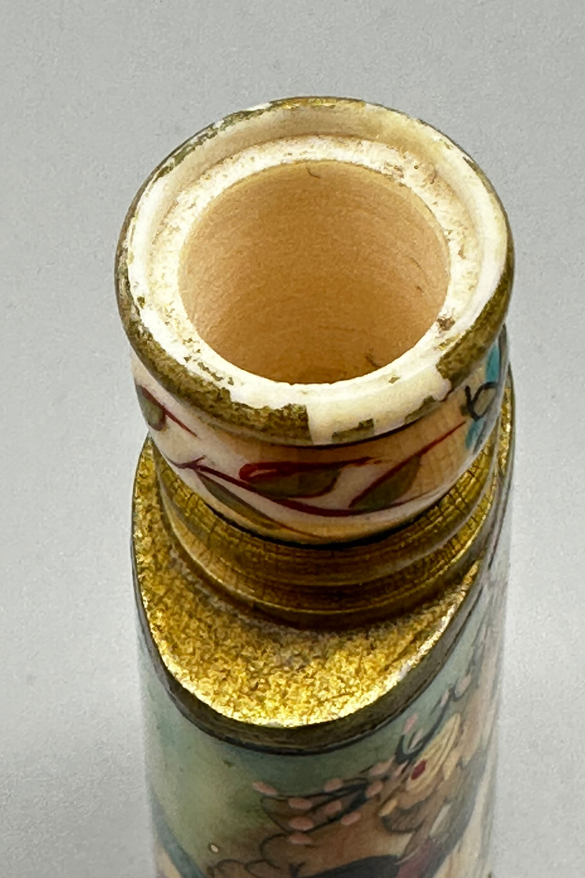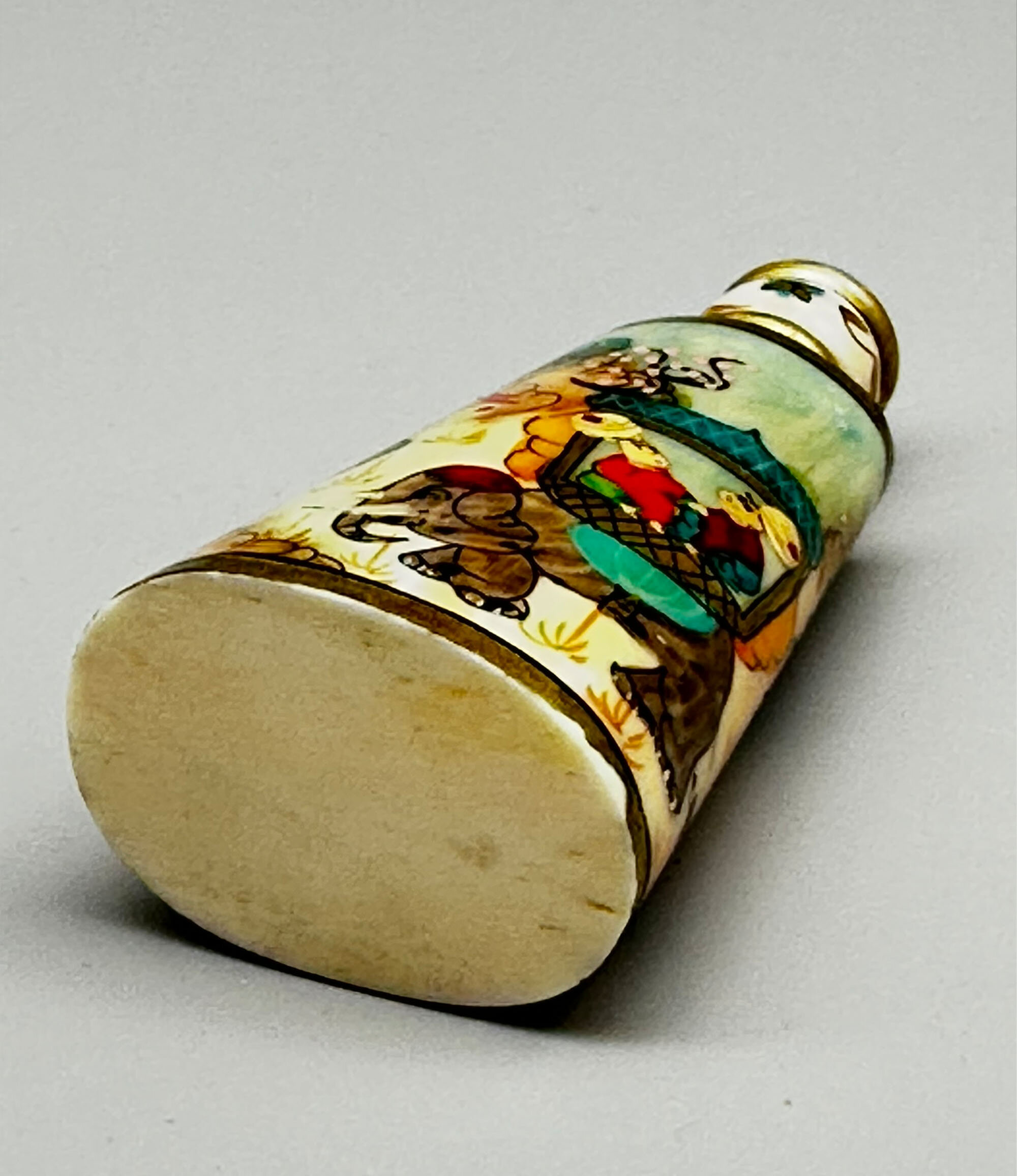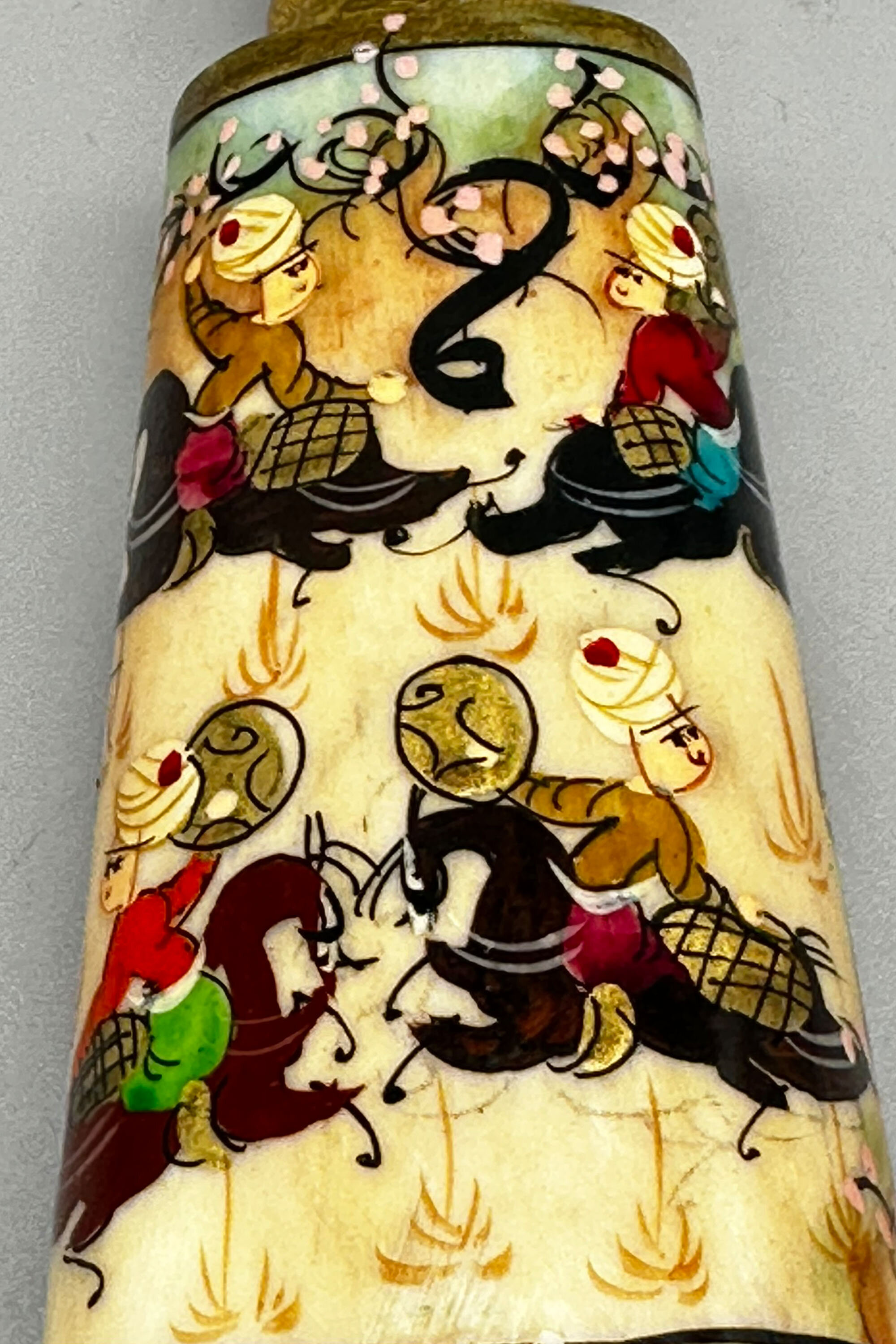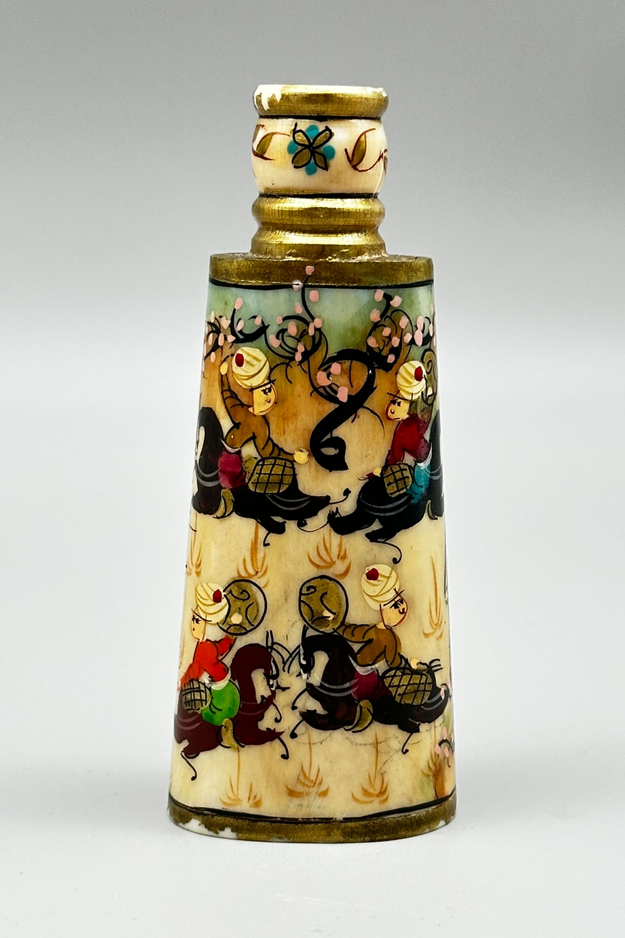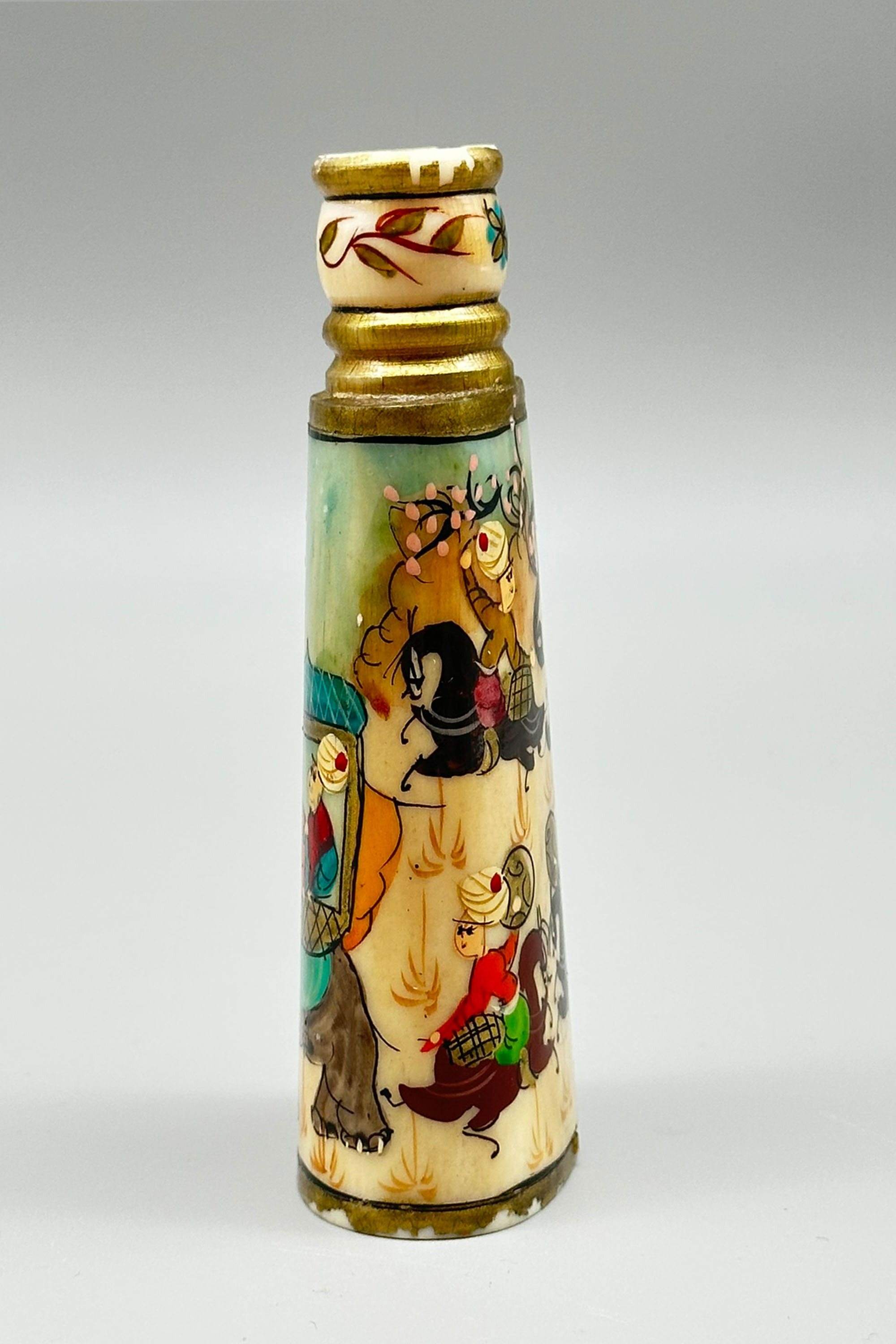 A bone perfume bottle, the flattened ovoid body tapering towards the top with a ridged circular neck, amusingly painted in bright colours with a continuous scene of dignitaries in a howdah borne by an elephant surrounded by attendants riding elephants, the neck with gilt and stylised floral decoration. These perfume bottles seem to be early twentieth century work made in Turkey and recalling, in a rather sketchy fashion (here nearly literally so) art from the earlier years of the Ottoman empire. The bone is said to be camel, but this may be apocryphal. Originally the bottle would have been fitted with a cover with a wand below and perhaps with a tall slender knob as is seen on other pieces, but the lack of this here should not detract too much from an attractive example of the genre with its colourful and spirited scenes.| Size: | Ht 11cm, Width (max) 4.5cm, Depth (max) 3cm, Top diam 1.8cm |
