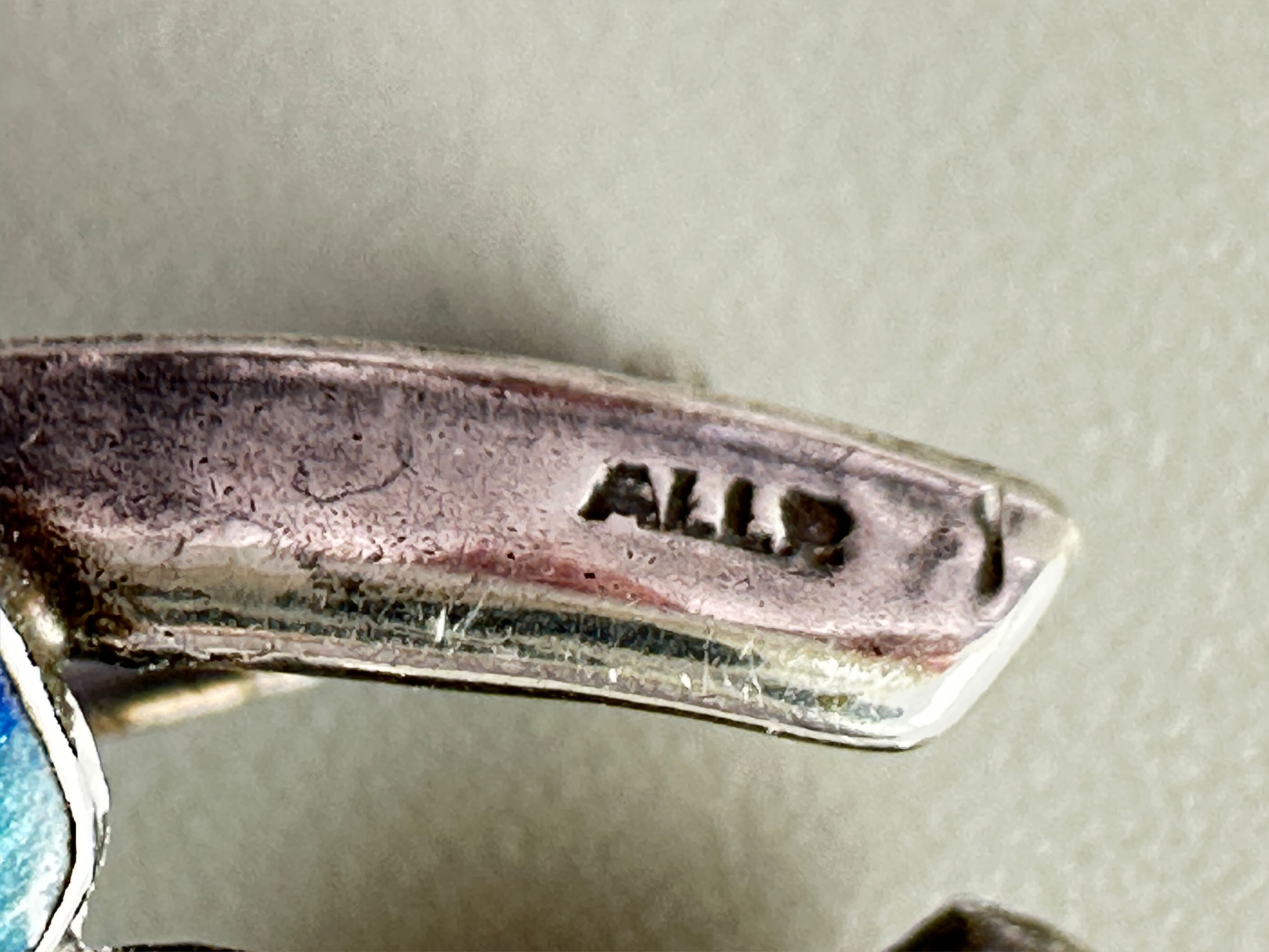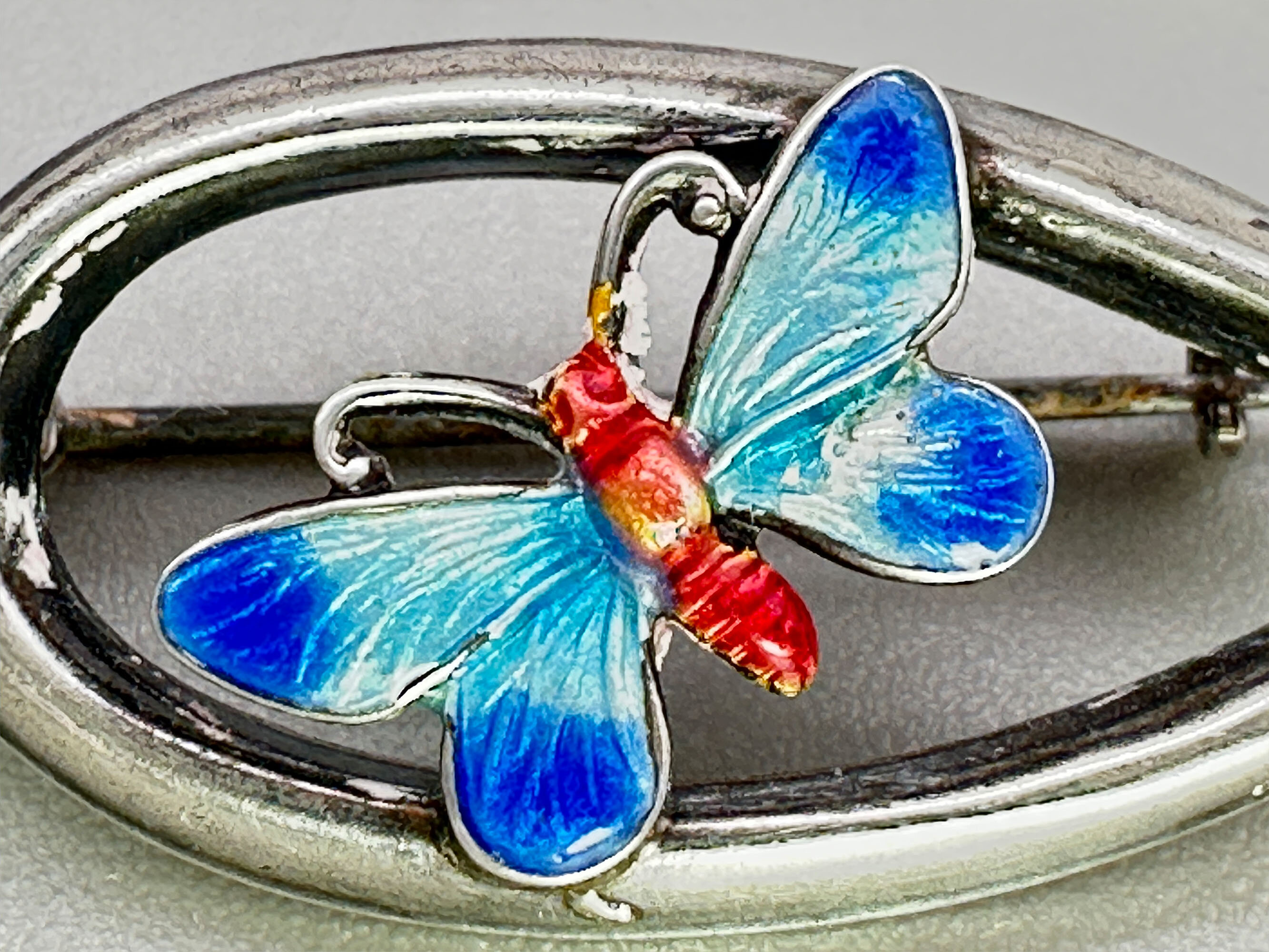 This is a very dainty silver brooch thta has a enamel butterfly within what appears to be a stirrup. It is marked ALLB with a dog so is most likely French.| Size: | 30.6 x 15.7 mm |