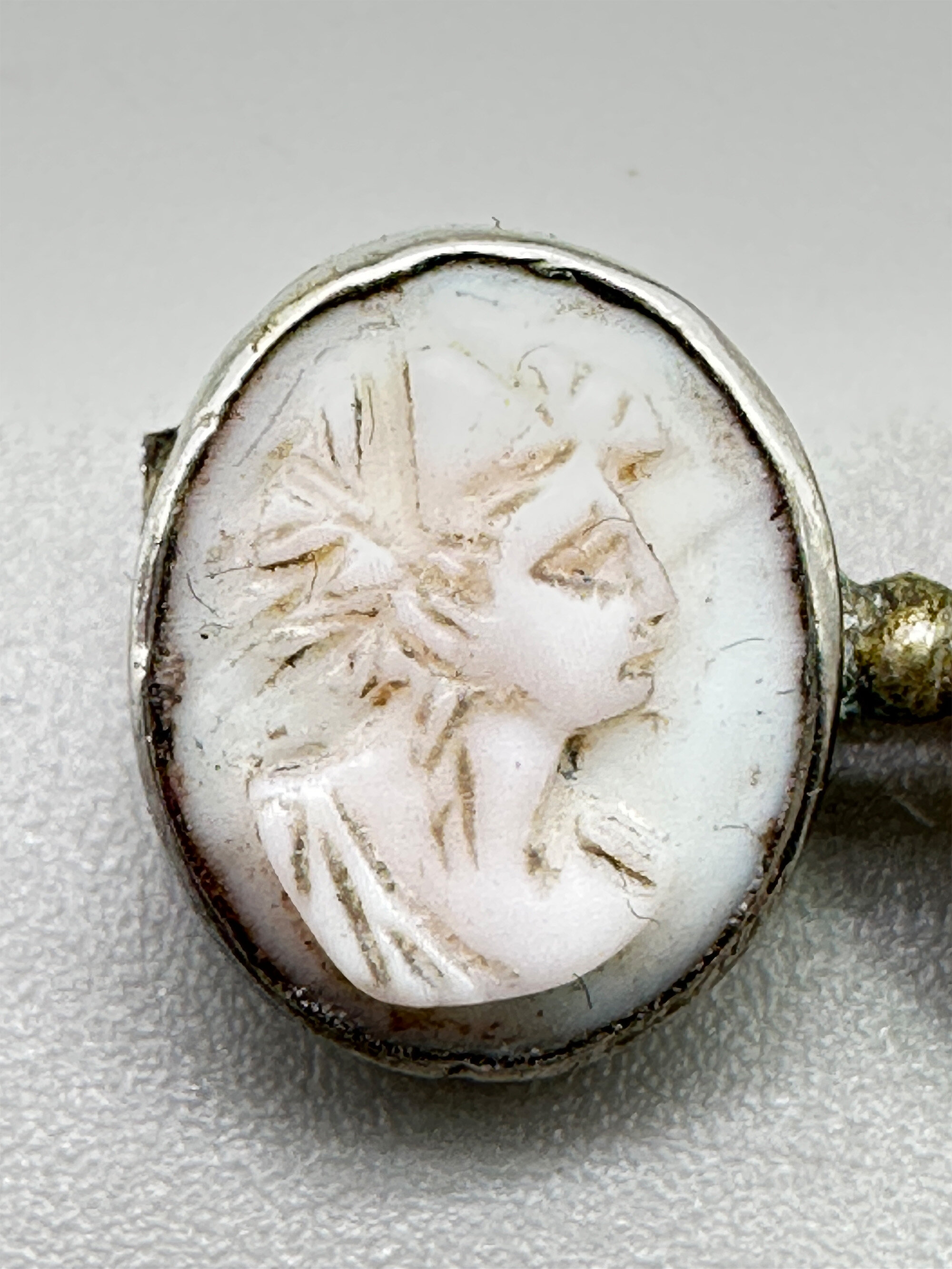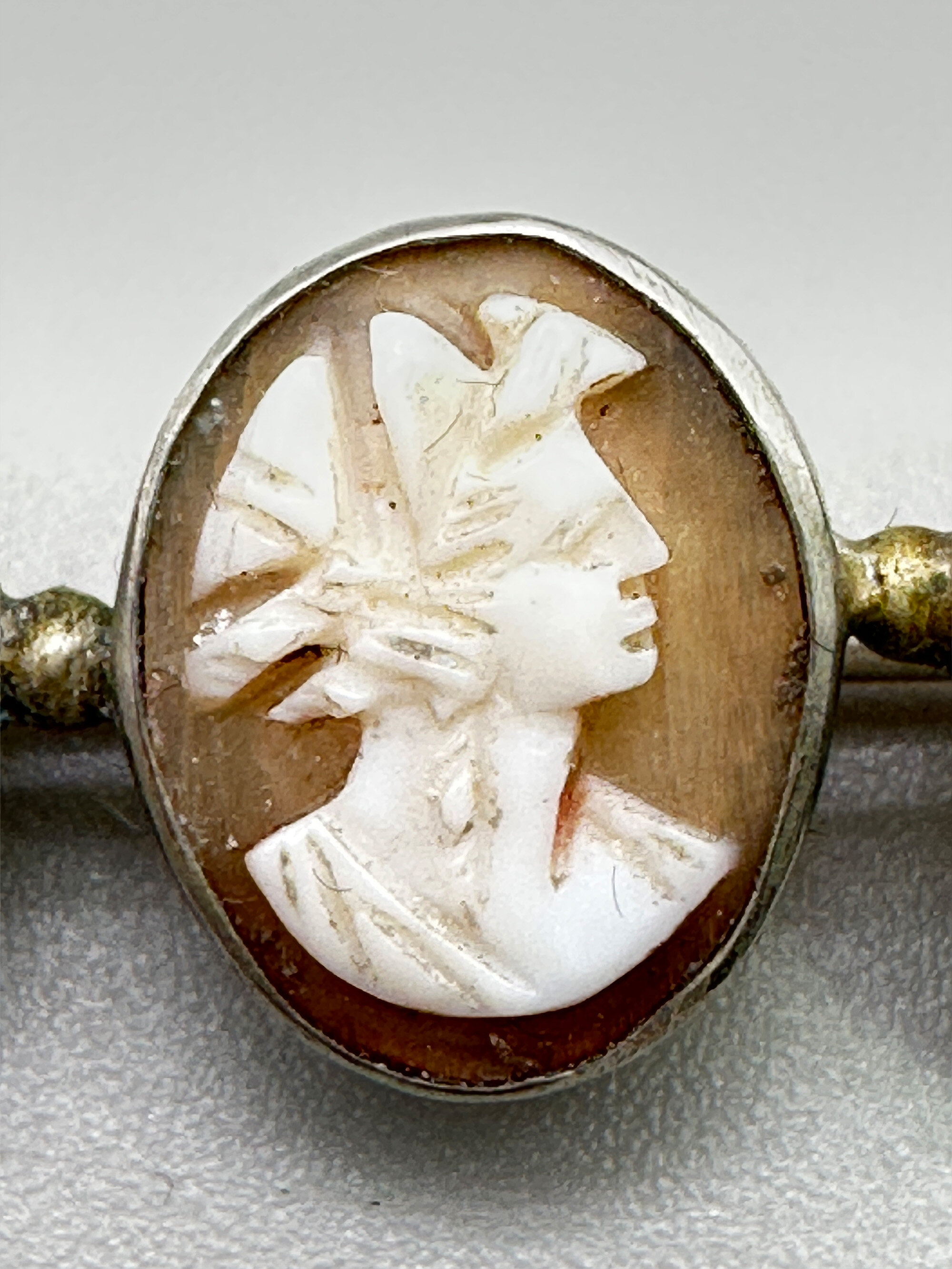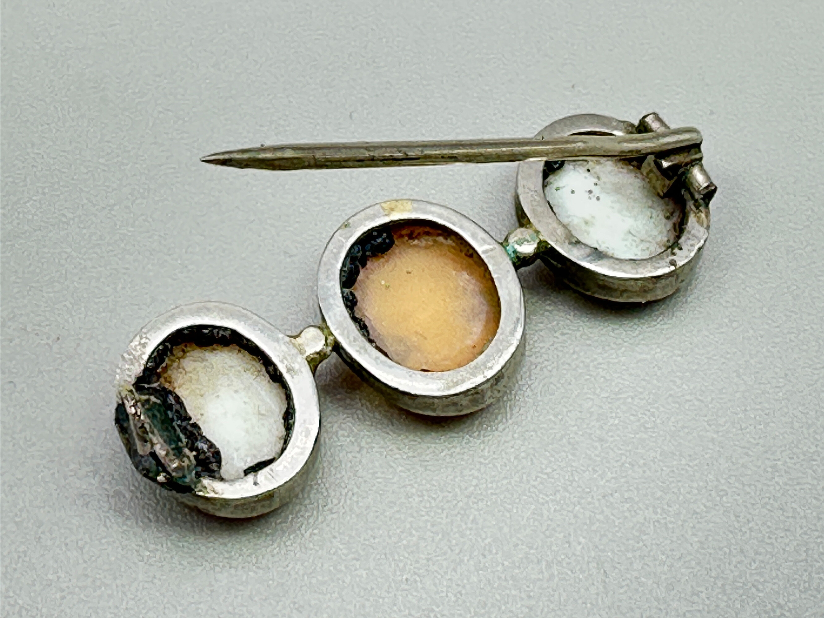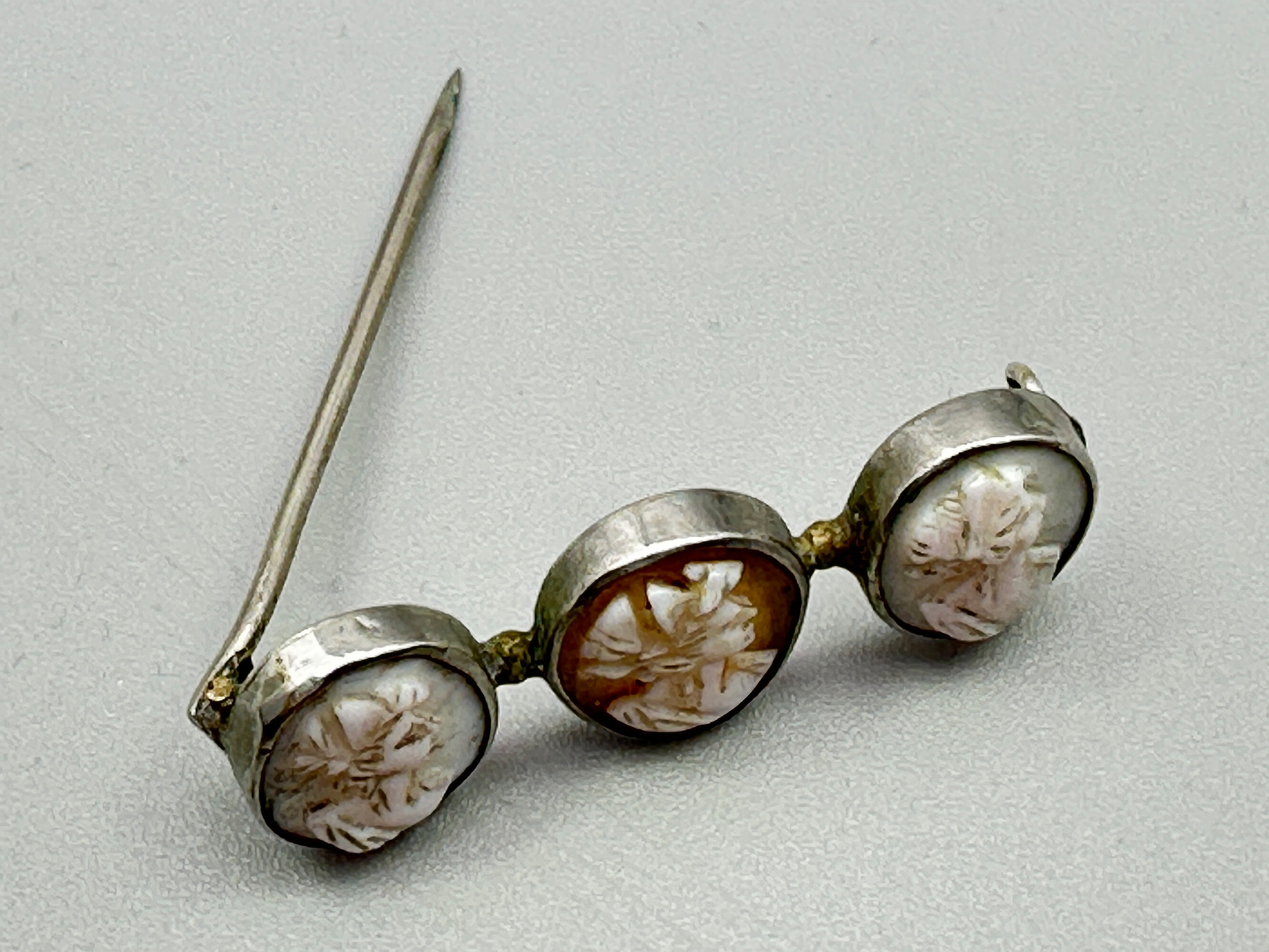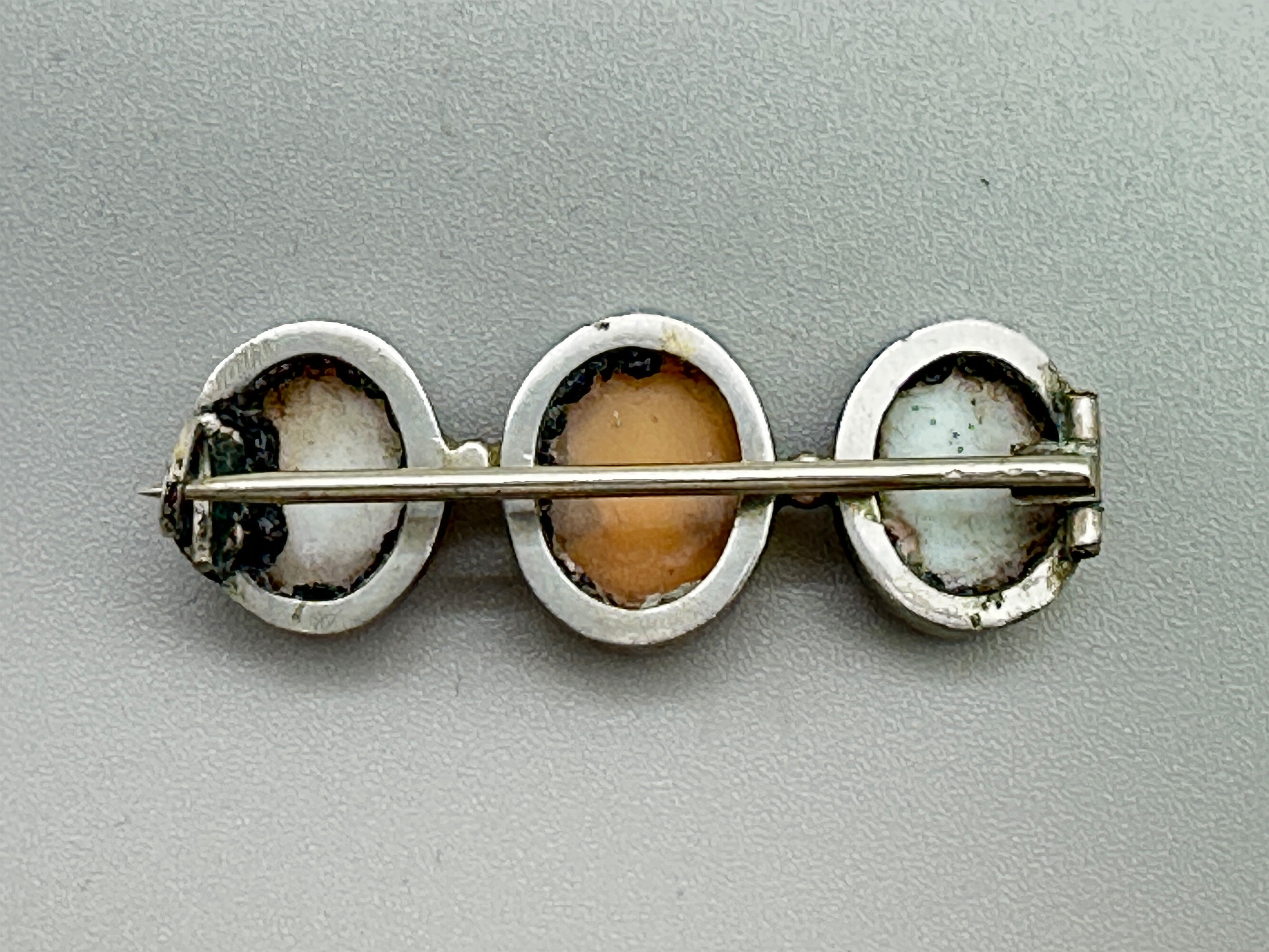This is a very lovely small brooch comprising three portrait shell cameo set in silver. It is unmarked. There is an old repair to the hinge.| Size: | 38.2 x 14.2 mm |