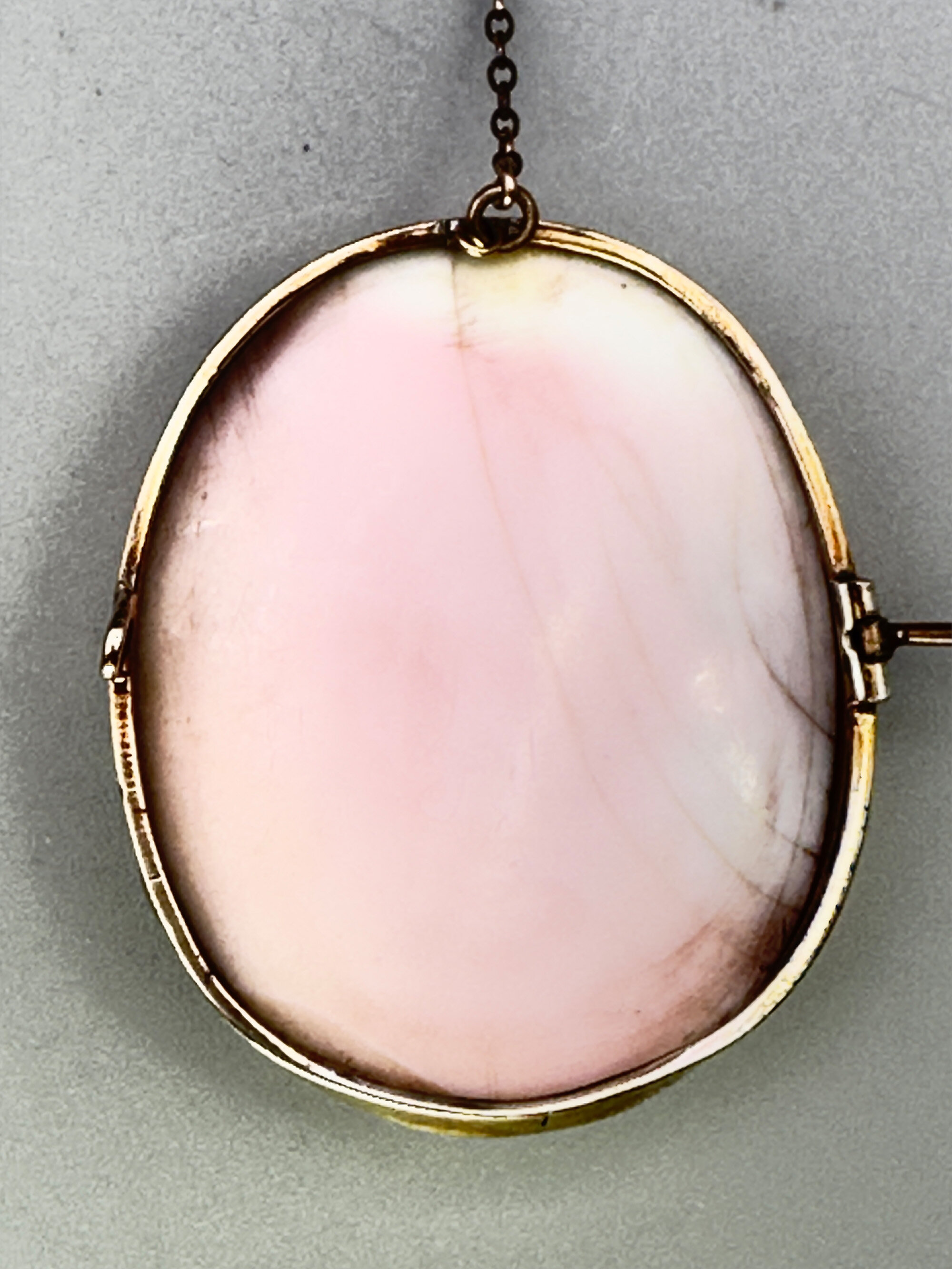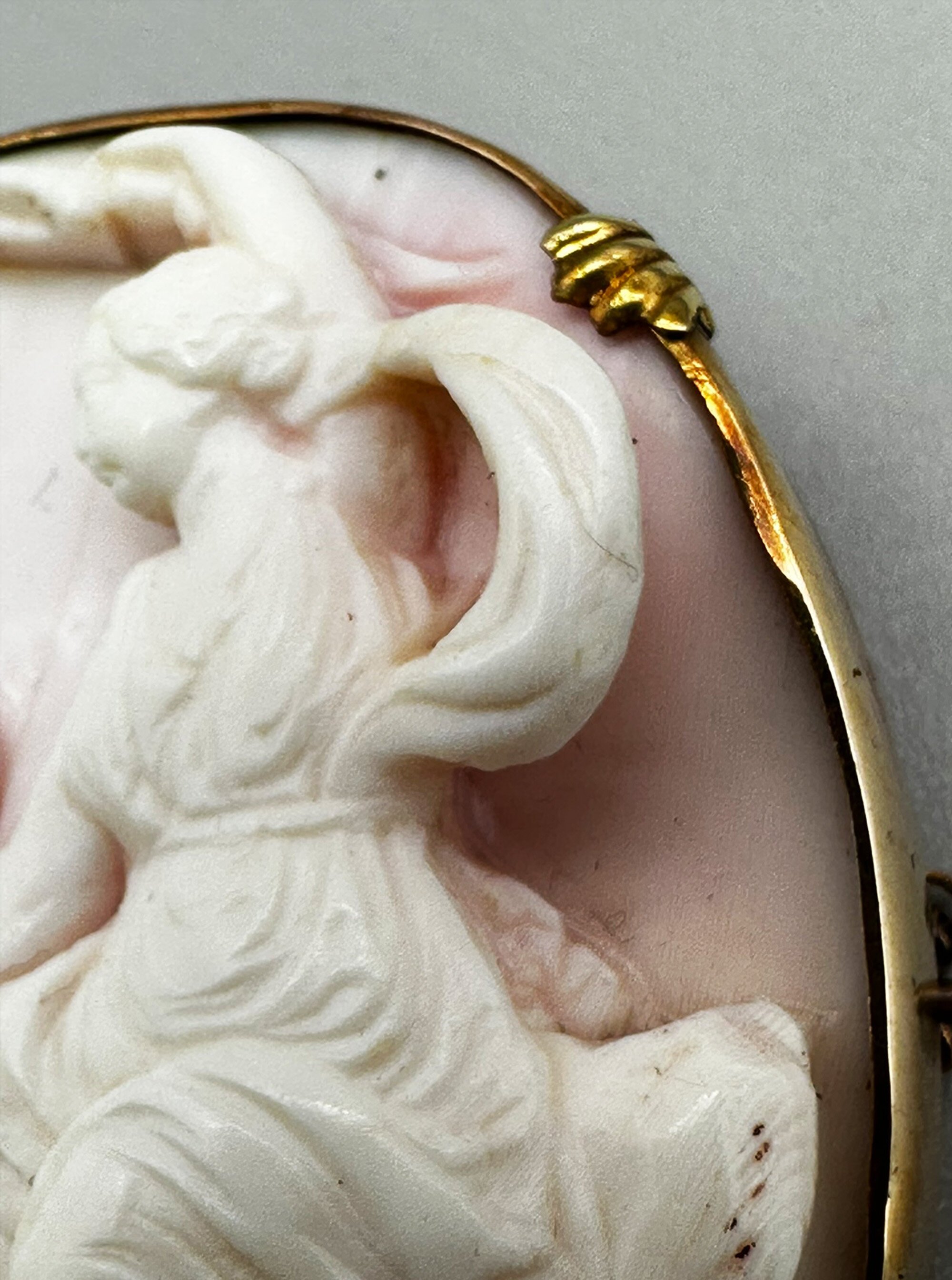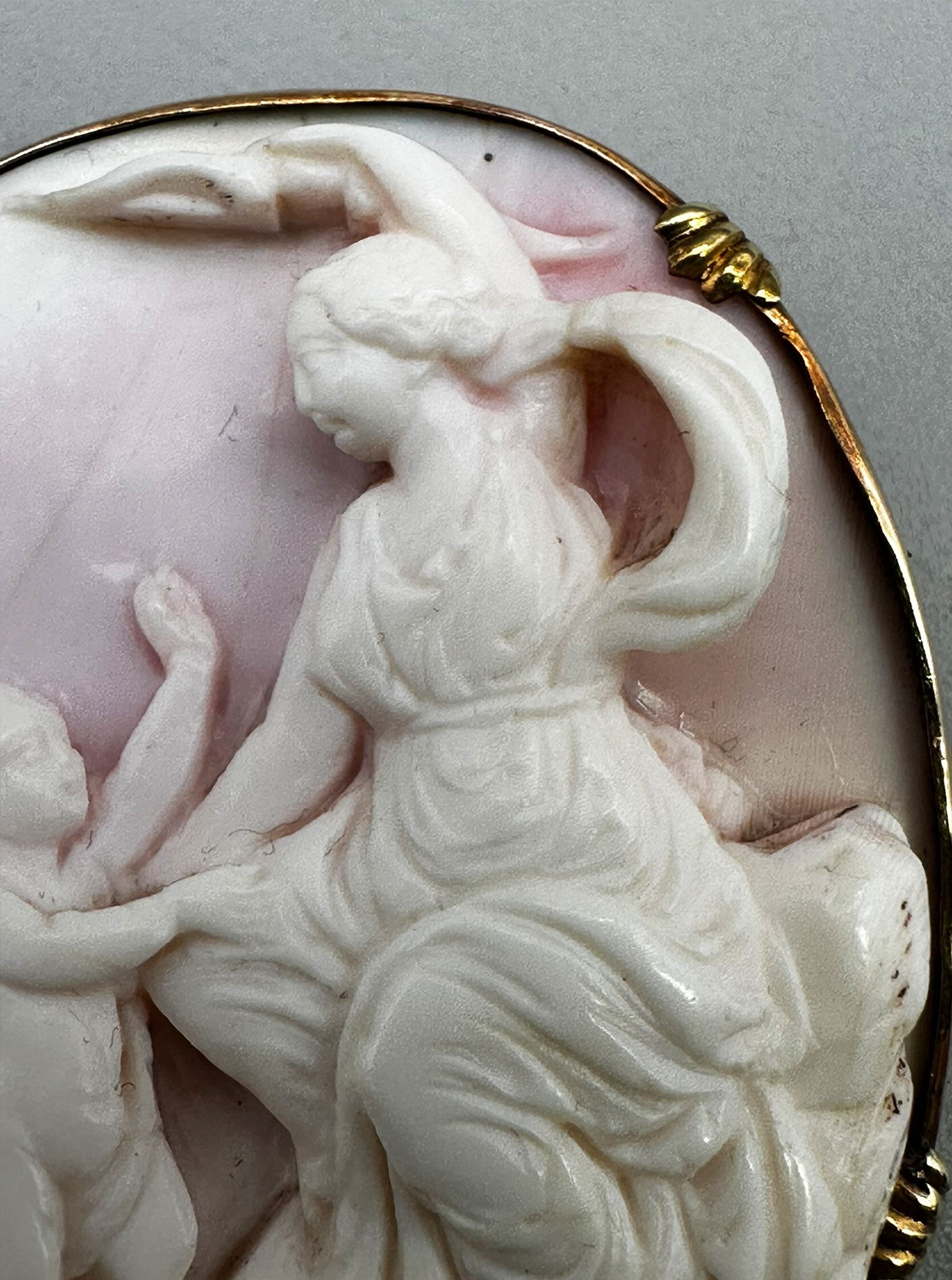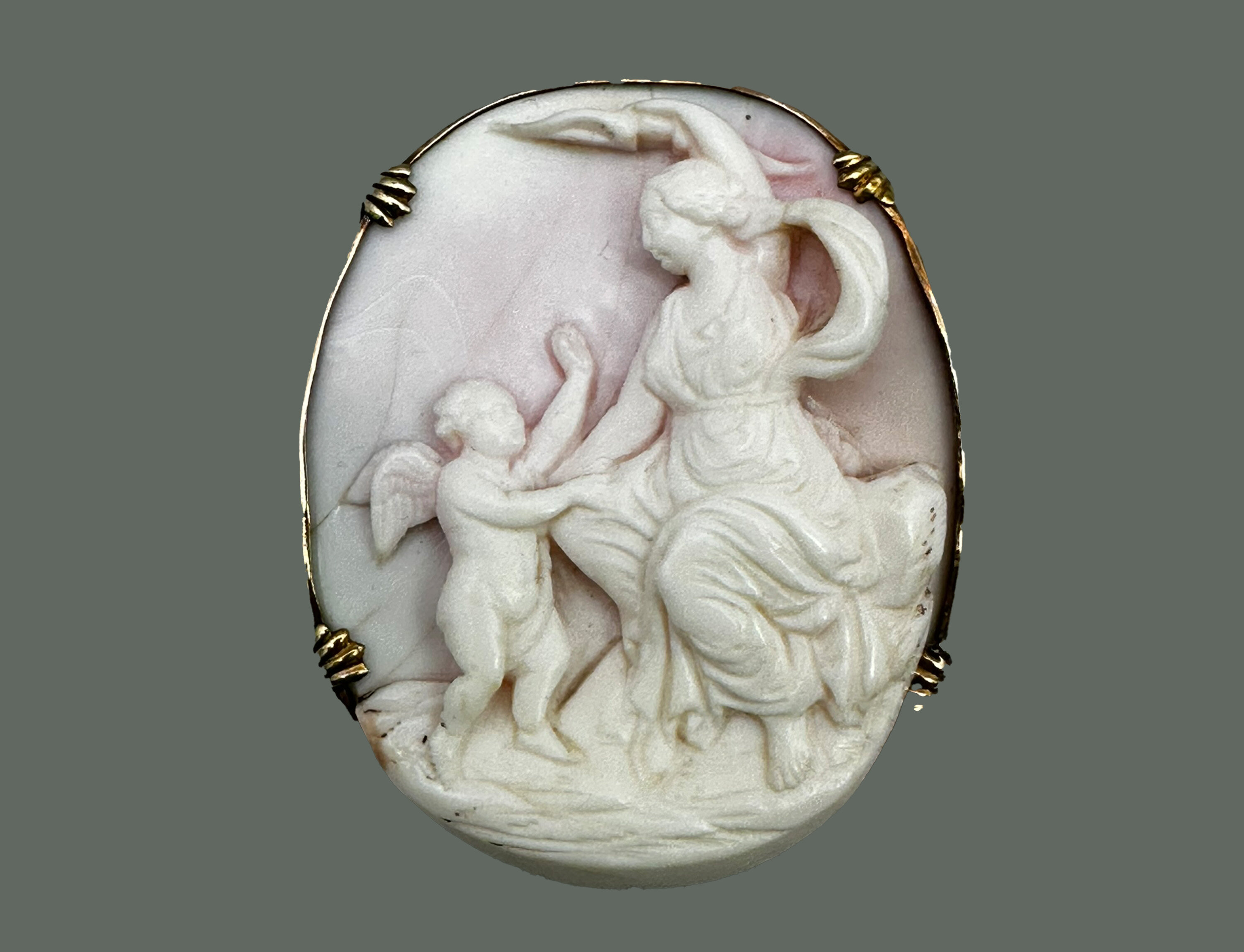 This is a very rare brooch that features high relief plaque carved from angel skin coral. It depict a maiden with a cherubic figure attending her. This scene symbolises love in classical motifs. This is carved from a large piece of pale coral and is mounted in rolled gold. It is unmarked and has safety chain.| Size: | 48 x 39.5 x 12.4 mm |